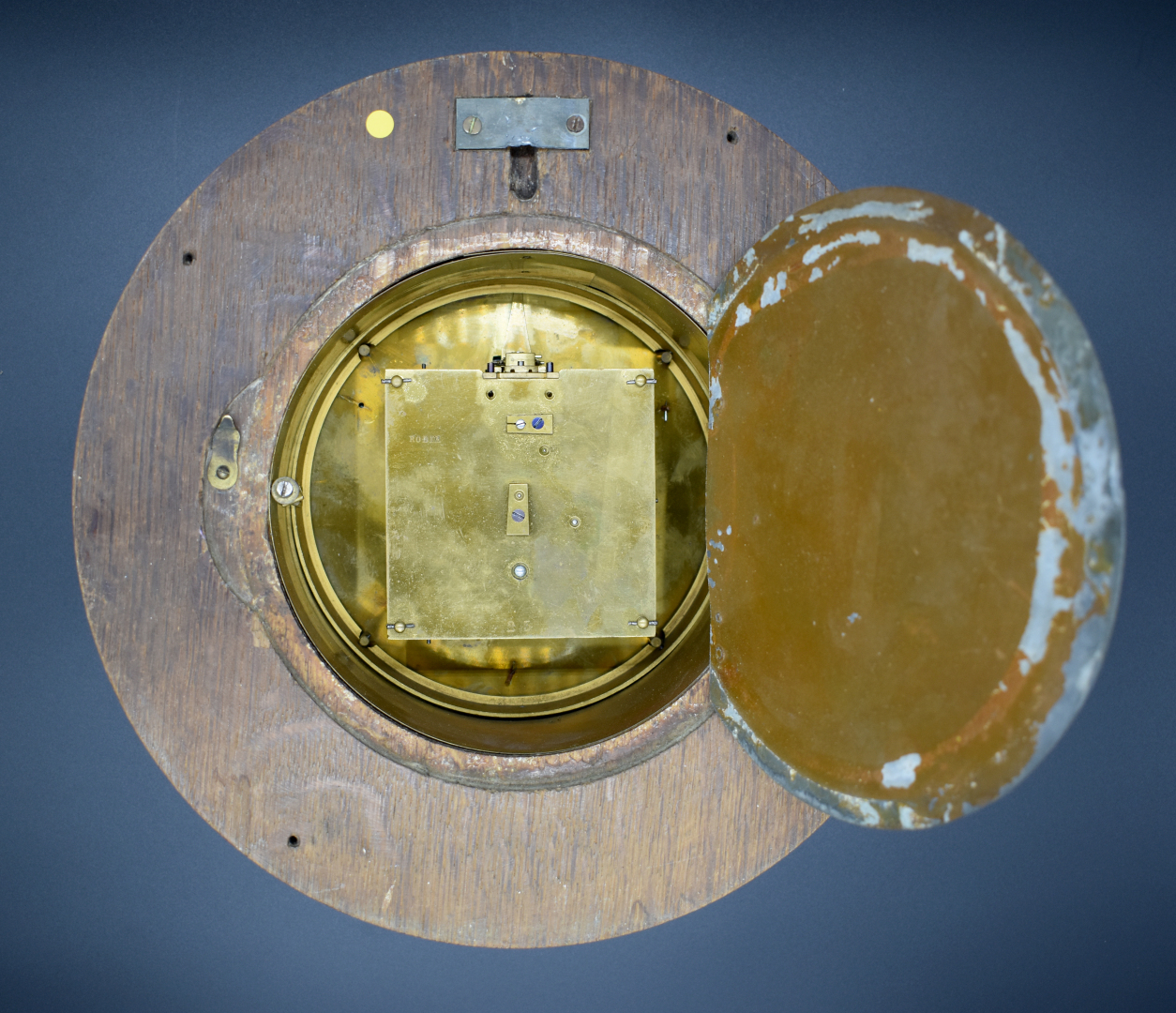 Pendule de pharmacie à socle de bois circulaire. Cadran signé Robin à chiffres romains pour les heures.