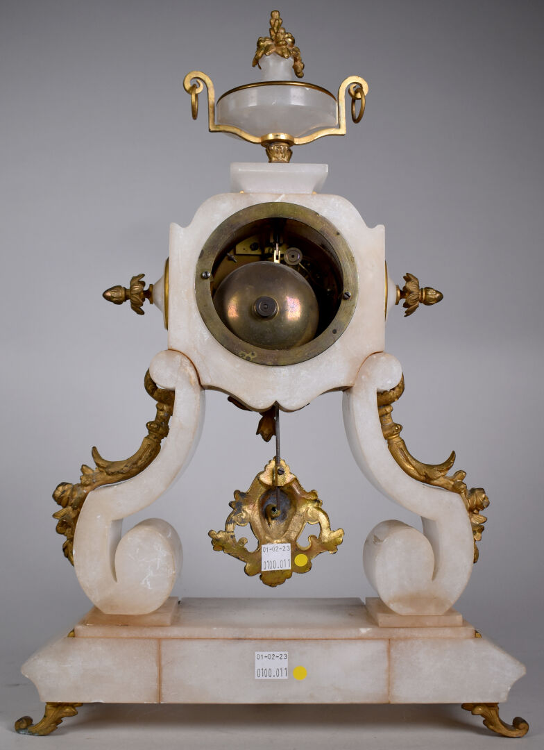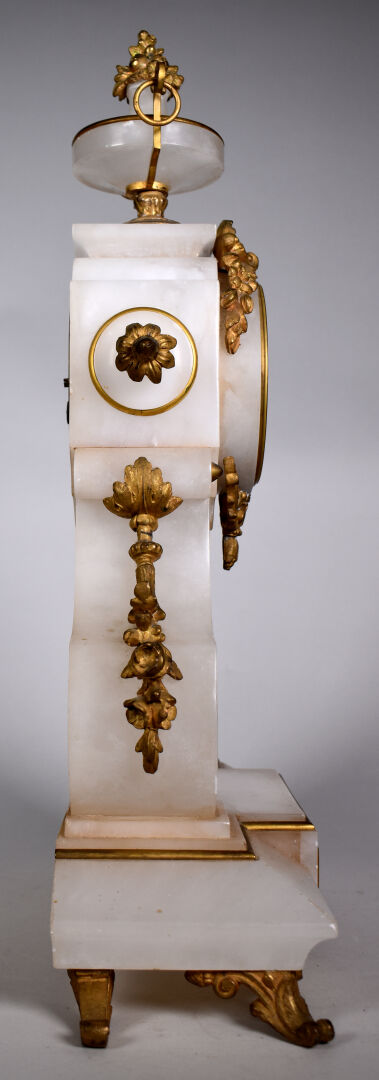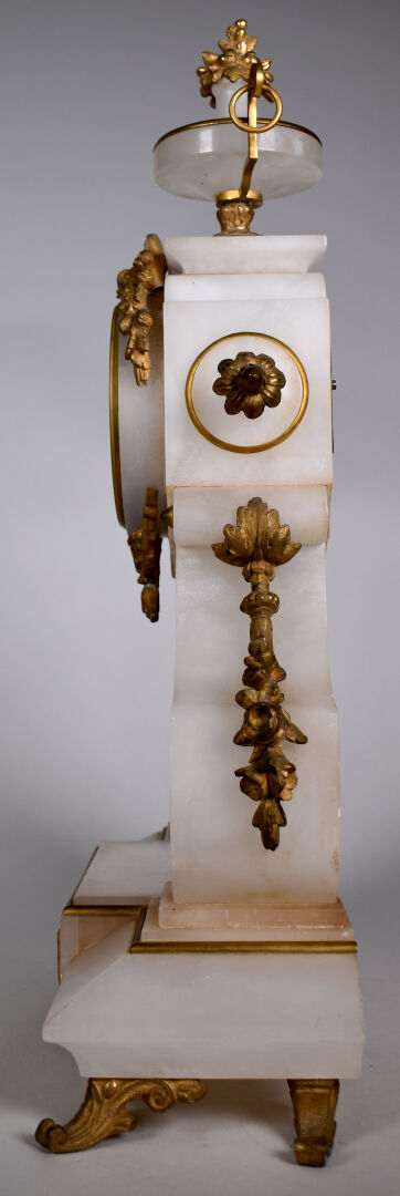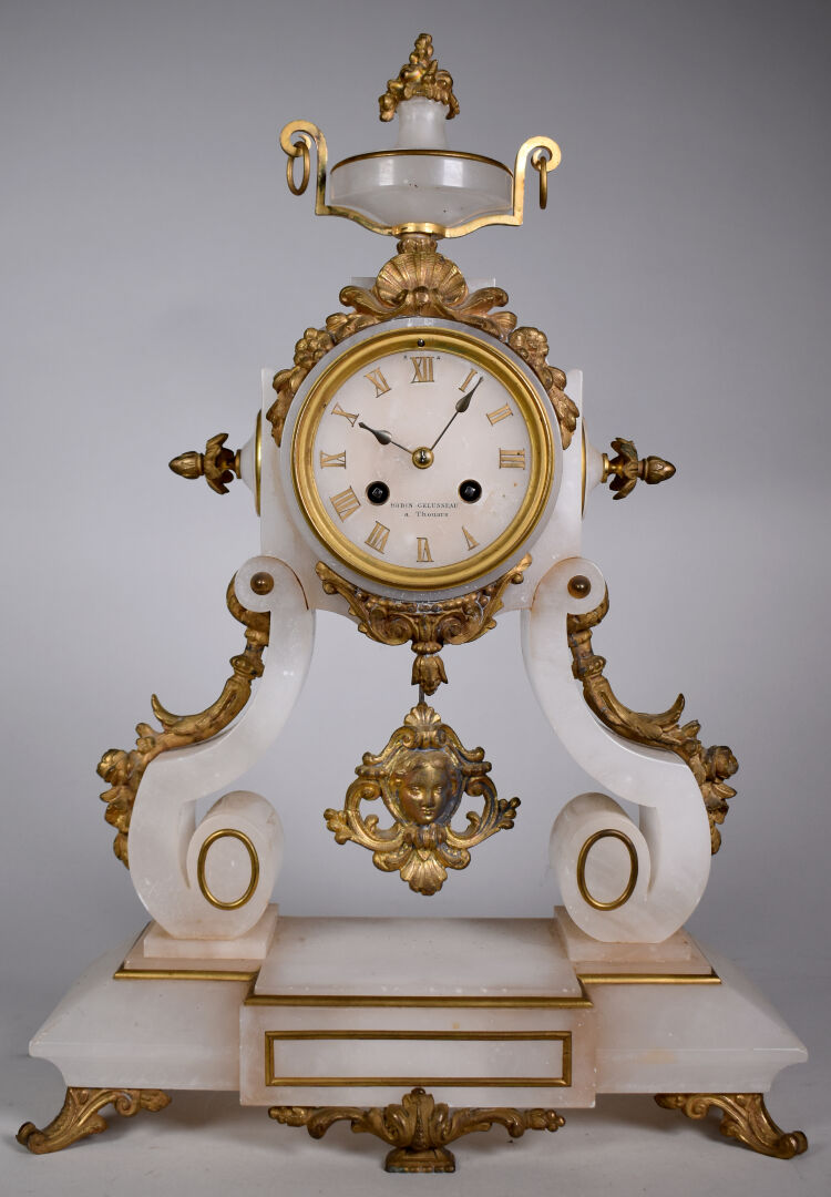 Pendule en albâtre, laiton et bronze doré, le cadran à chiffres romains signé BODIN GELUSSEAU à Thouars (manque le chiffre IV), (petites égrenures). Vers 1900. Haut. : 47 cm.