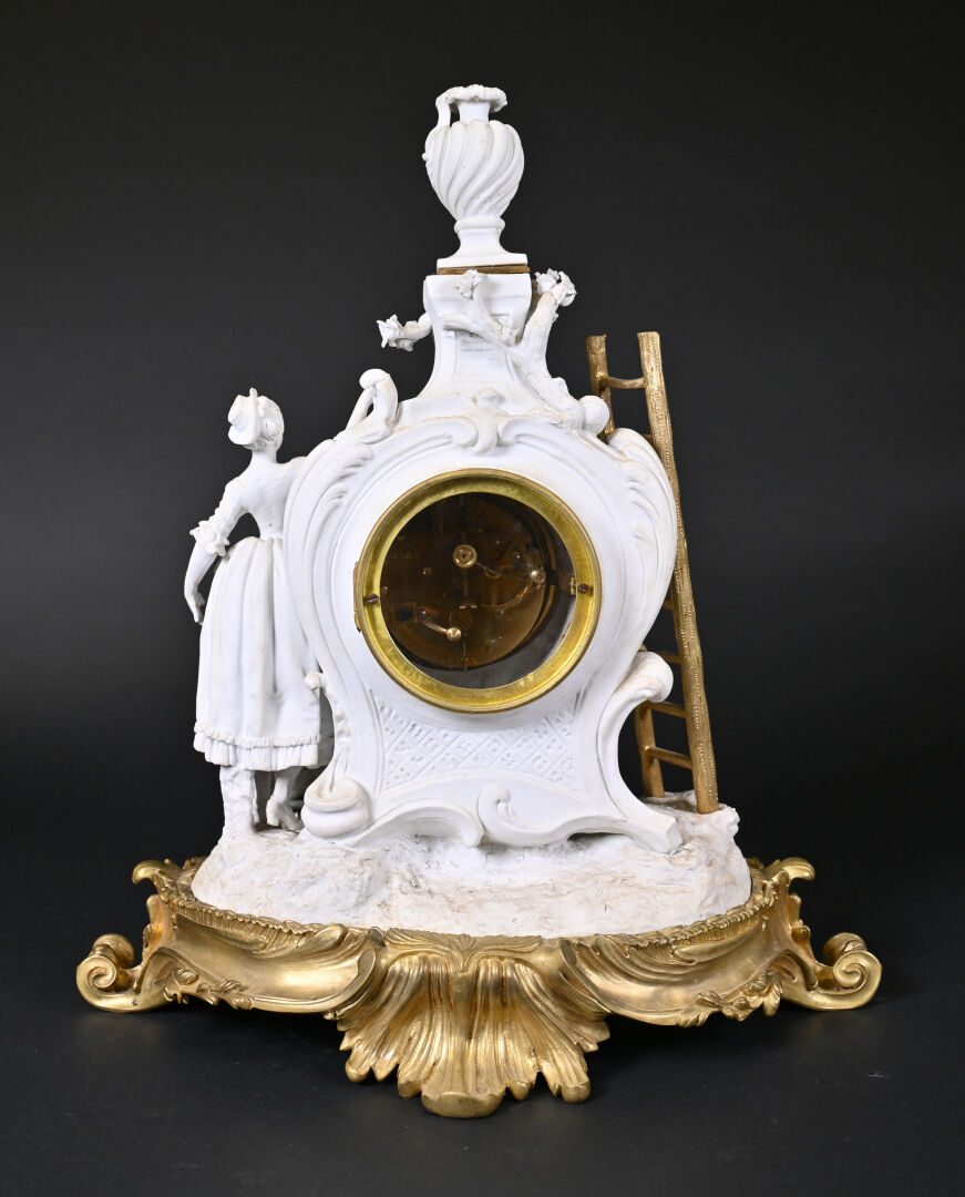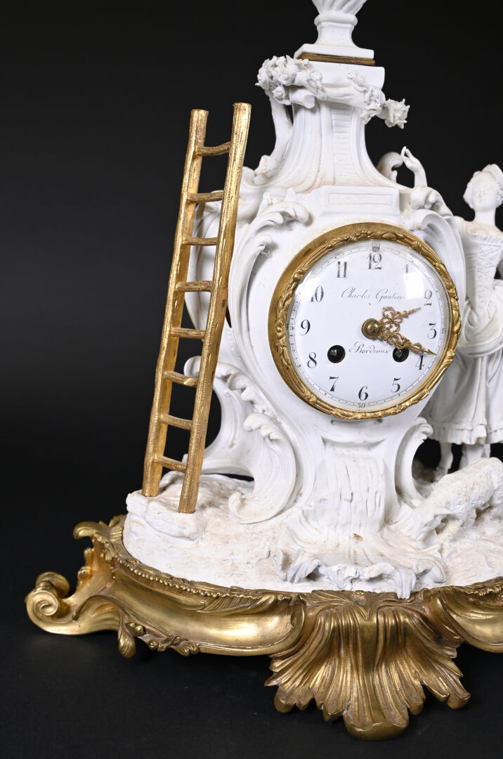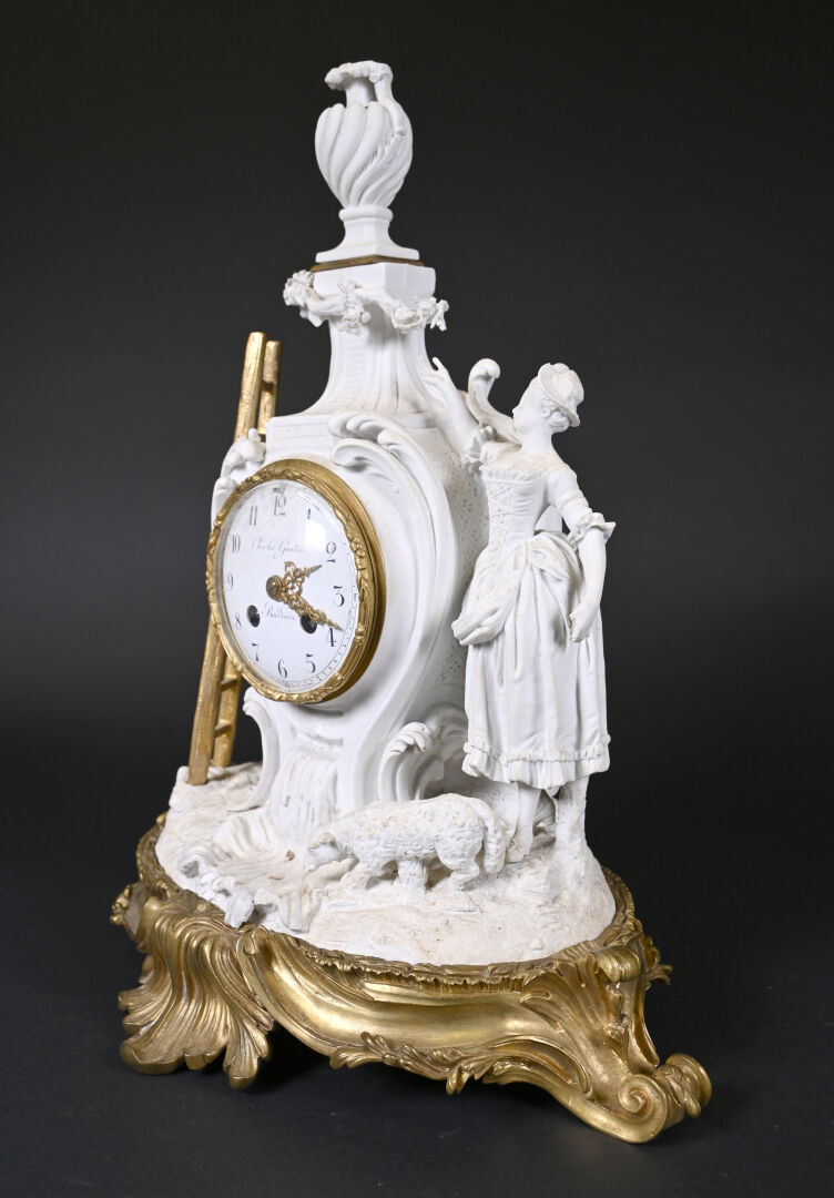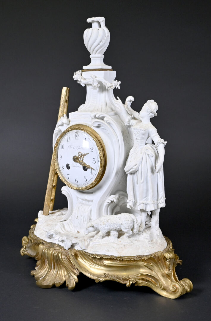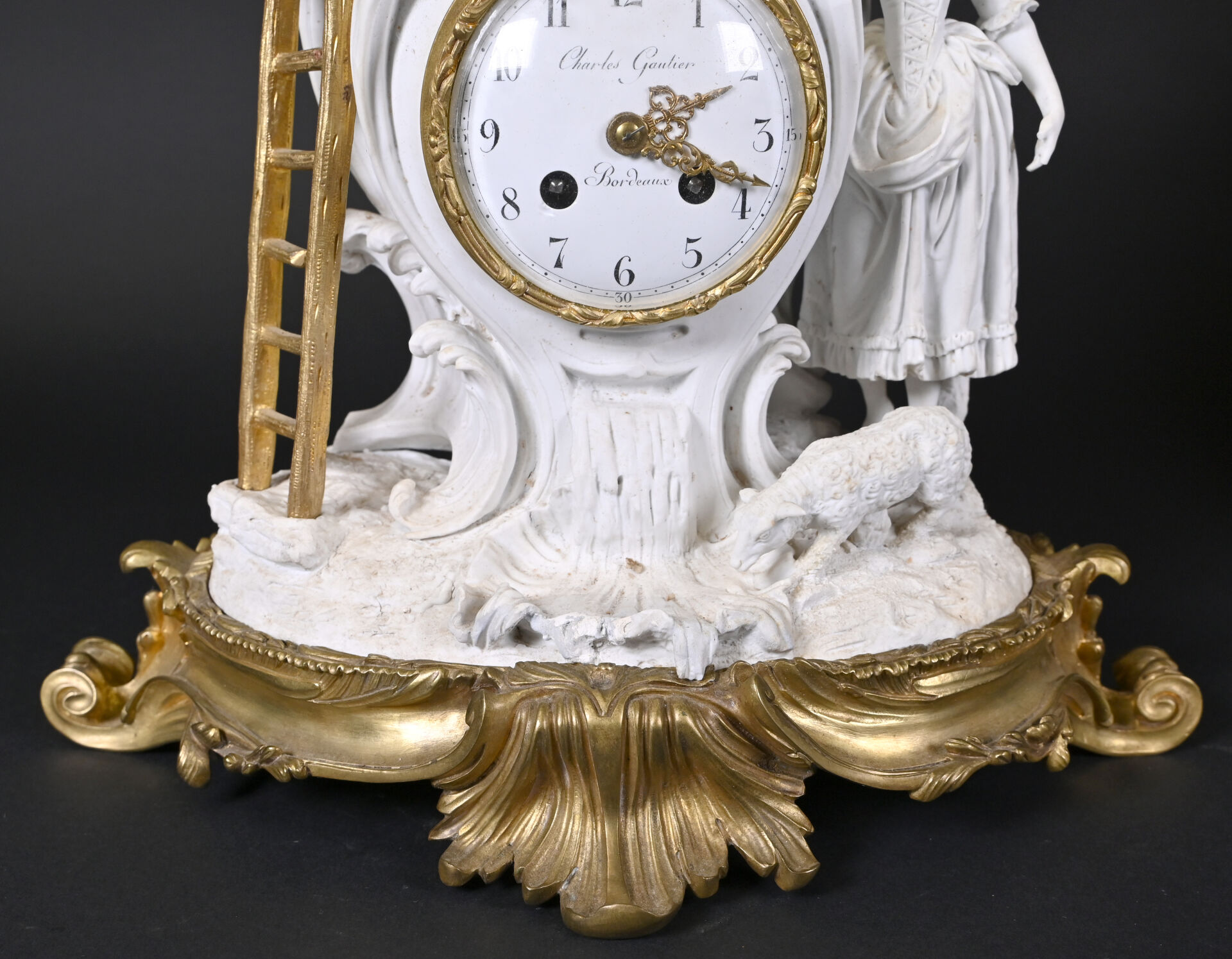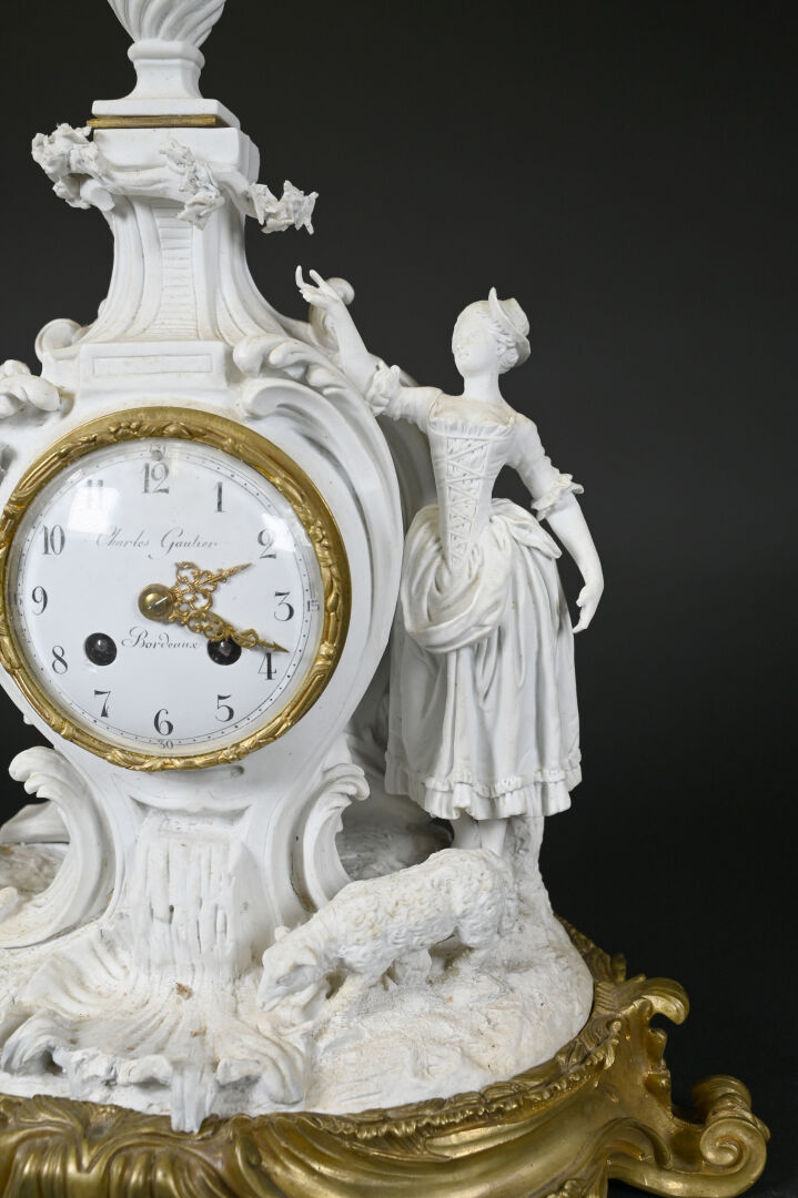 Pendule en biscuit à décor d’une bergère. Cadran signé Charles Gautier à Bordeaux, à chiffres arabes pour les heures (éclats, petits manques et restaurations). Mouvement signé Japy Frères, médaille d’honneur. Piètement en bronze ciselé doré à larges palmettes et enroulements. Style Louis XV, XIXe siècle. Haut. : 45 cm.