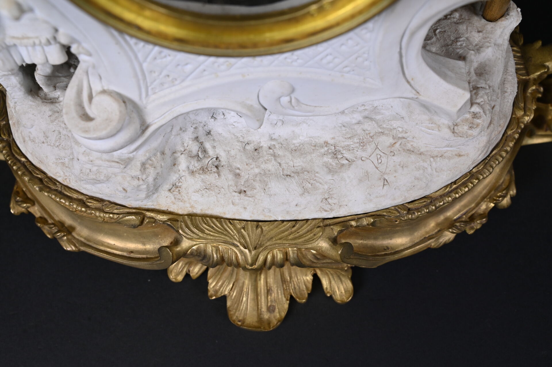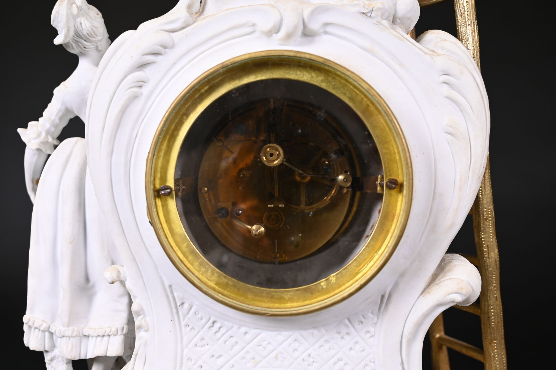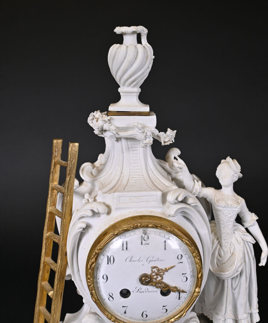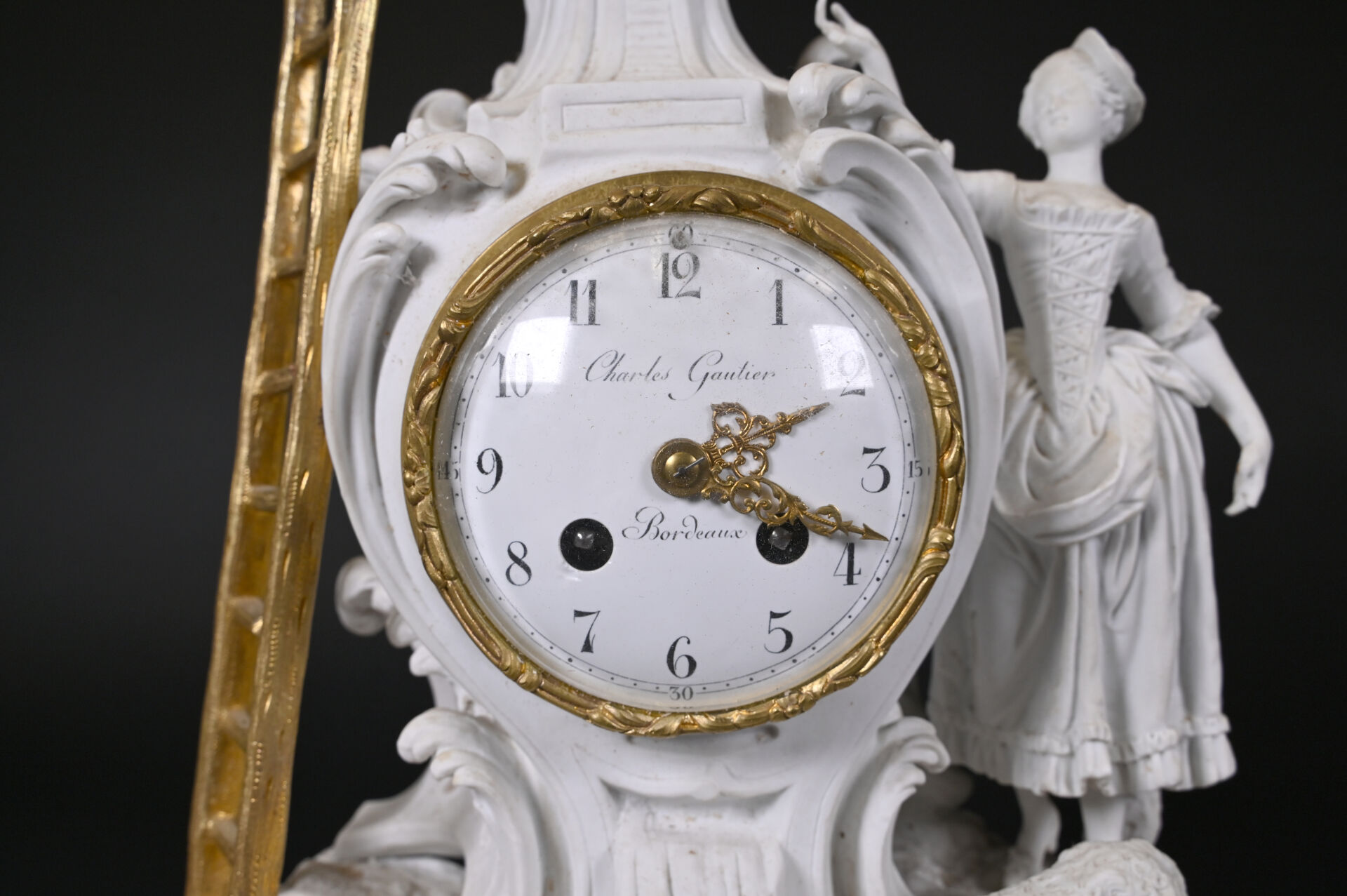Pendule en biscuit à décor d’une bergère. Cadran signé Charles Gautier à Bordeaux, à chiffres arabes pour les heures (éclats, petits manques et restaurations). Mouvement signé Japy Frères, médaille d’honneur. Piètement en bronze ciselé doré à larges palmettes et enroulements. Style Louis XV, XIXe siècle. Haut. : 45 cm.