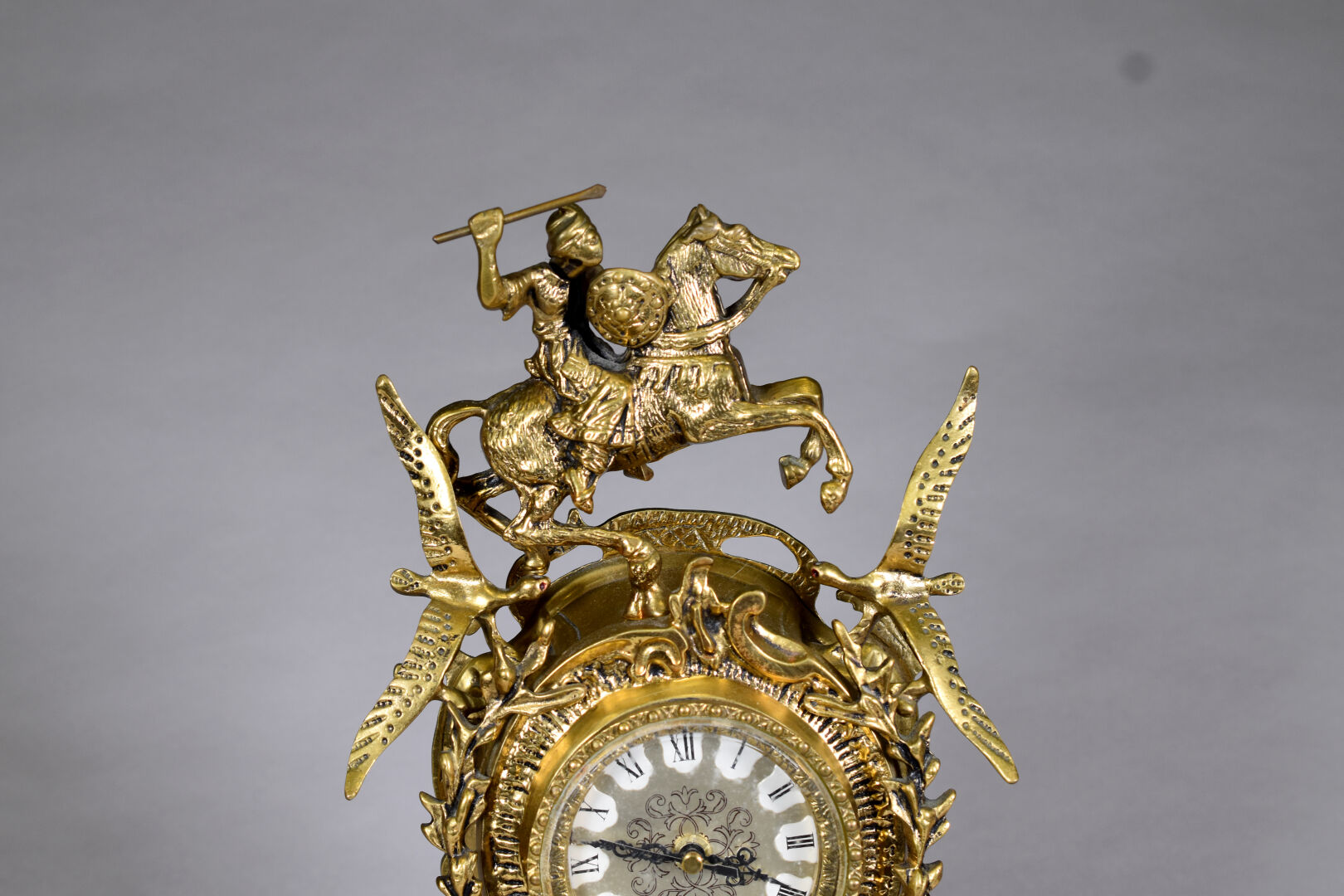 Pendule en bronze à décor d’un cavalier tenant une lance. Cadran métallique à chiffres romains pour les heures. Décor de chimères et acanthes. STyle Louis XV. Haut. : 46 cm.