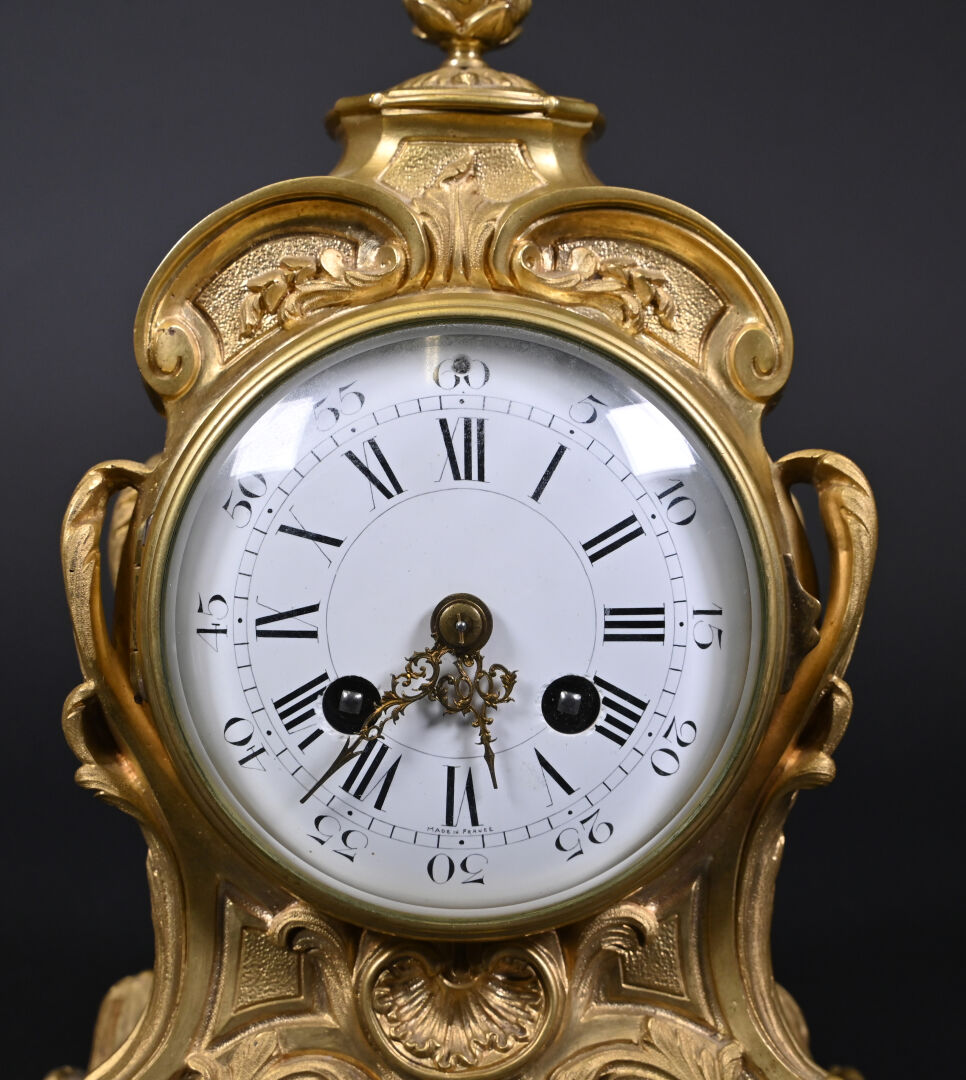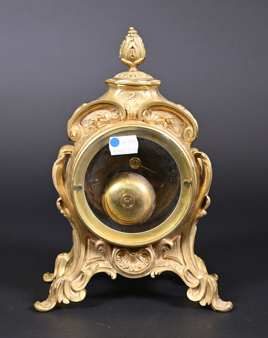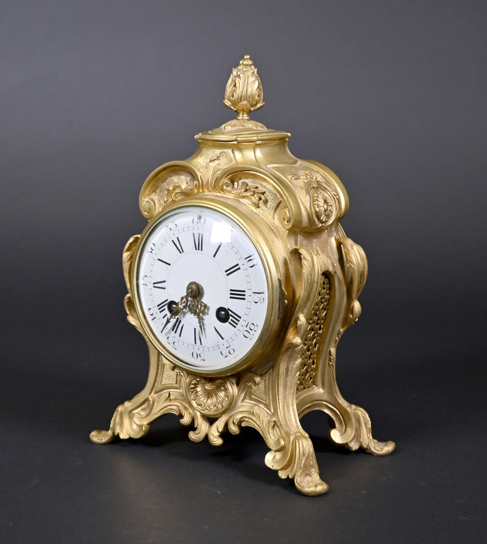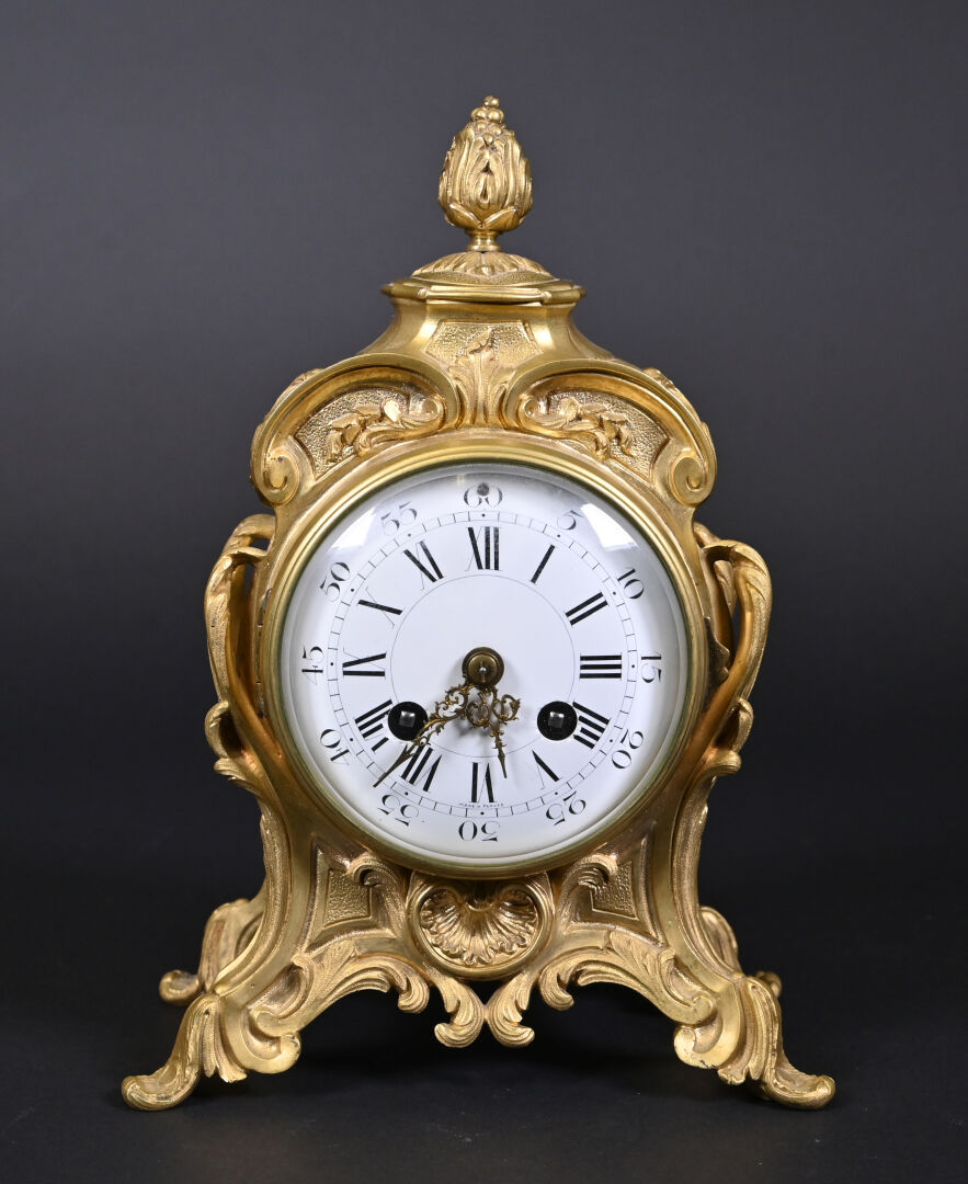 Pendule en bronze ciselé, anciennement doré, cadran émaillé à chiffres romains en noir pour les heures, arabes et chemin de fer pour les minutes (quelques éclats au cadran). Avec clé. Style Louis XV, fin du XIXe siècle. Haut. : 26,5 cm.