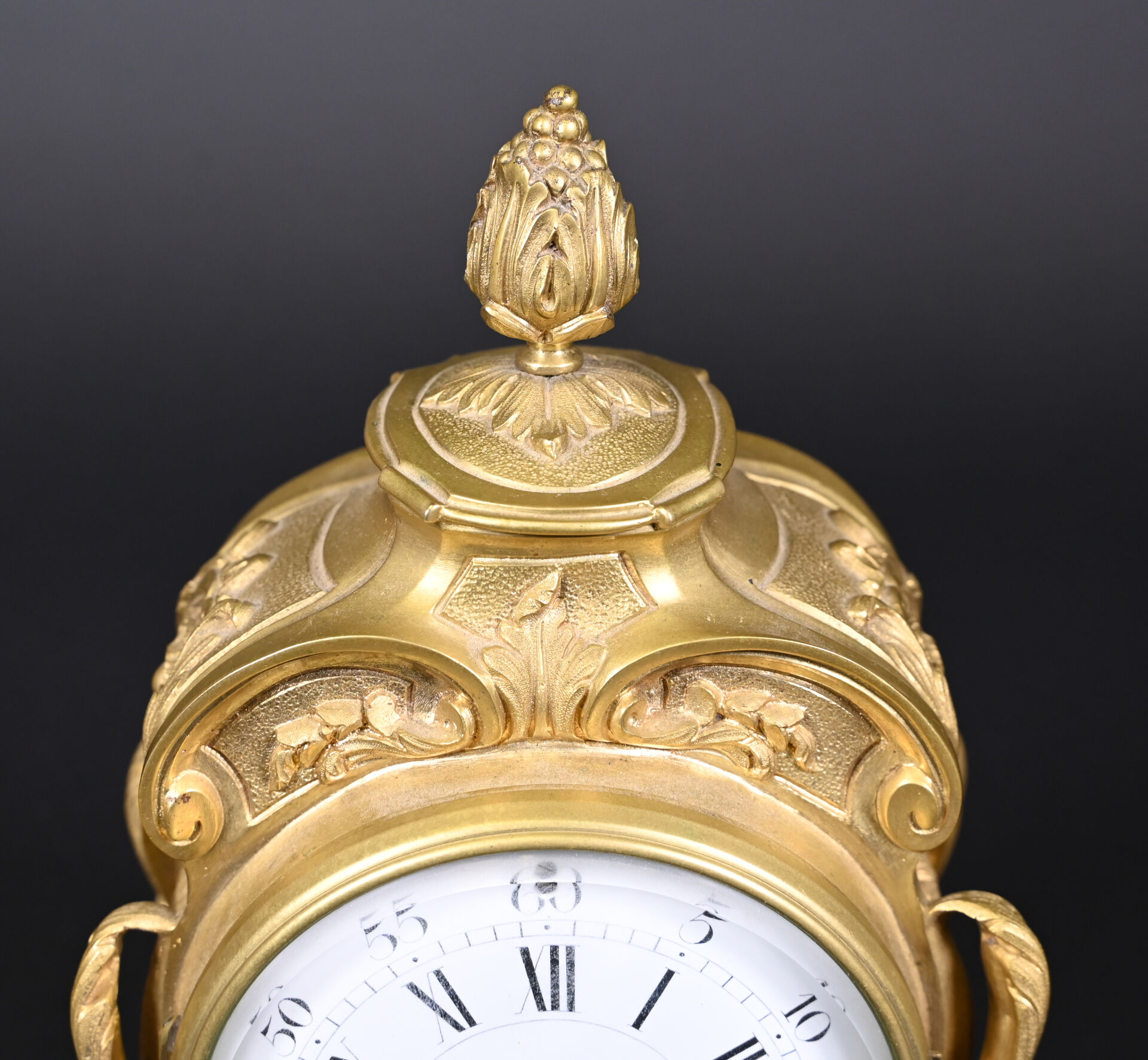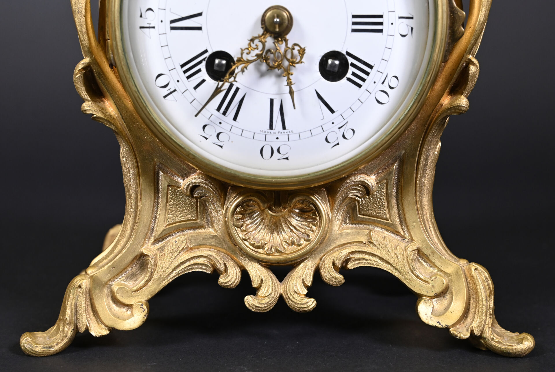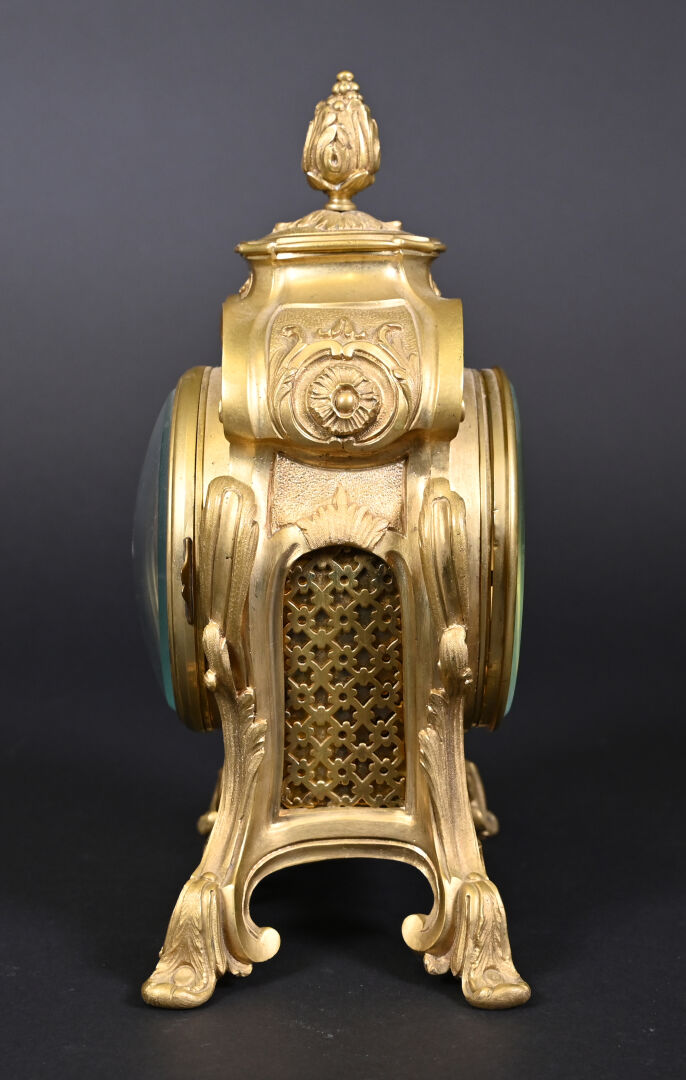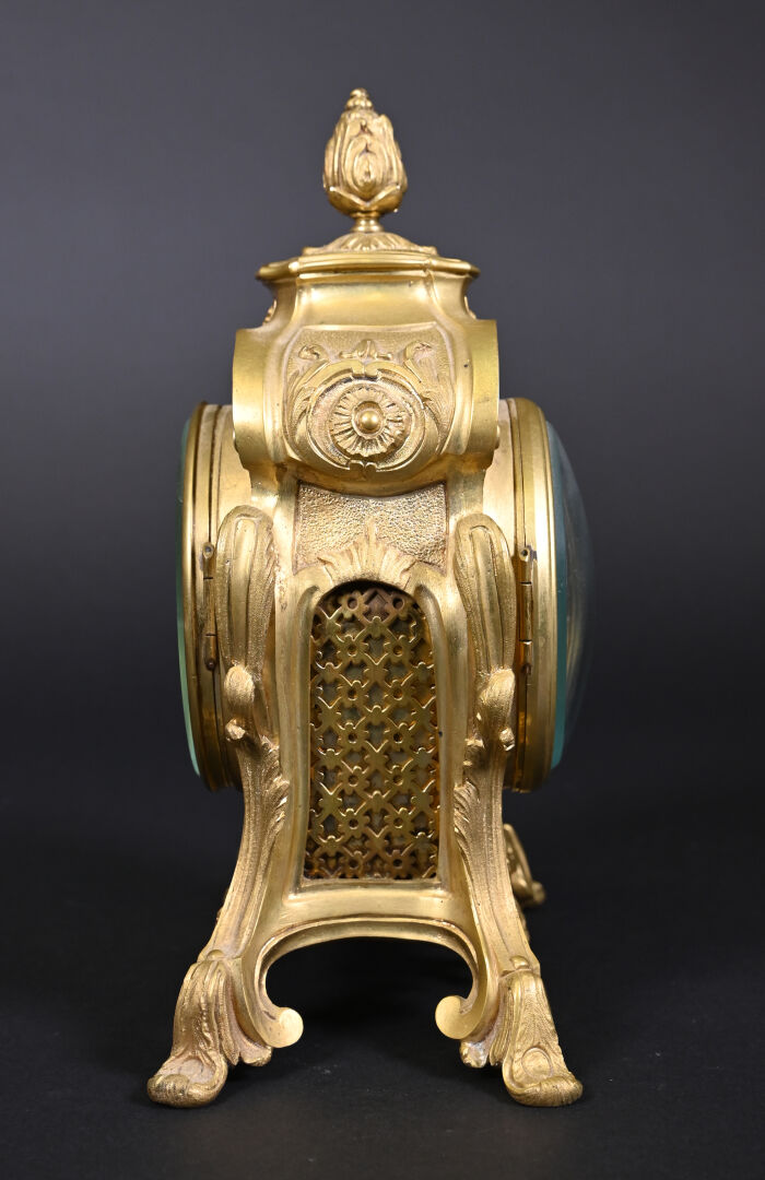 Pendule en bronze ciselé, anciennement doré, cadran émaillé à chiffres romains en noir pour les heures, arabes et chemin de fer pour les minutes (quelques éclats au cadran). Avec clé. Style Louis XV, fin du XIXe siècle. Haut. : 26,5 cm.