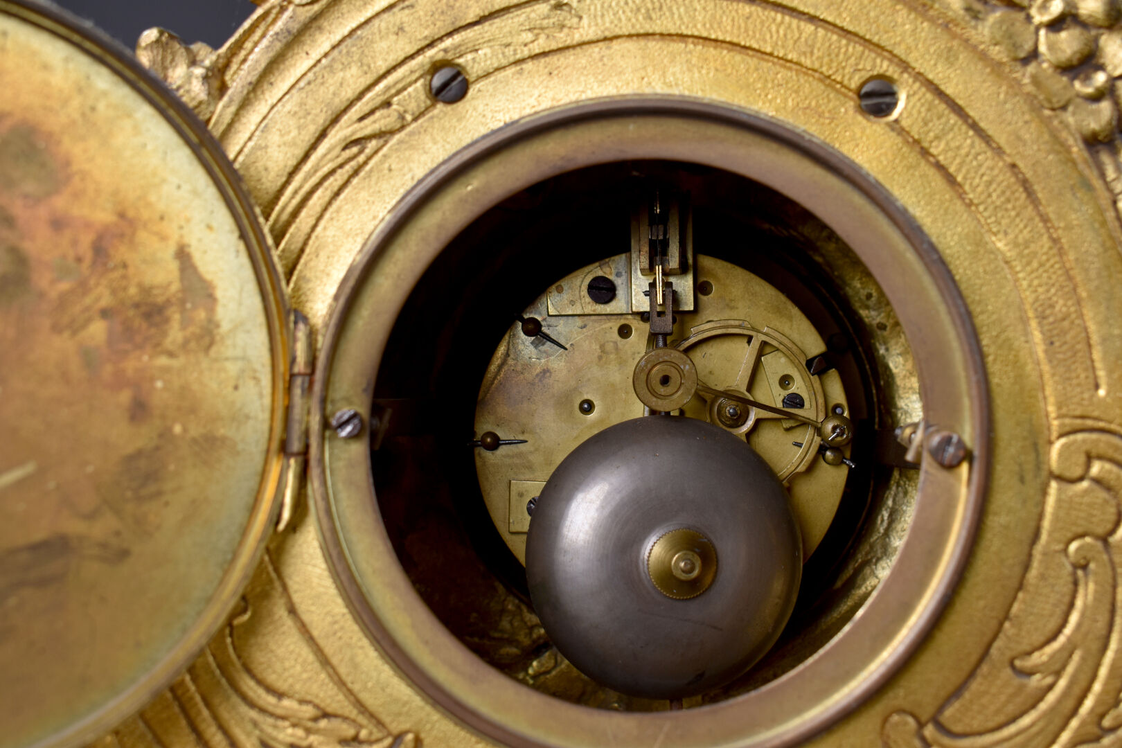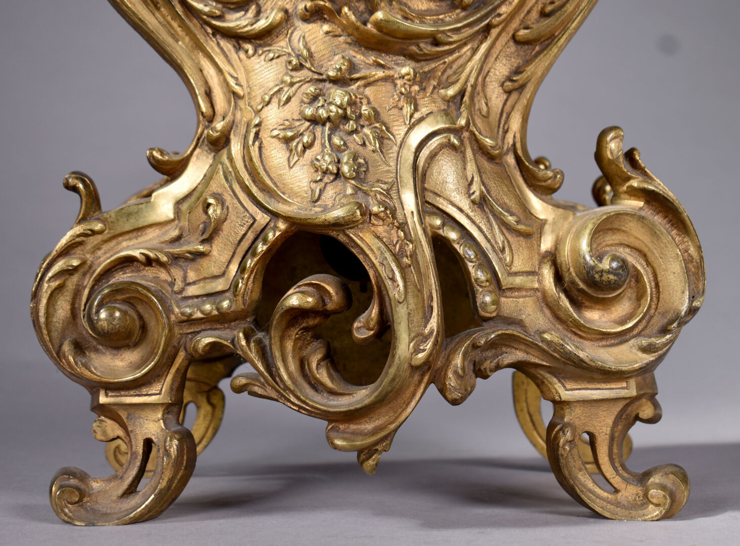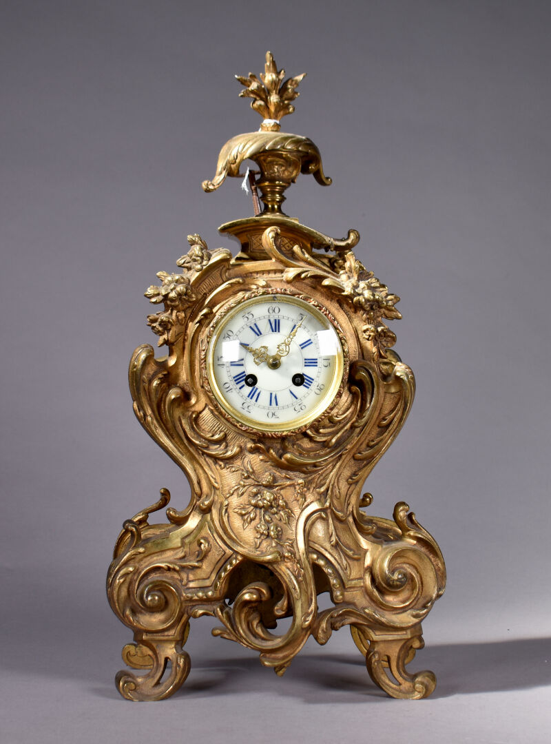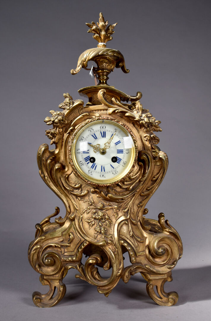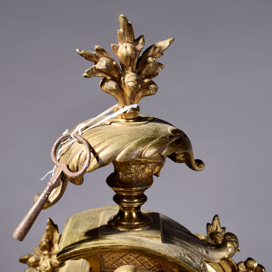 Pendule en bronze ciselé doré à décor d’acanthes et pot à feu. Cadran émaillé à chiffres romains pour les heures, arabe pour les minutes et chemin de fer (un fèle). Mouvement signé S. MARTI, médaille d’argent 1889. Époque second Empire. Avec Clé. Haut. : 52 cm.