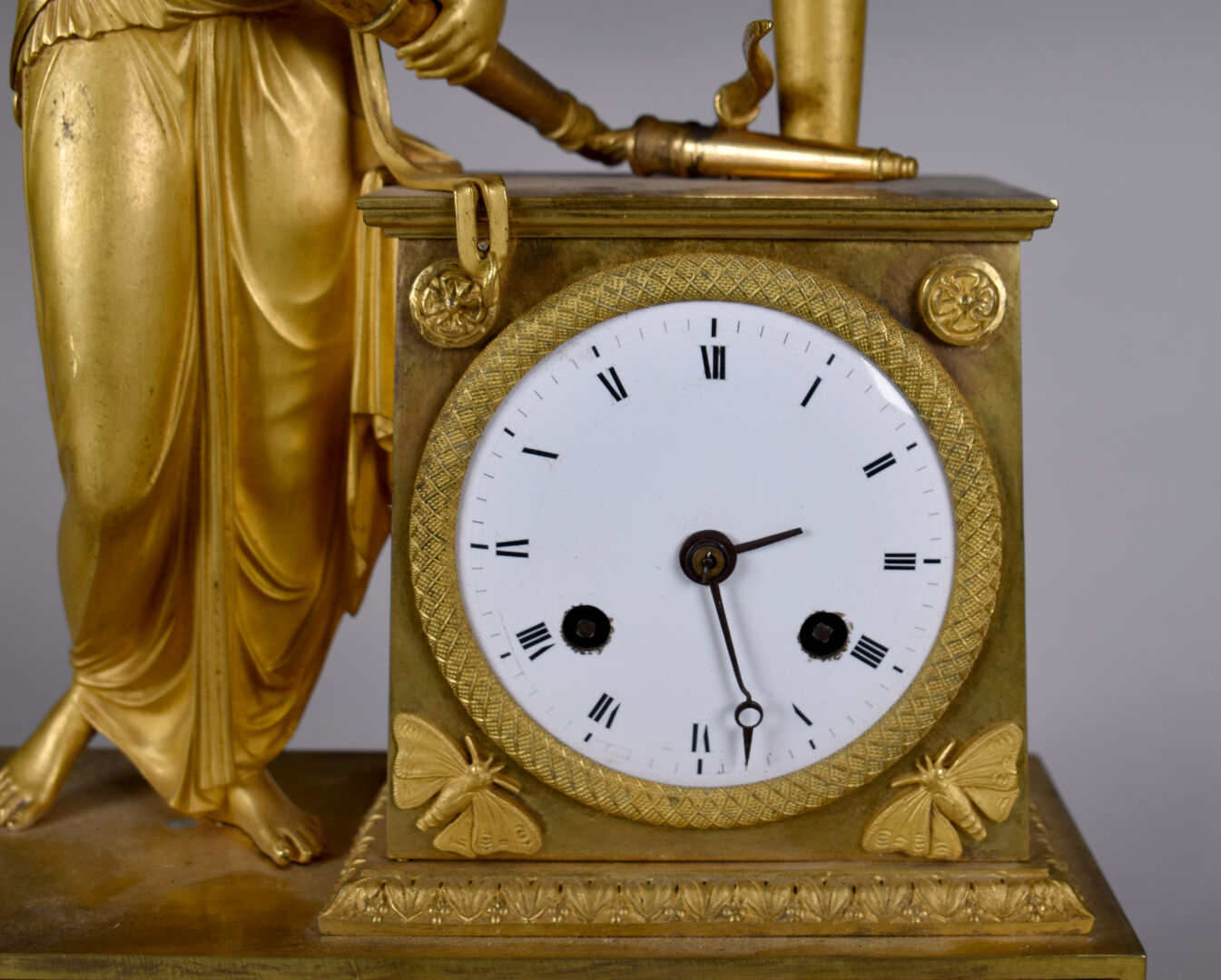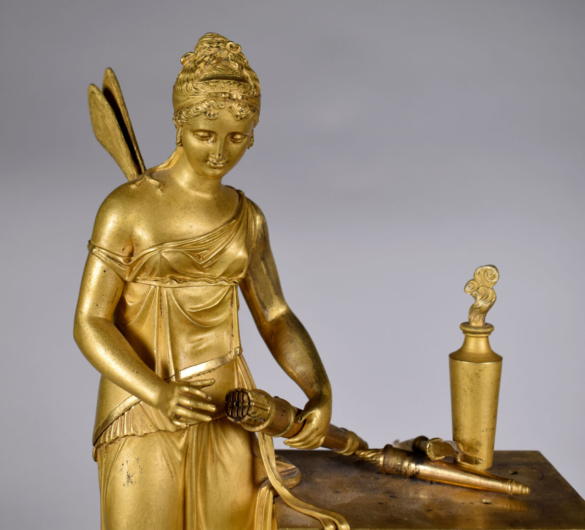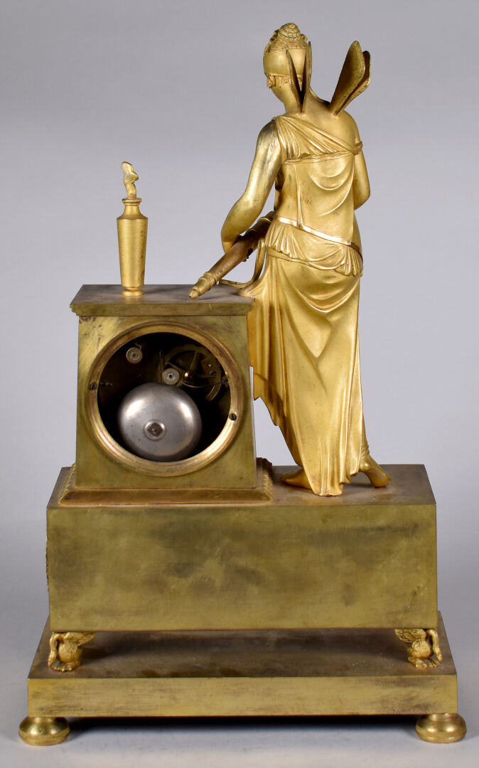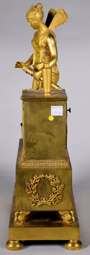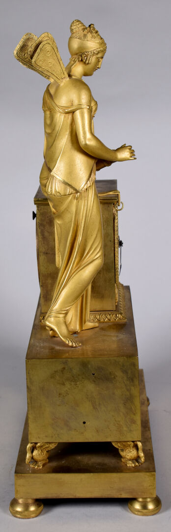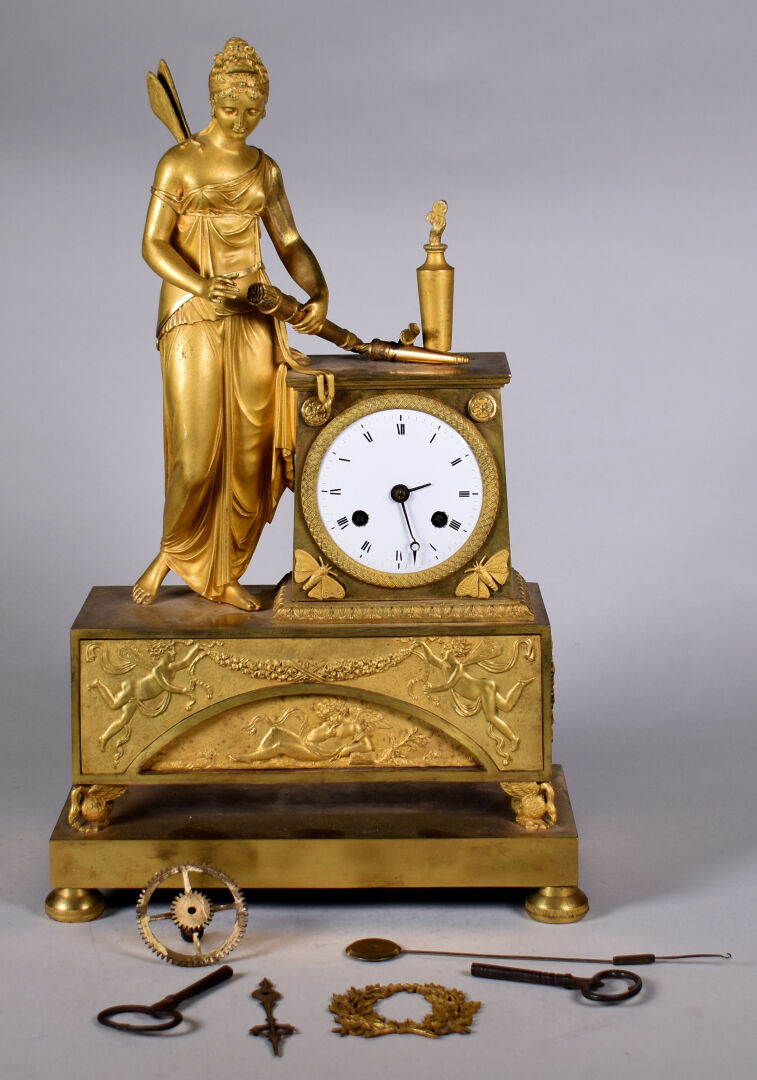 Pendule en bronze ciselé doré à décor d’une figure de psyché tenant le carquois et les flèches de l’amour (accidents, manques). Cadran émaillé à chiffres romains pour les heures. XIXe siècle. Haut. : 41,5 cm.