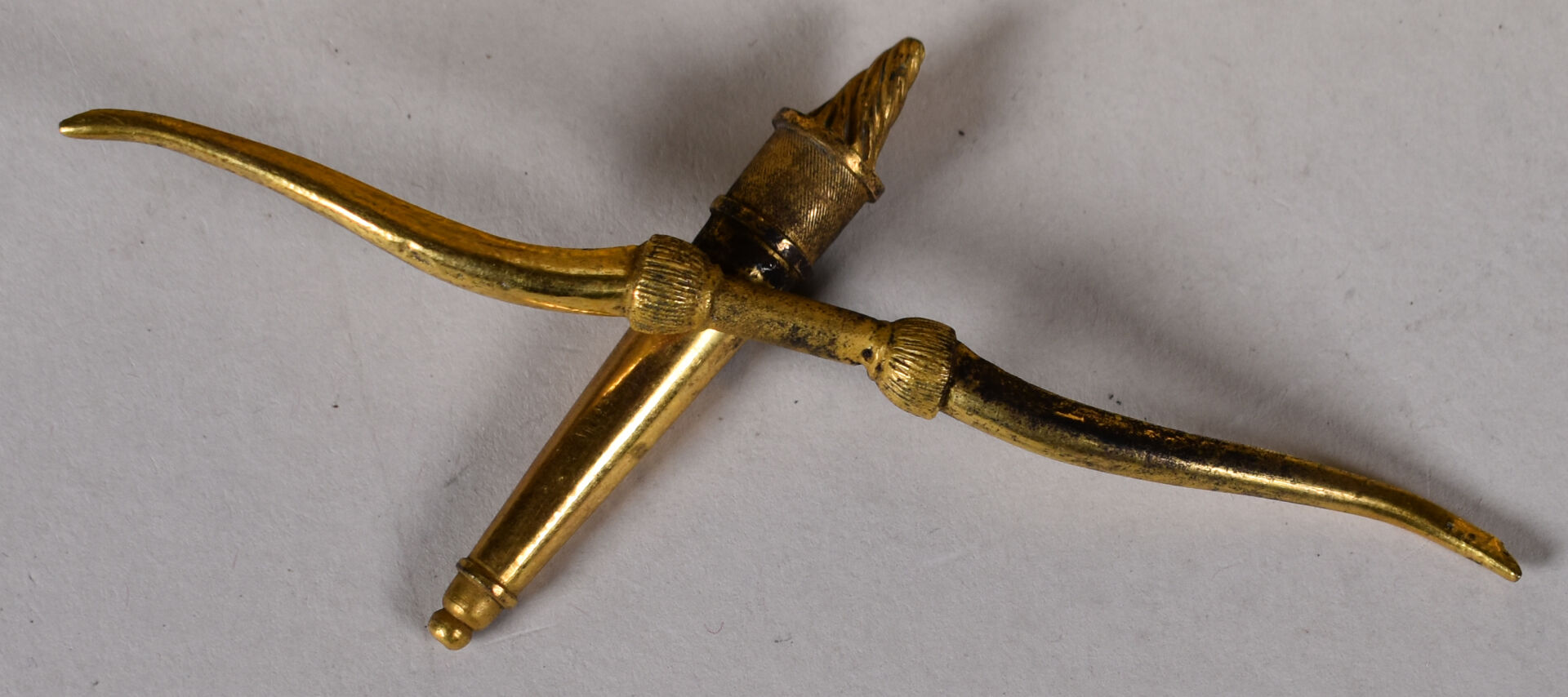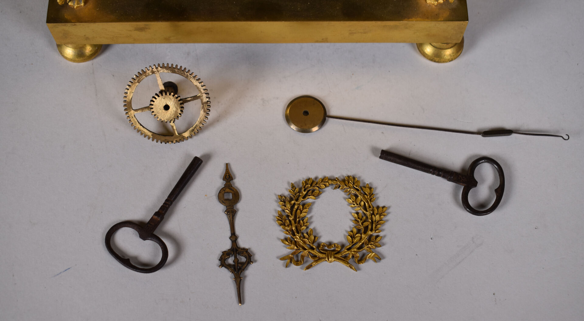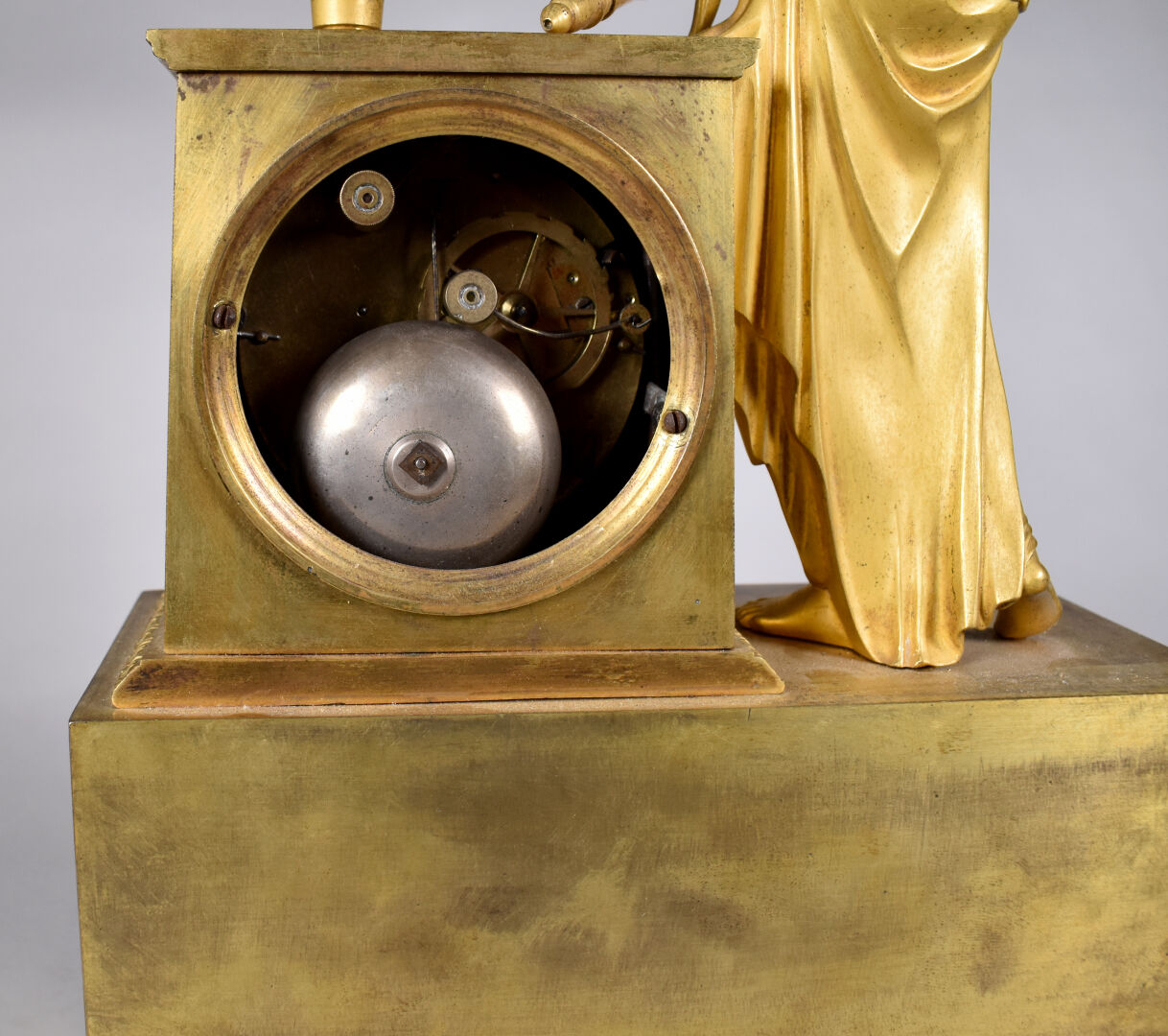 Pendule en bronze ciselé doré à décor d’une figure de psyché tenant le carquois et les flèches de l’amour (accidents, manques). Cadran émaillé à chiffres romains pour les heures. XIXe siècle. Haut. : 41,5 cm.