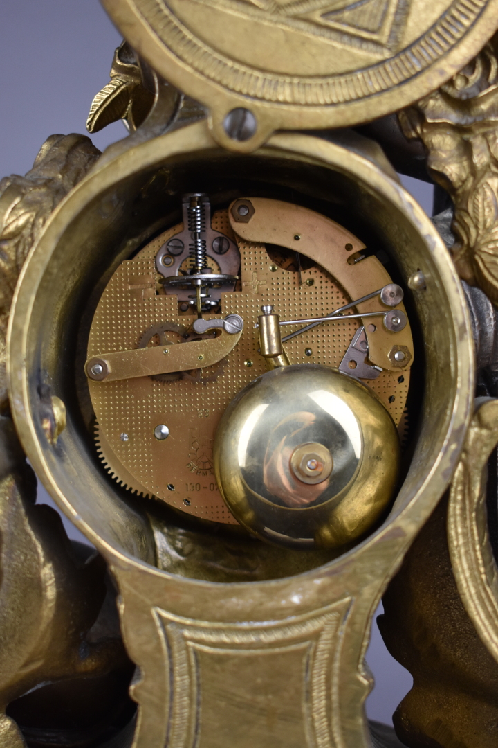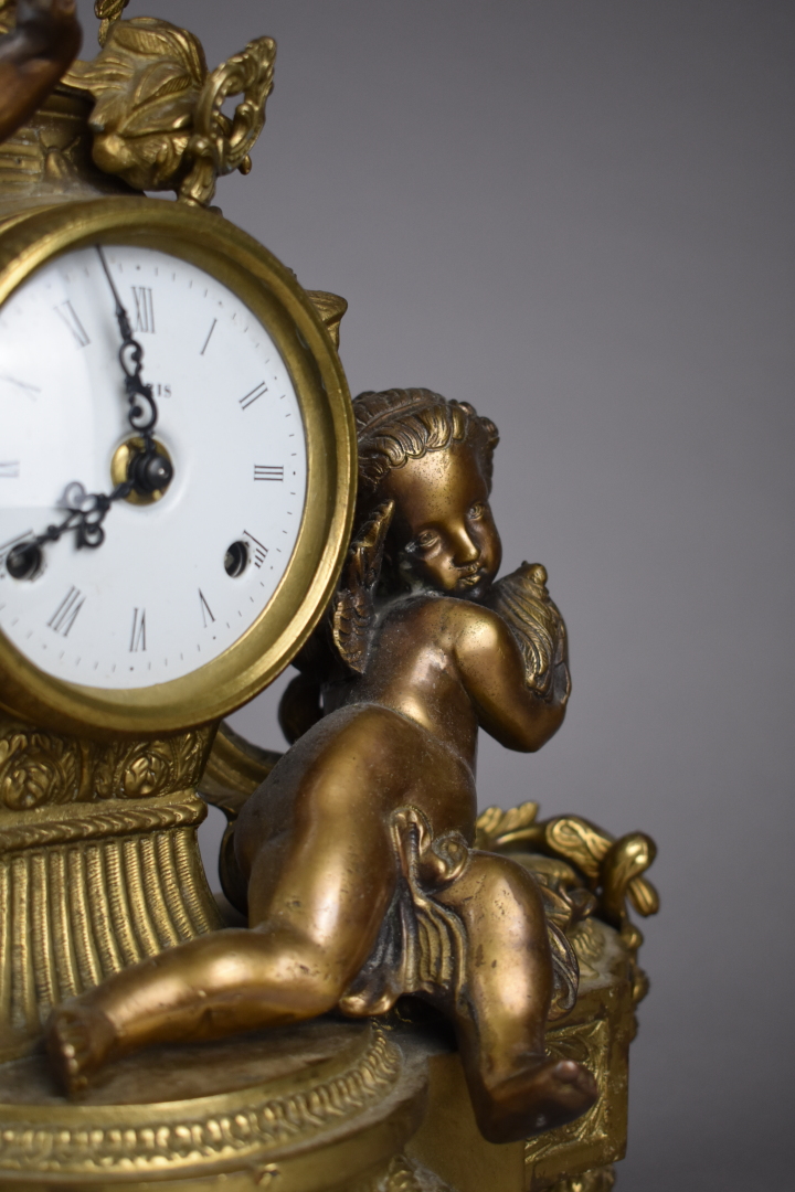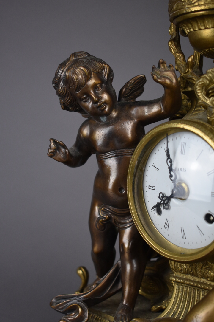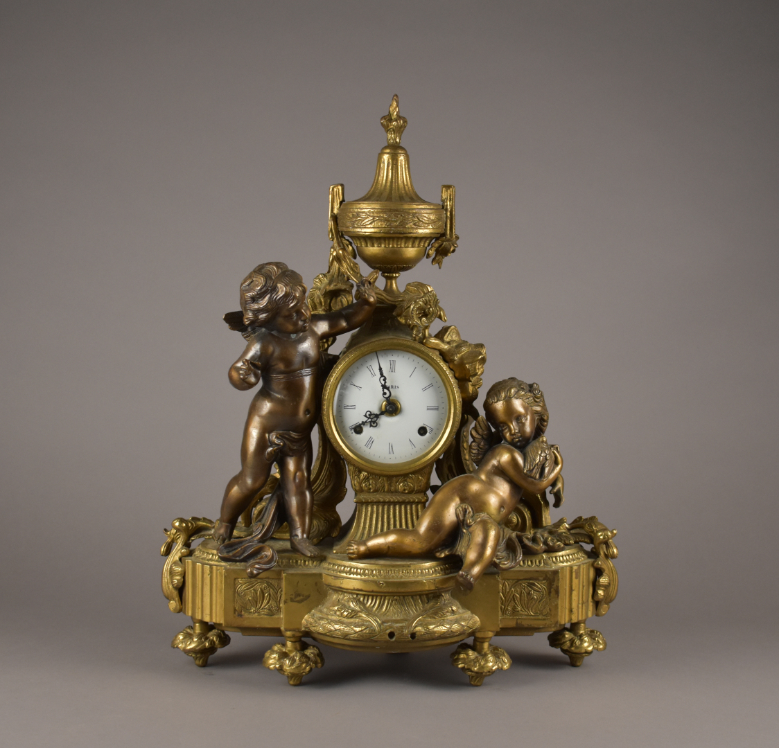 Pendule en bronze ciselé doré et patiné brun. Cadran circulaire à chiffres romains pour les heures. Décor d’un putto et d’une jeune fille tenant une colombe. Piétement toupie (un choc, mécanisme rapporté). Haut. : 47,5 cm – Larg. : 39 cm – Prof. : 17 cm.