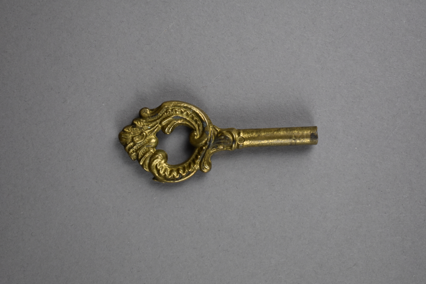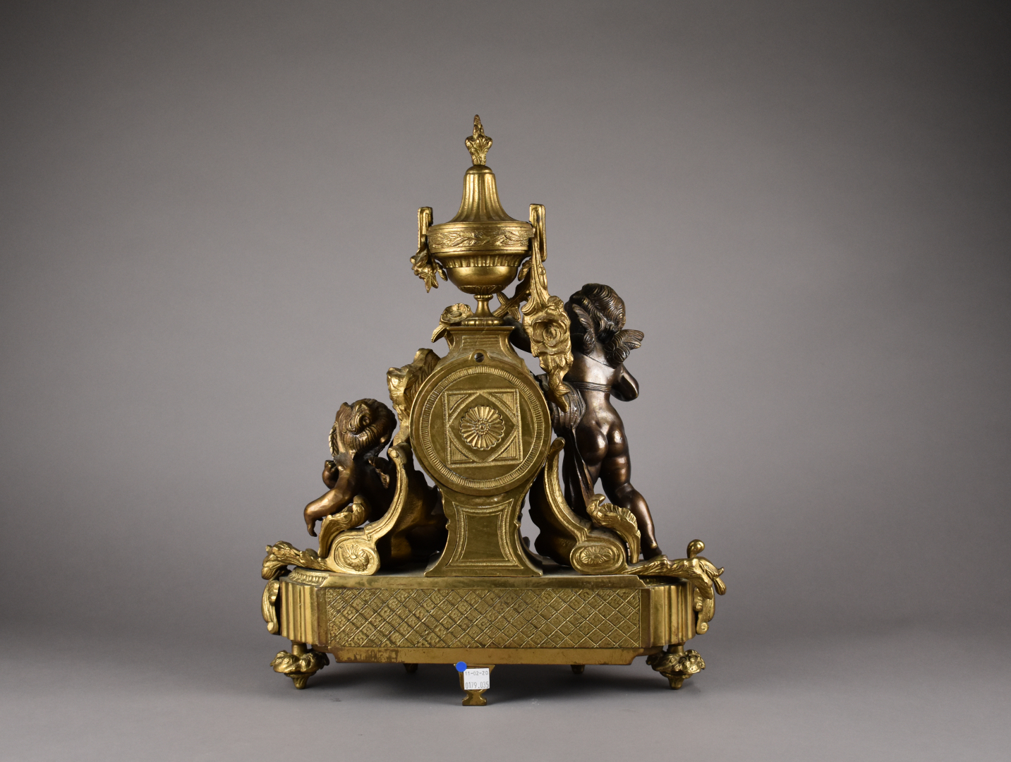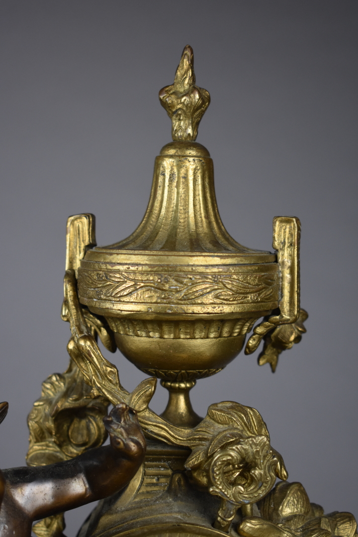 Pendule en bronze ciselé doré et patiné brun. Cadran circulaire à chiffres romains pour les heures. Décor d’un putto et d’une jeune fille tenant une colombe. Piétement toupie (un choc, mécanisme rapporté). Haut. : 47,5 cm – Larg. : 39 cm – Prof. : 17 cm.