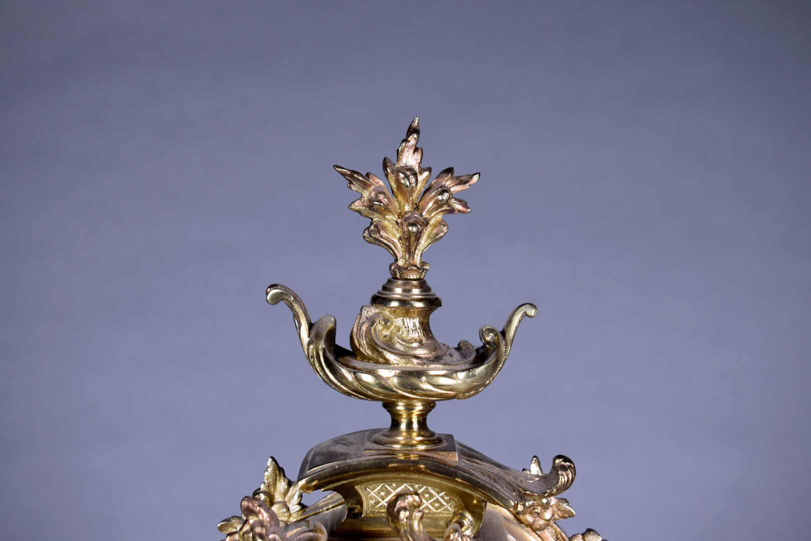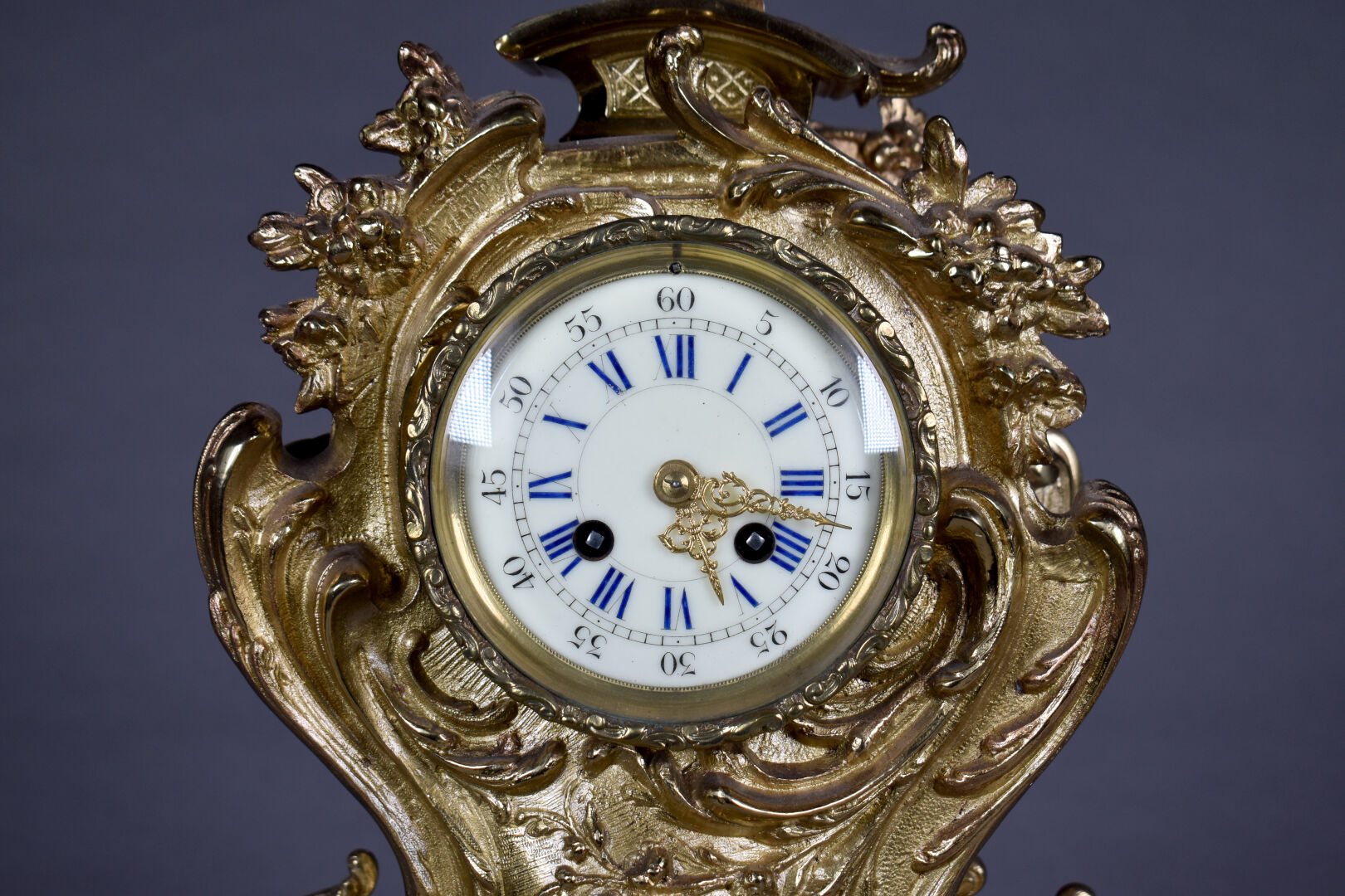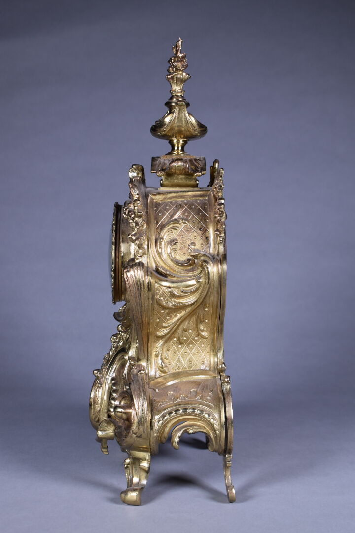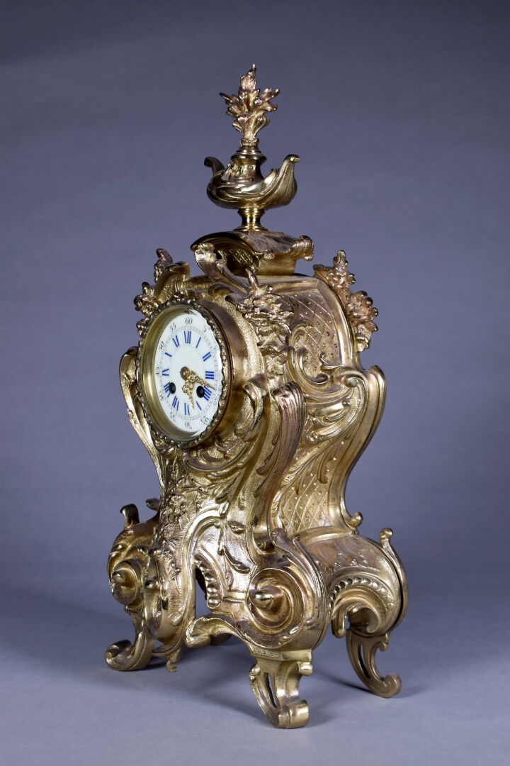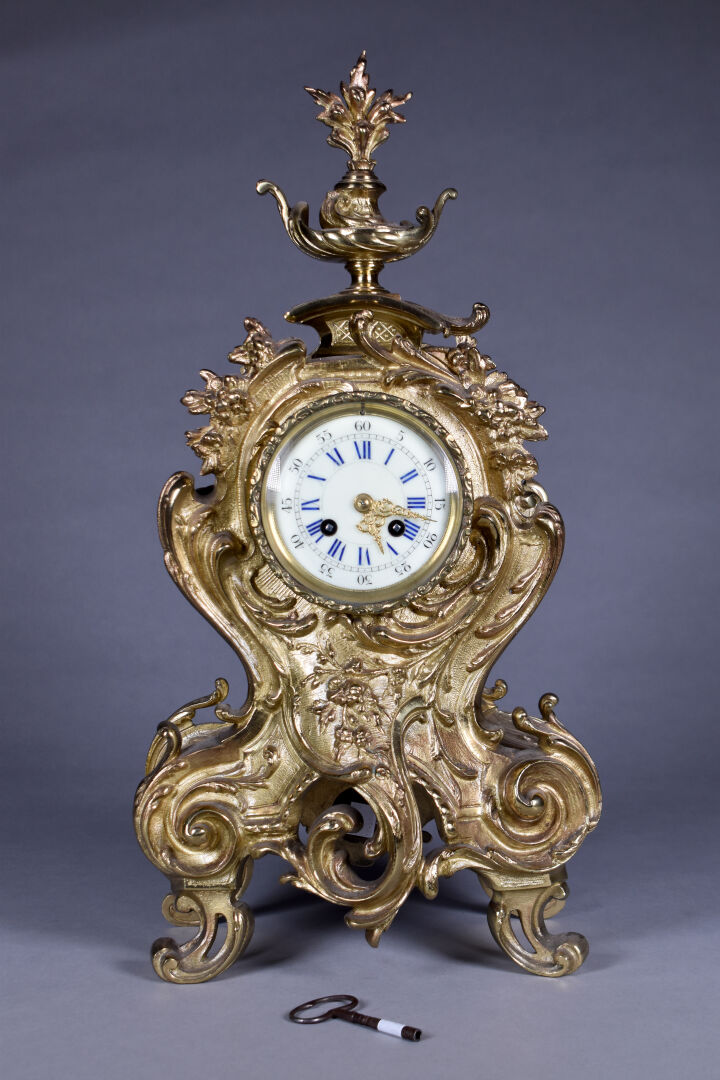 Pendule en bronze ciselé doré. Le cadran émaillé à chiffres romains pour les heures, arabes pour les minutes et chemin de fer. Décor de fleurs, rocailles. Mouvement signé S. Marti – médaille de bronze. Fin du XIXe siècle. Haut. : 54,5 cm.