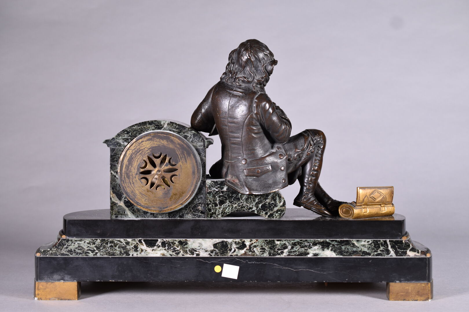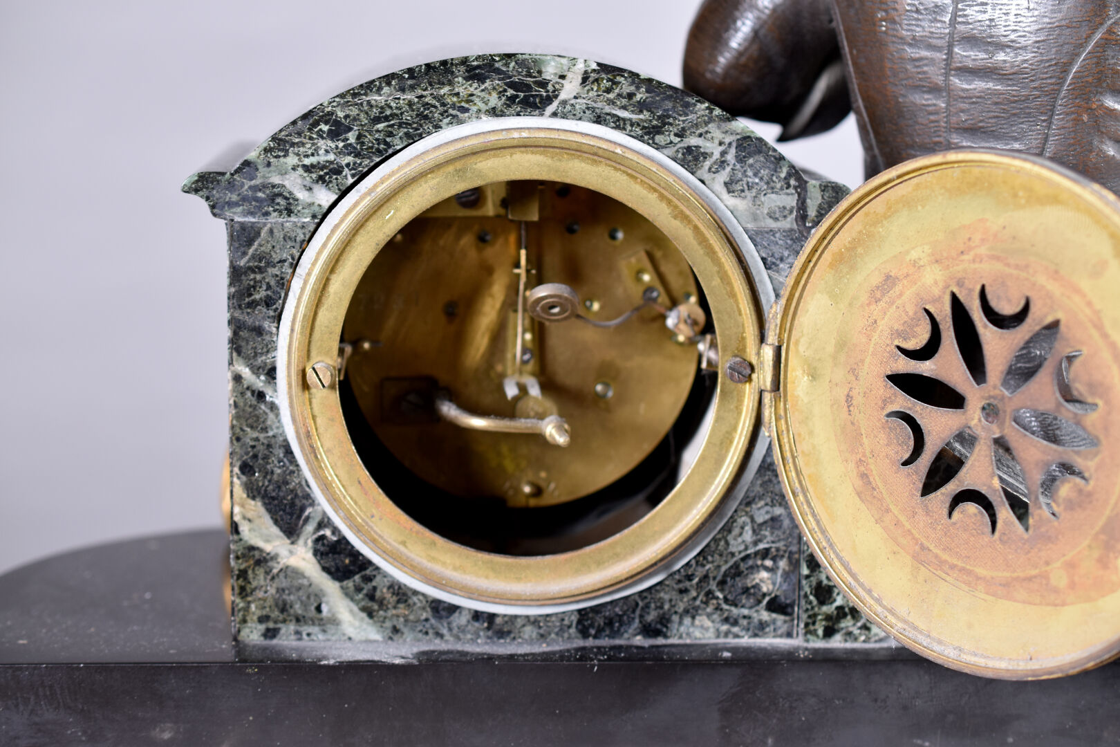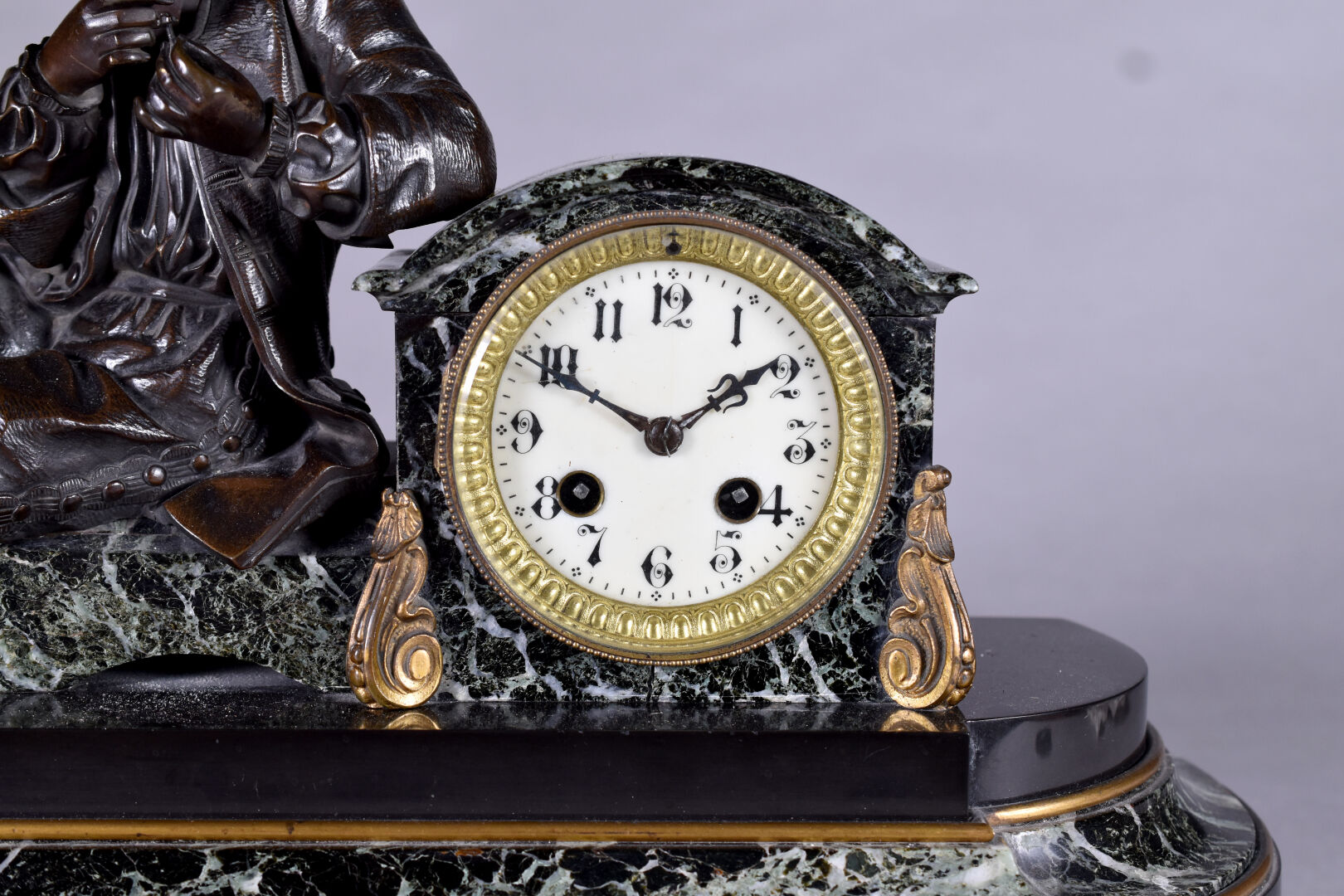 Pendule en marbre noir et vert, le cadran à chiffres arabes pour les heures. Elle est ornée d’une figure de botaniste en bronze à patine brun. Avec clé et balancier. Epoque Napoélon III. Haut. : 35 cm – Larg. : 53 cm – Prof. : 18 cm.