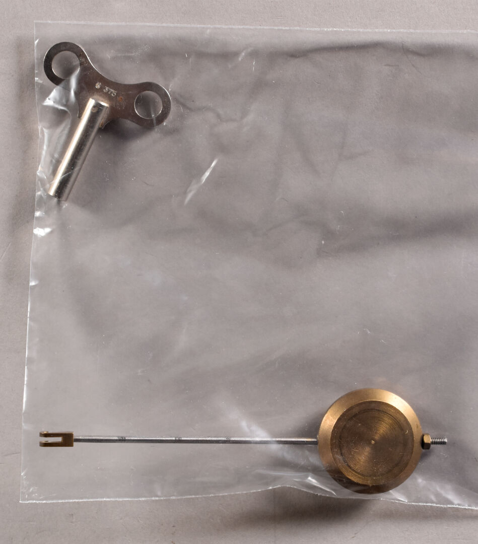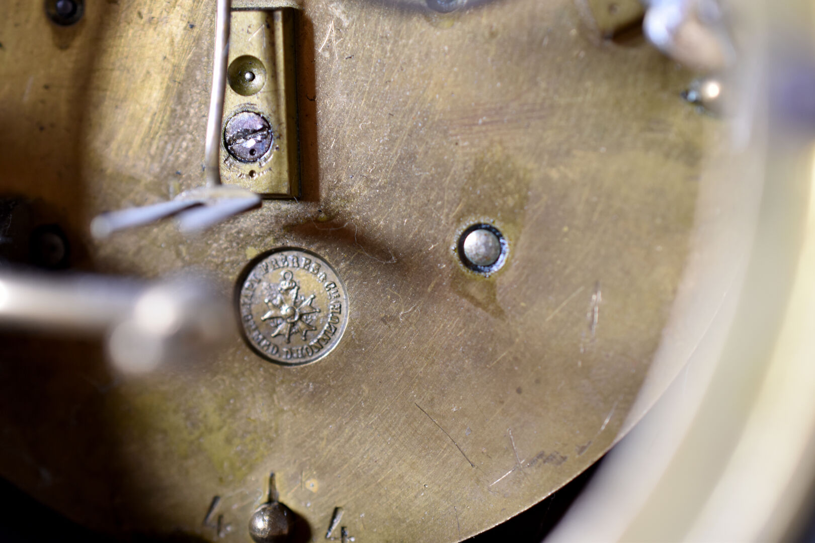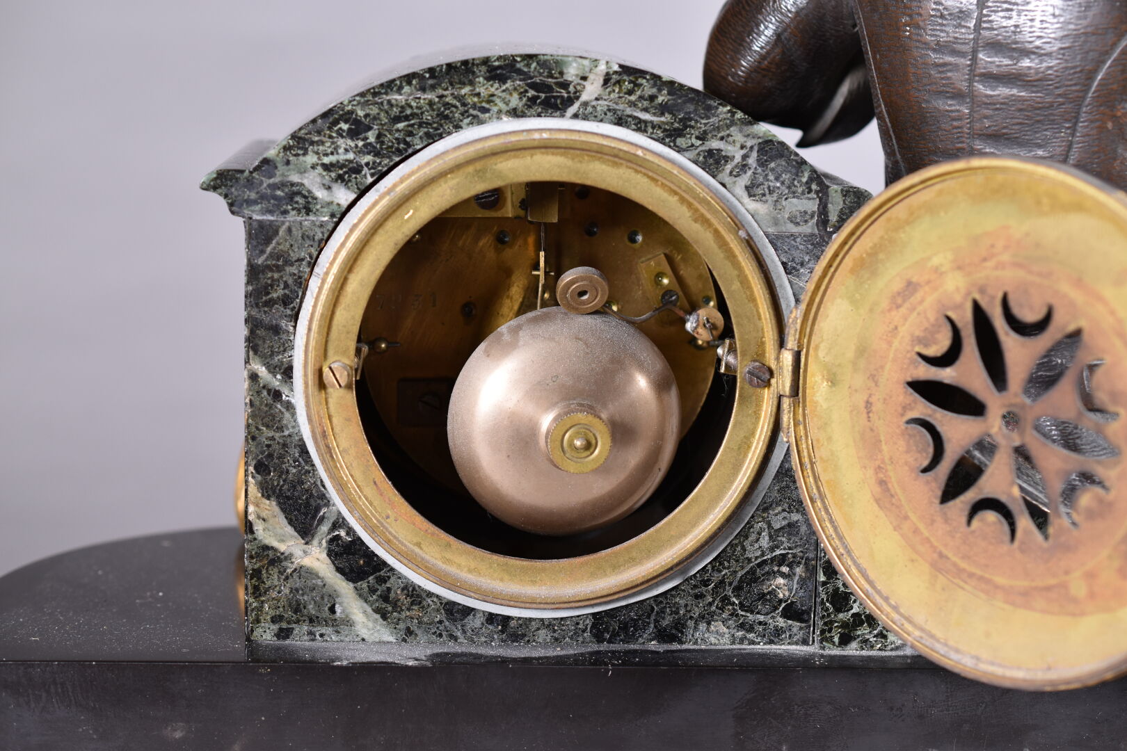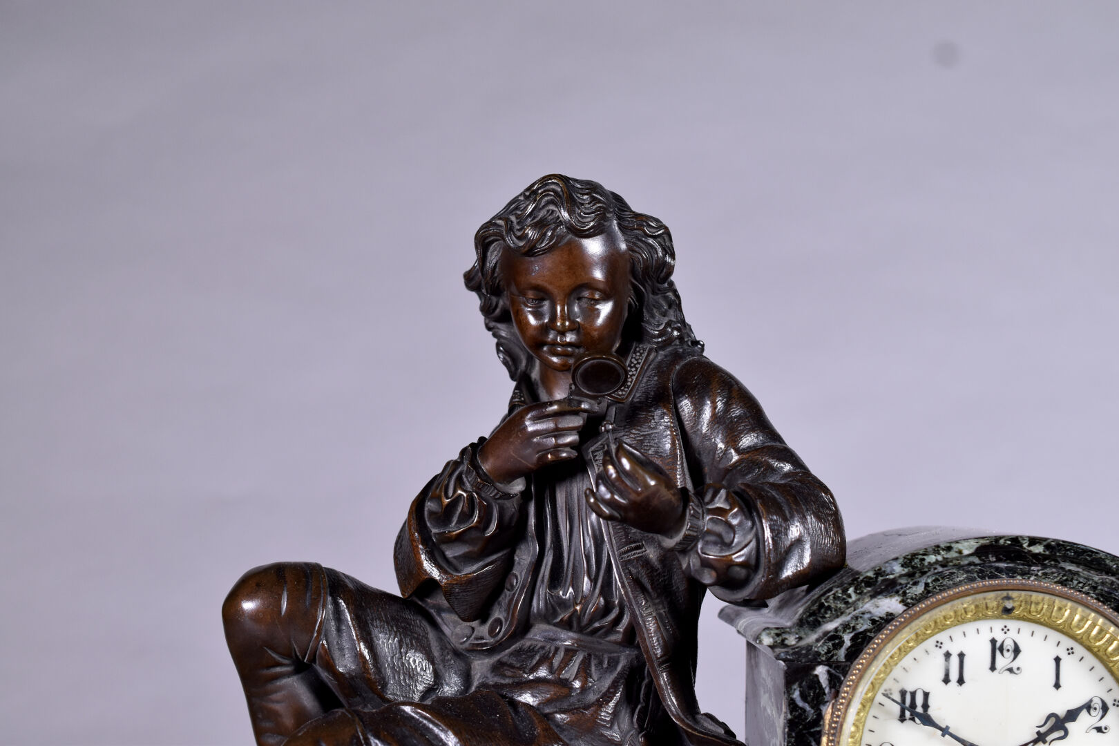 Pendule en marbre noir et vert, le cadran à chiffres arabes pour les heures. Elle est ornée d’une figure de botaniste en bronze à patine brun. Avec clé et balancier. Epoque Napoélon III. Haut. : 35 cm – Larg. : 53 cm – Prof. : 18 cm.