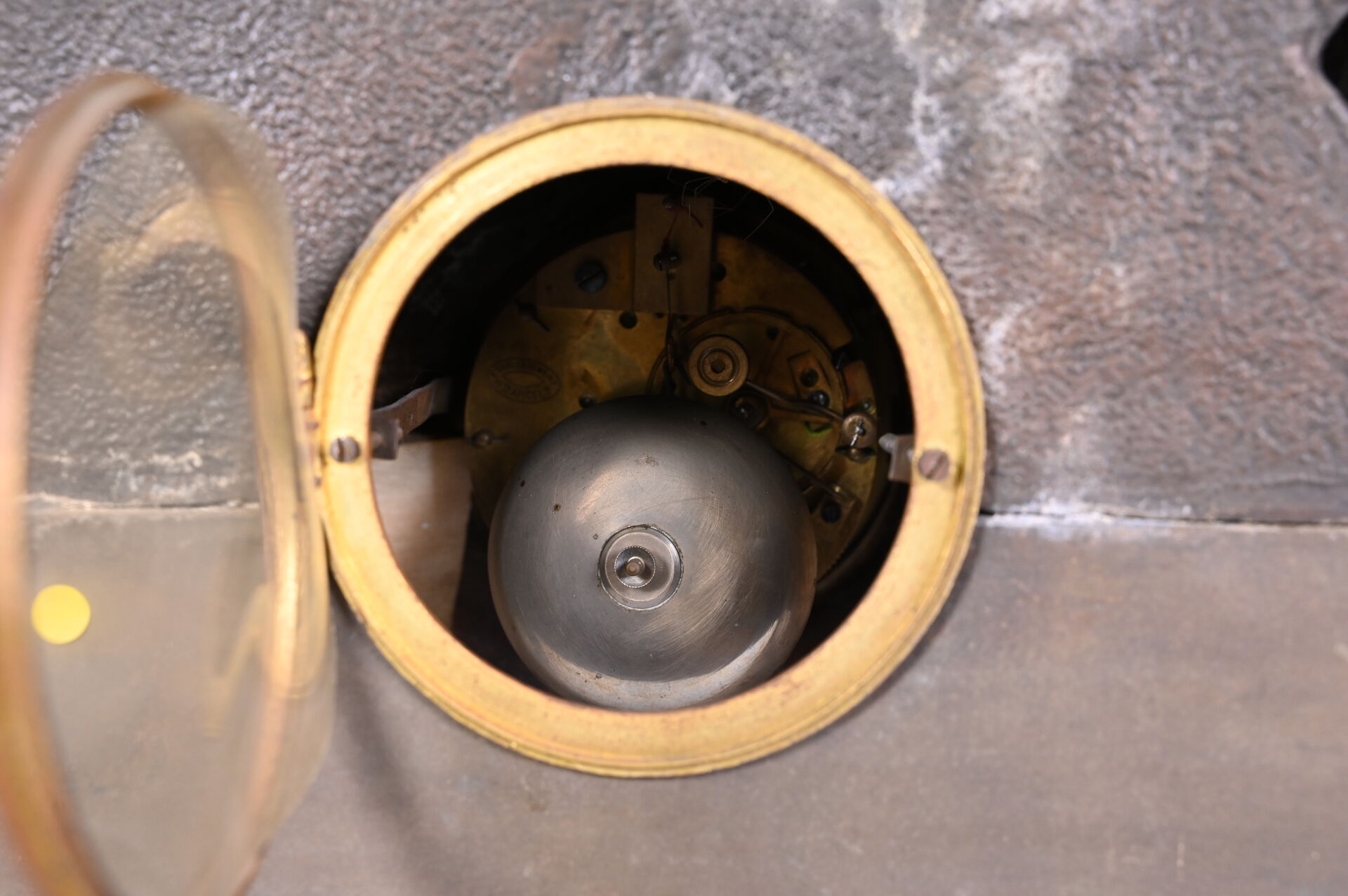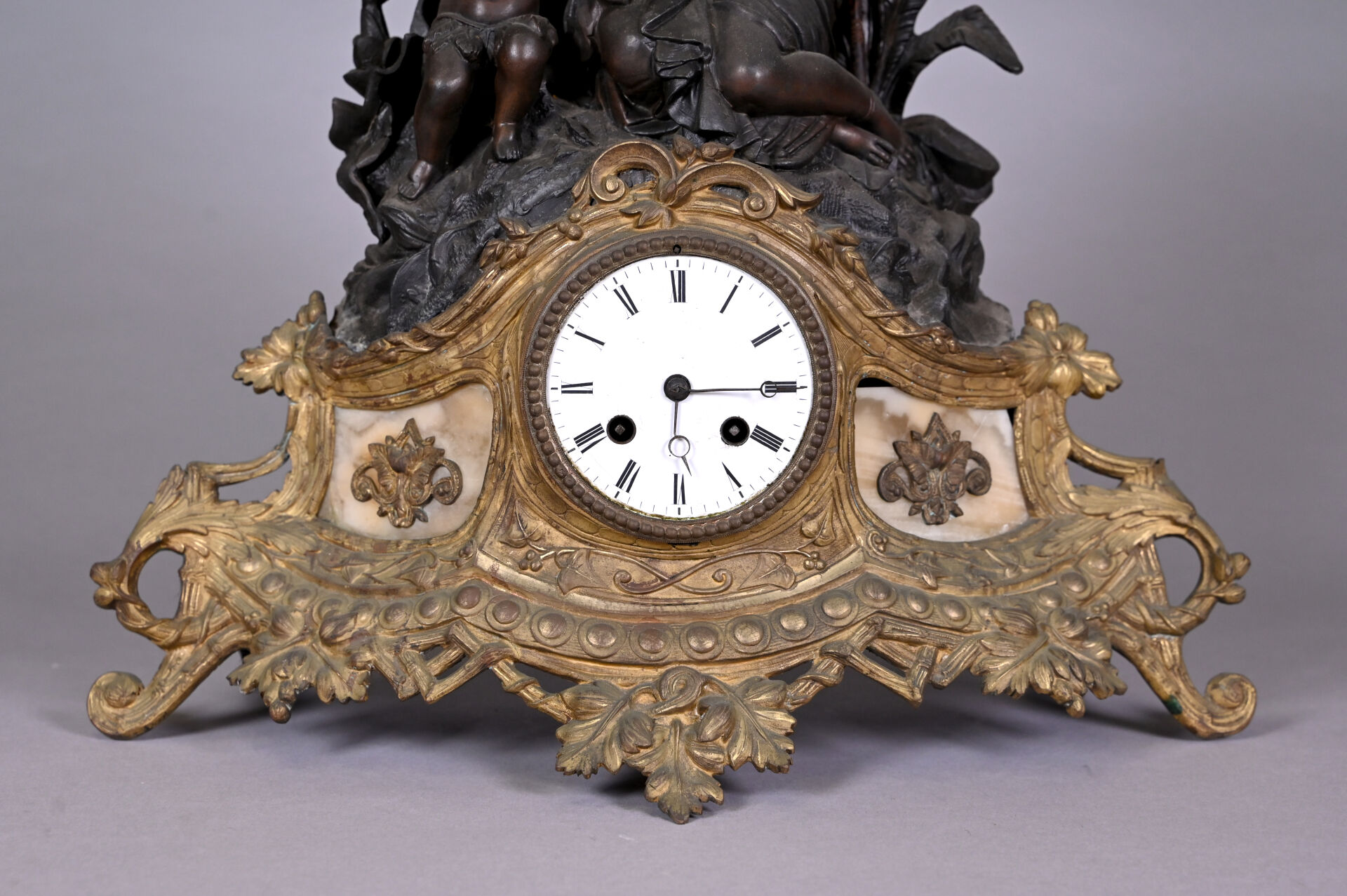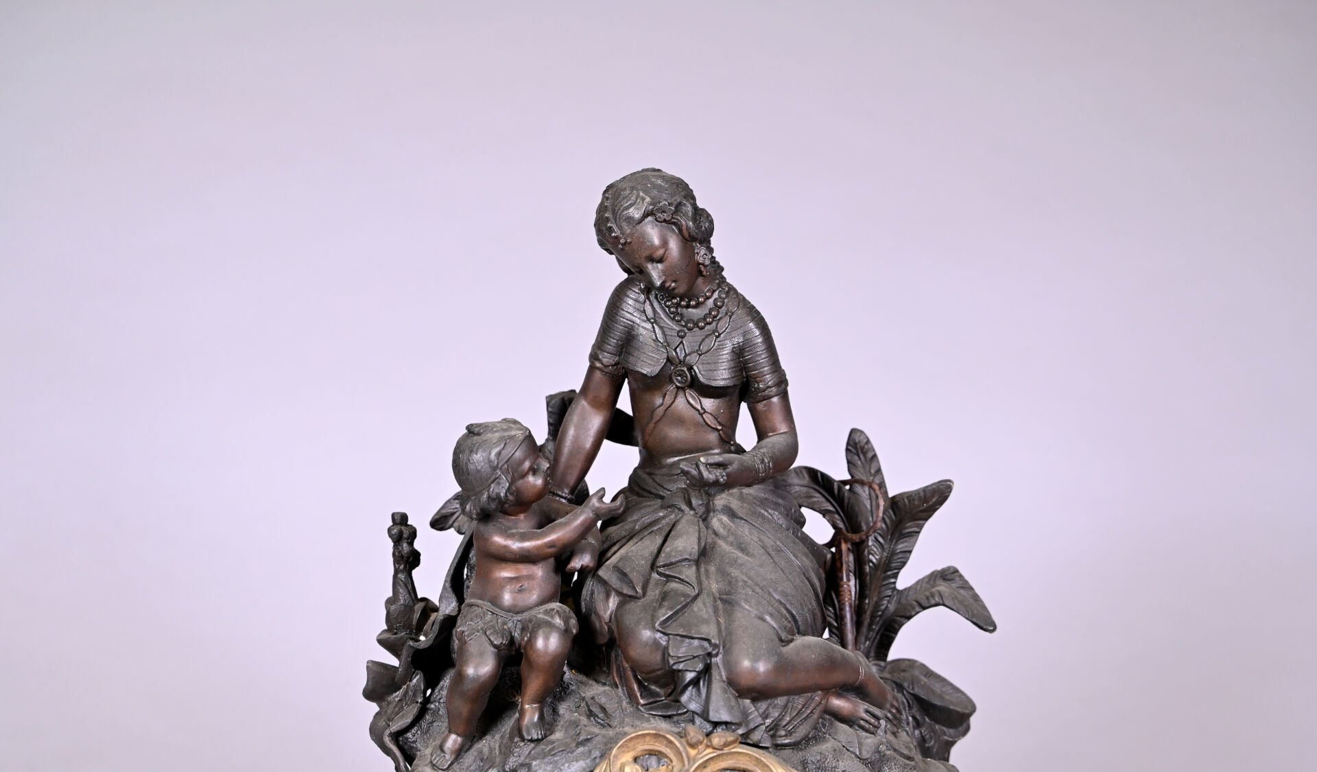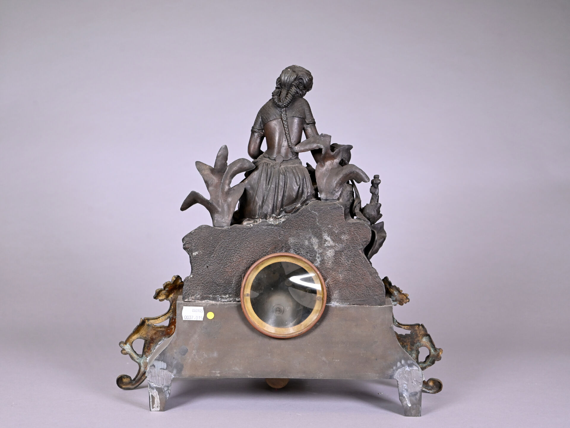 Pendule en métal et régule à décor d’indiens (usures, manques). Fin du XIXe siècle. Haut. : 43 cm.