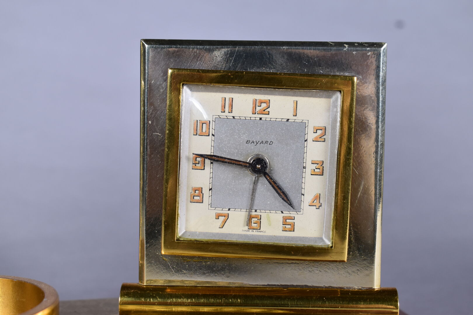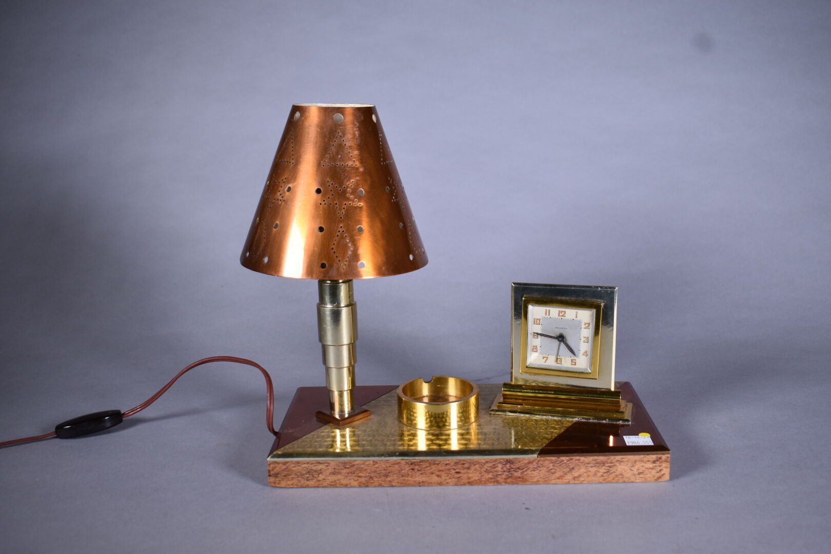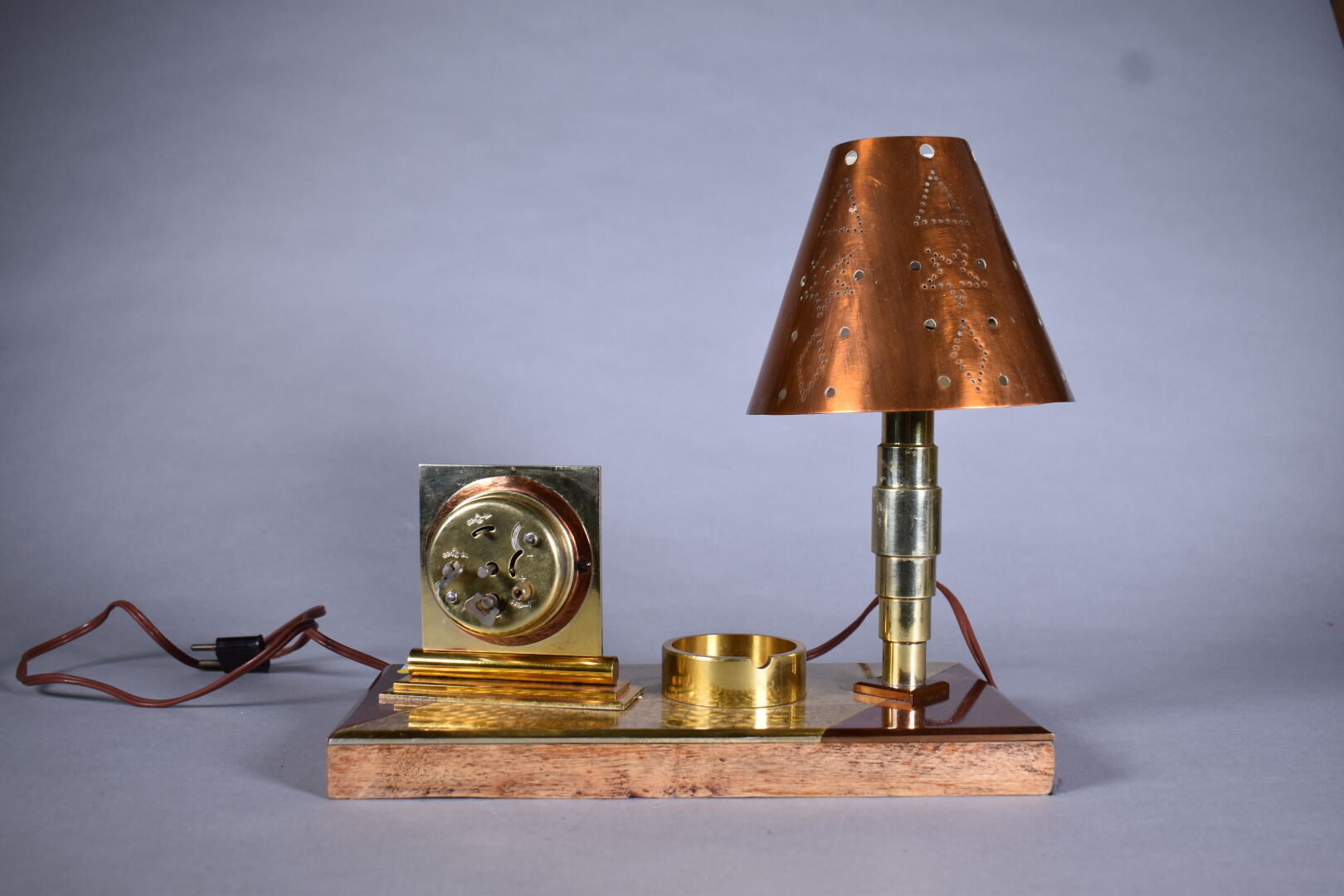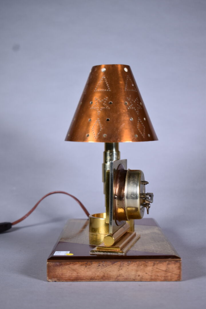 Pendule lampe de bureau en cuivre et bois. Cadran signé BAYARD. Vers 1940. Haut. :28,5 cm – Larg. : 30 cm – Prof. : 15 cm.