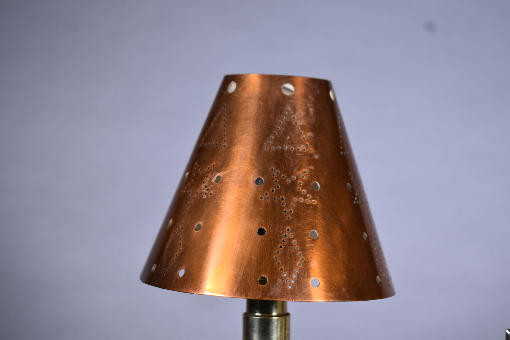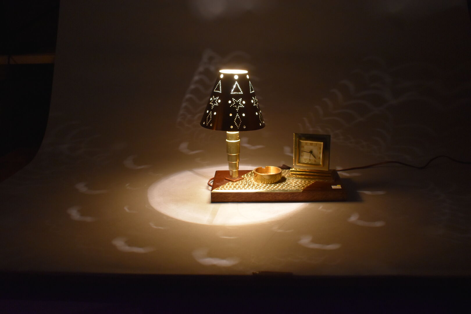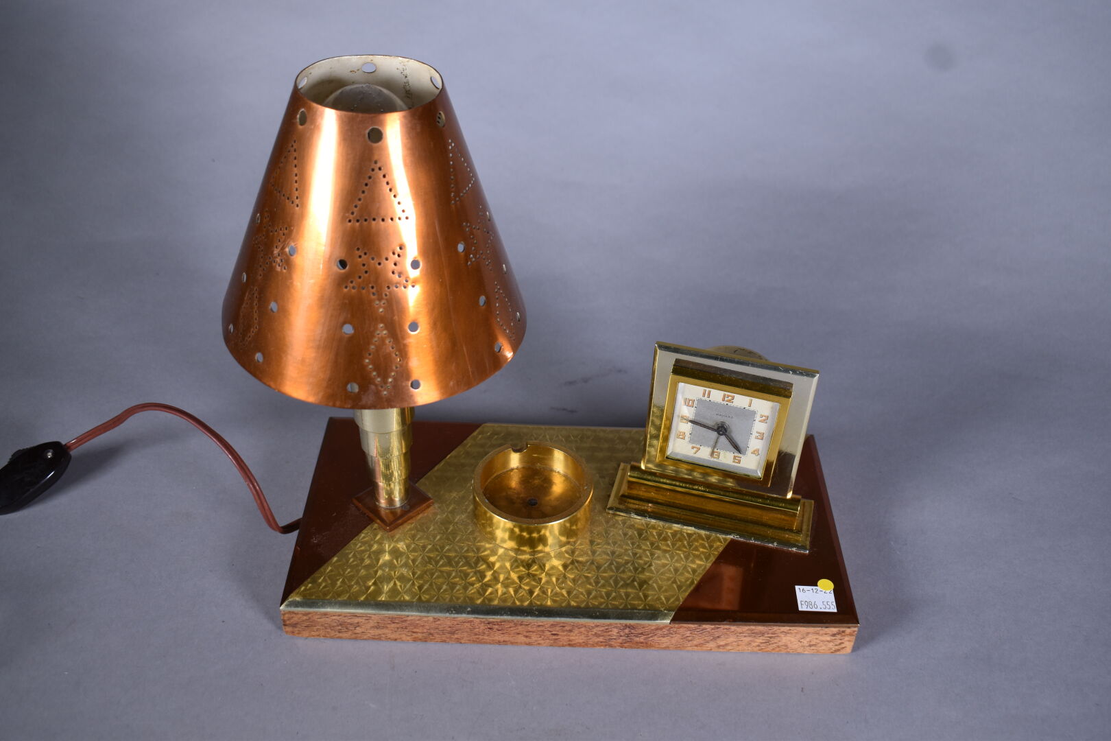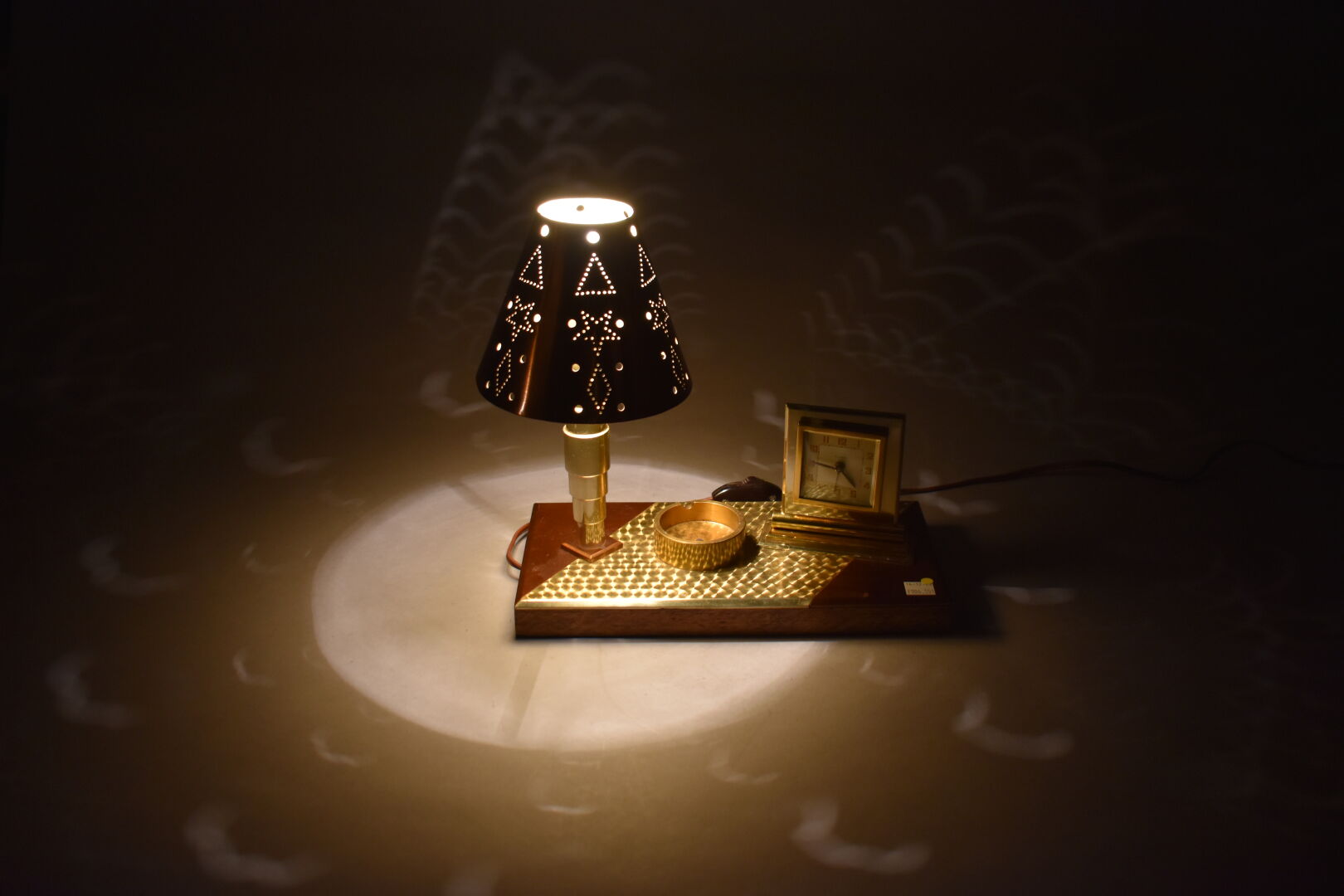 Pendule lampe de bureau en cuivre et bois. Cadran signé BAYARD. Vers 1940. Haut. :28,5 cm – Larg. : 30 cm – Prof. : 15 cm.
