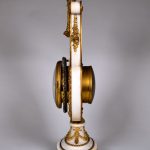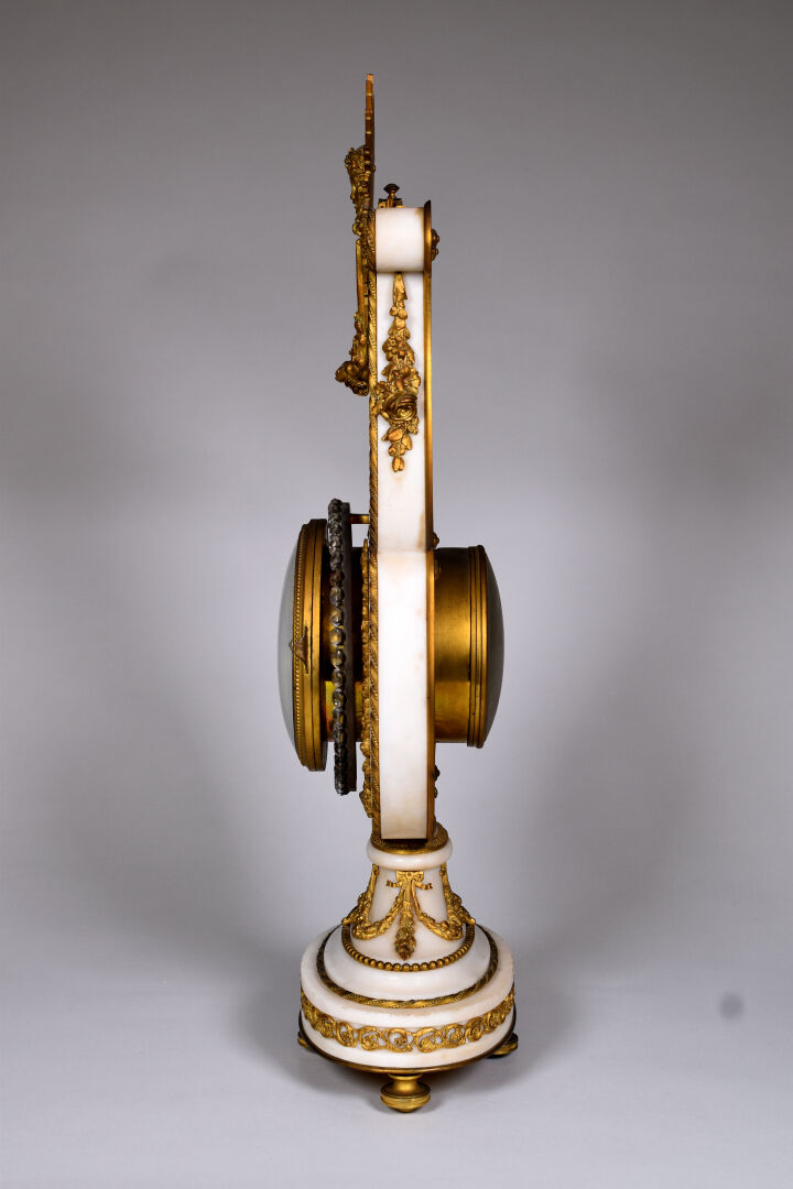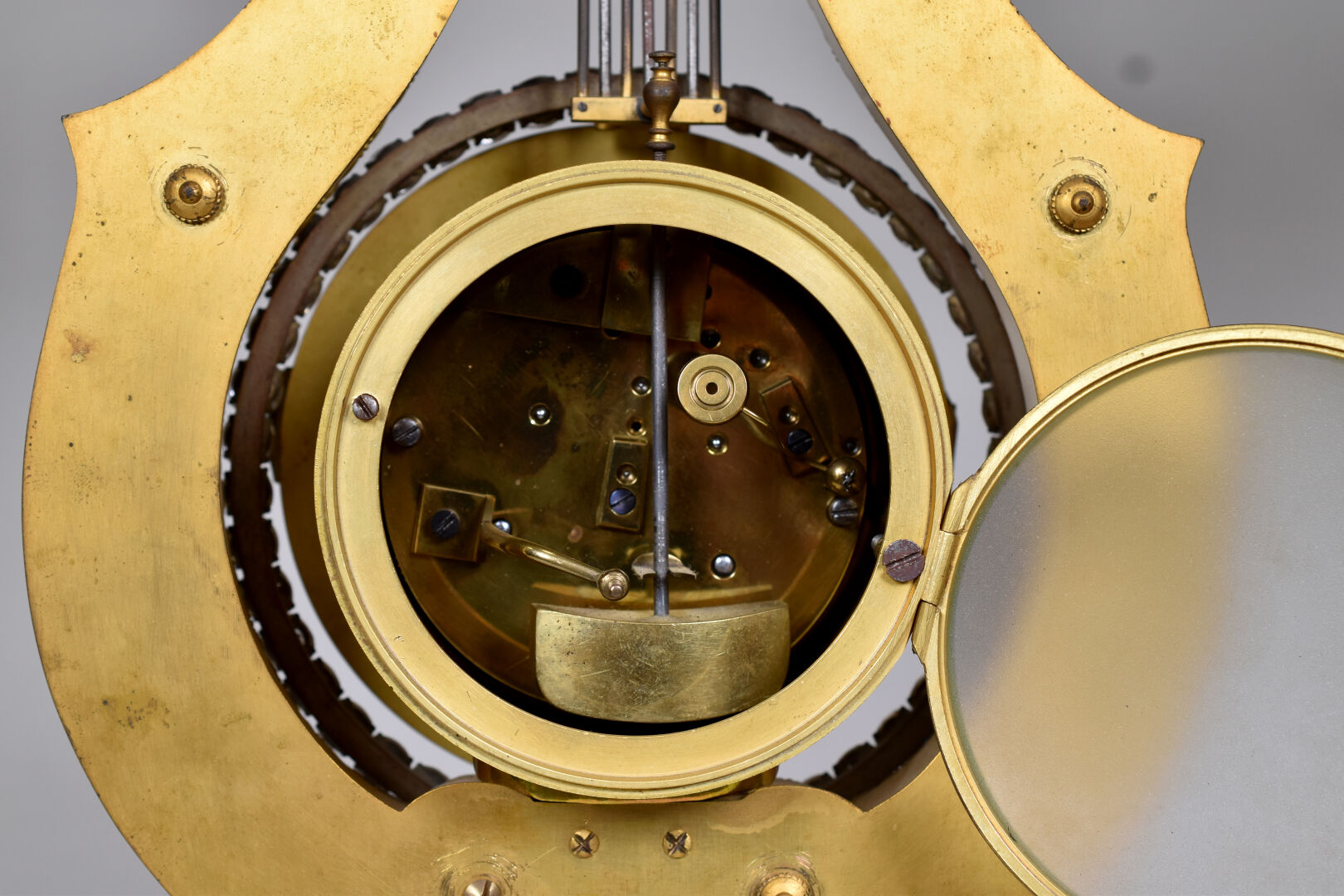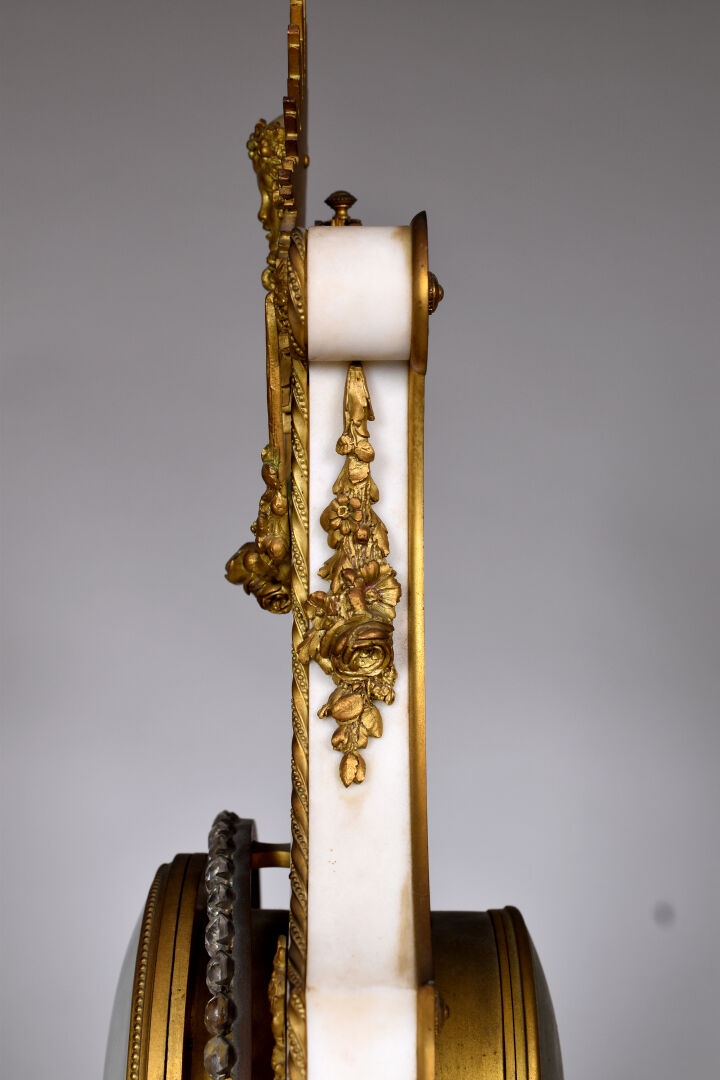 Pendule lyre en marbre blanc, le cadran émaillé à chiffres arabes pour les heures, chemin de fer et pour les minutes. Décor de bronze ciselé tels que masque rayonnant et guirlandes de fleurs. La base ovale reposant sur quatre petits pieds toupies. Balancier oscillant à couronne de verroterie. Style Louis XVI. XIXe siècle. Avec clé. Haut. : 57 cm.