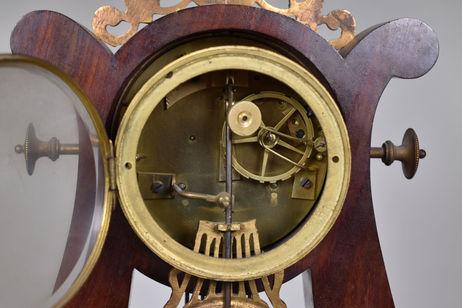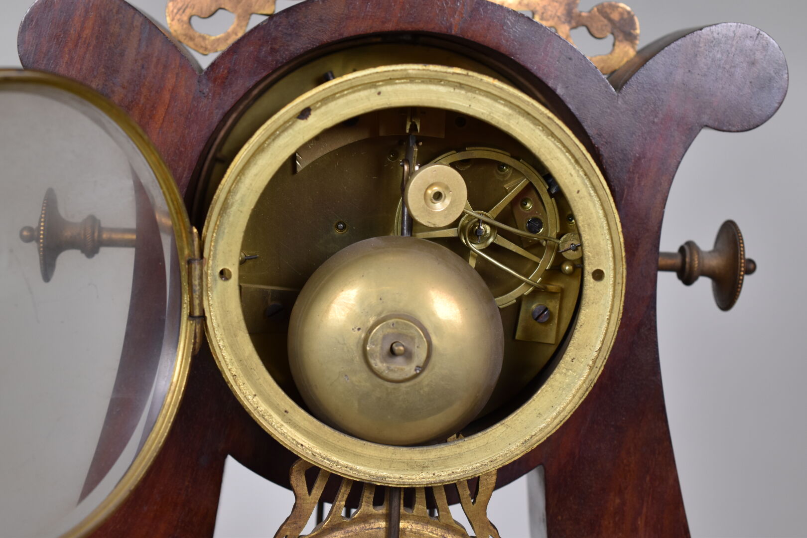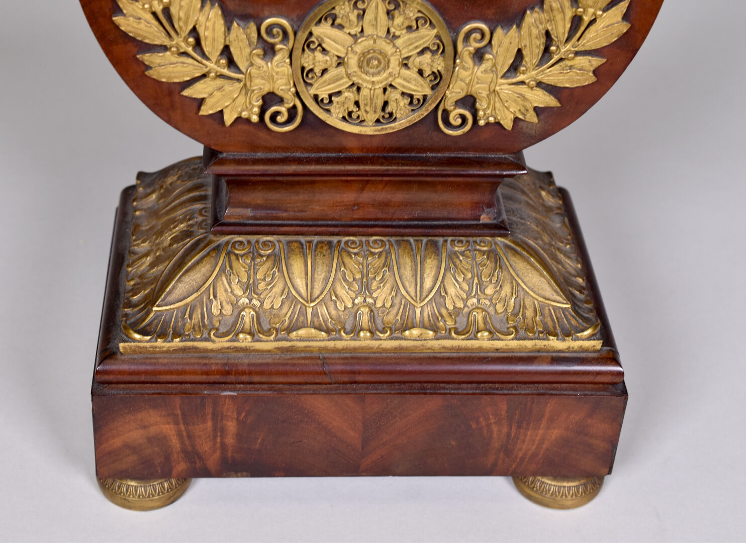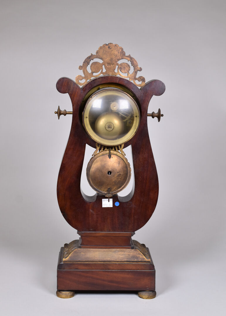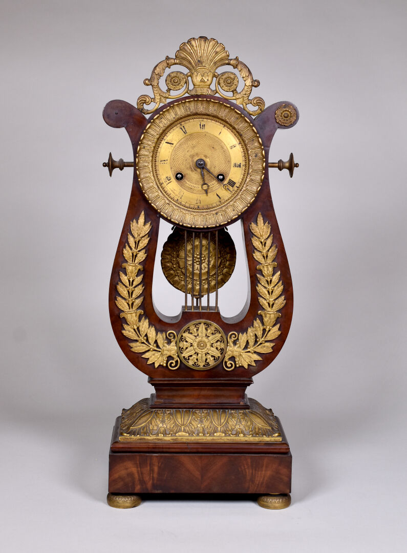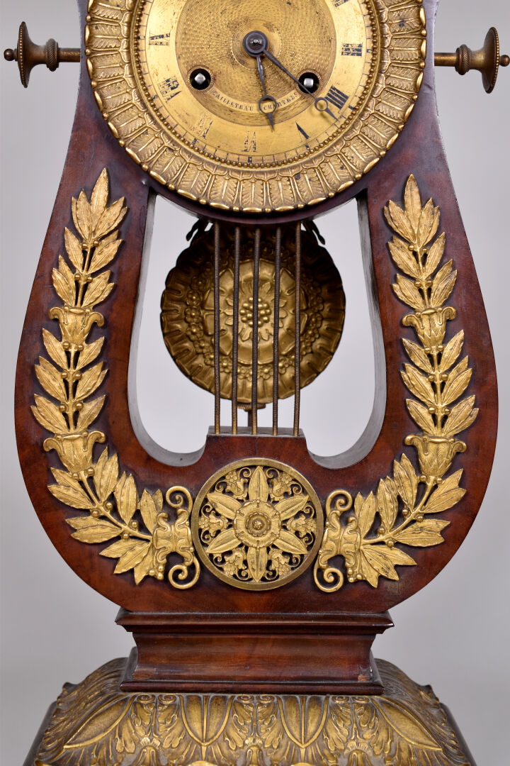 Pendule lyre en placage d’acajou et bronze ciselé doré. Le cadran à chiffres romains métallique signé CAILLETEAU à Chartres (usures). Pietement boule en bronze. Ornementation de bronzes en applique, feuilles de laurier, feuilles d’eau, palmettes. Vers 1830. Avec balancier et clé. Haut. : 50 cm.