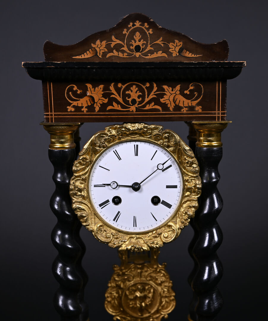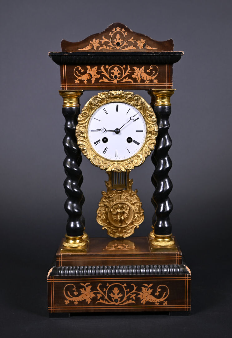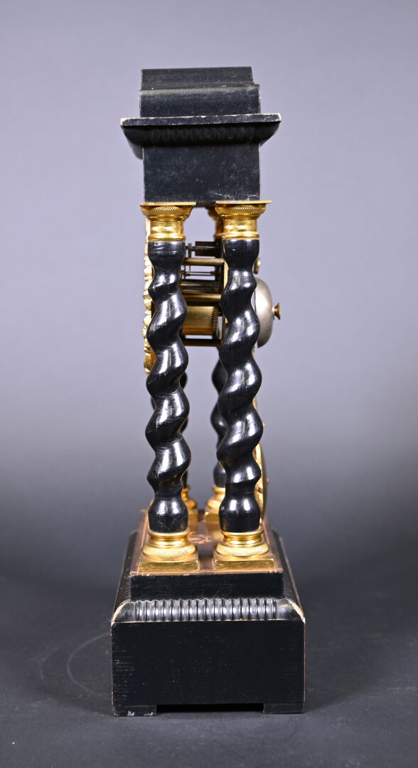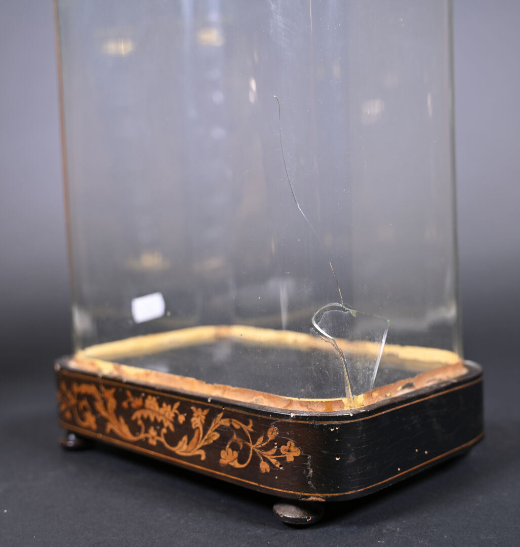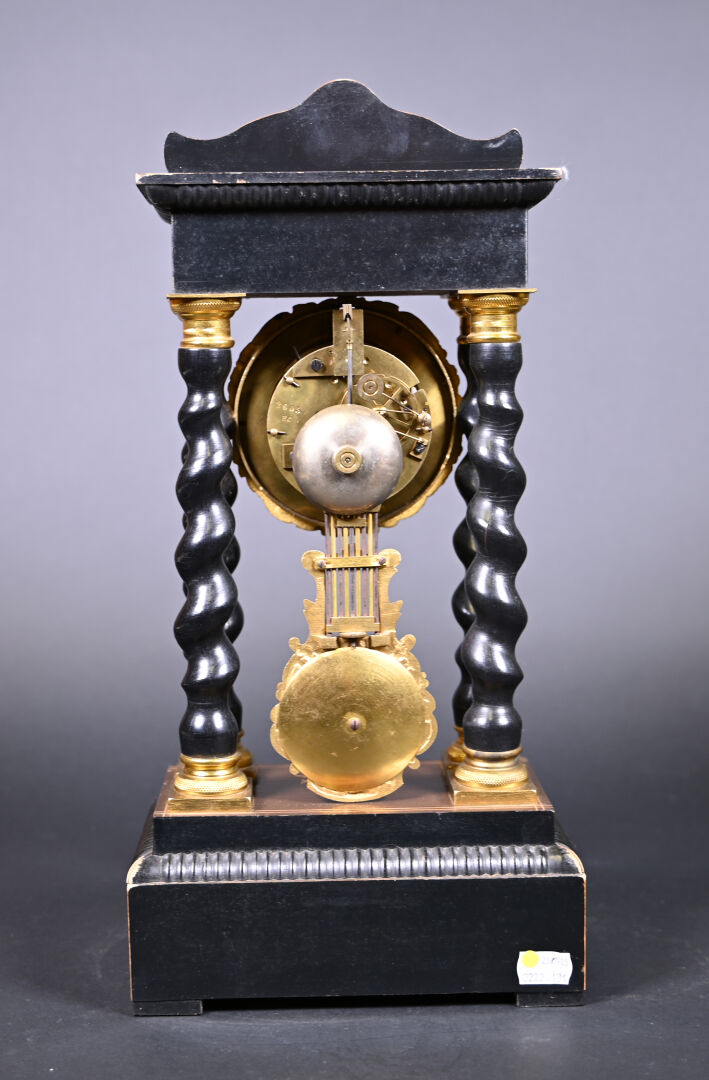 Pendule portique en bois de placage, bois blond et bois noirci à colonnes torsadées (éclats). Cadran émaillé chemin à chiffres romains pour les heures en noir sur fond crème, chemin de fer (éclats, absence de clef). Haut. : 45 cm – Larg. : 22 cm – Prof. : 13 cm. On joint un globe avec socle en bois noirci (accidenté). Dim. du globe : 57 x 27,5 x 17,5 cm.