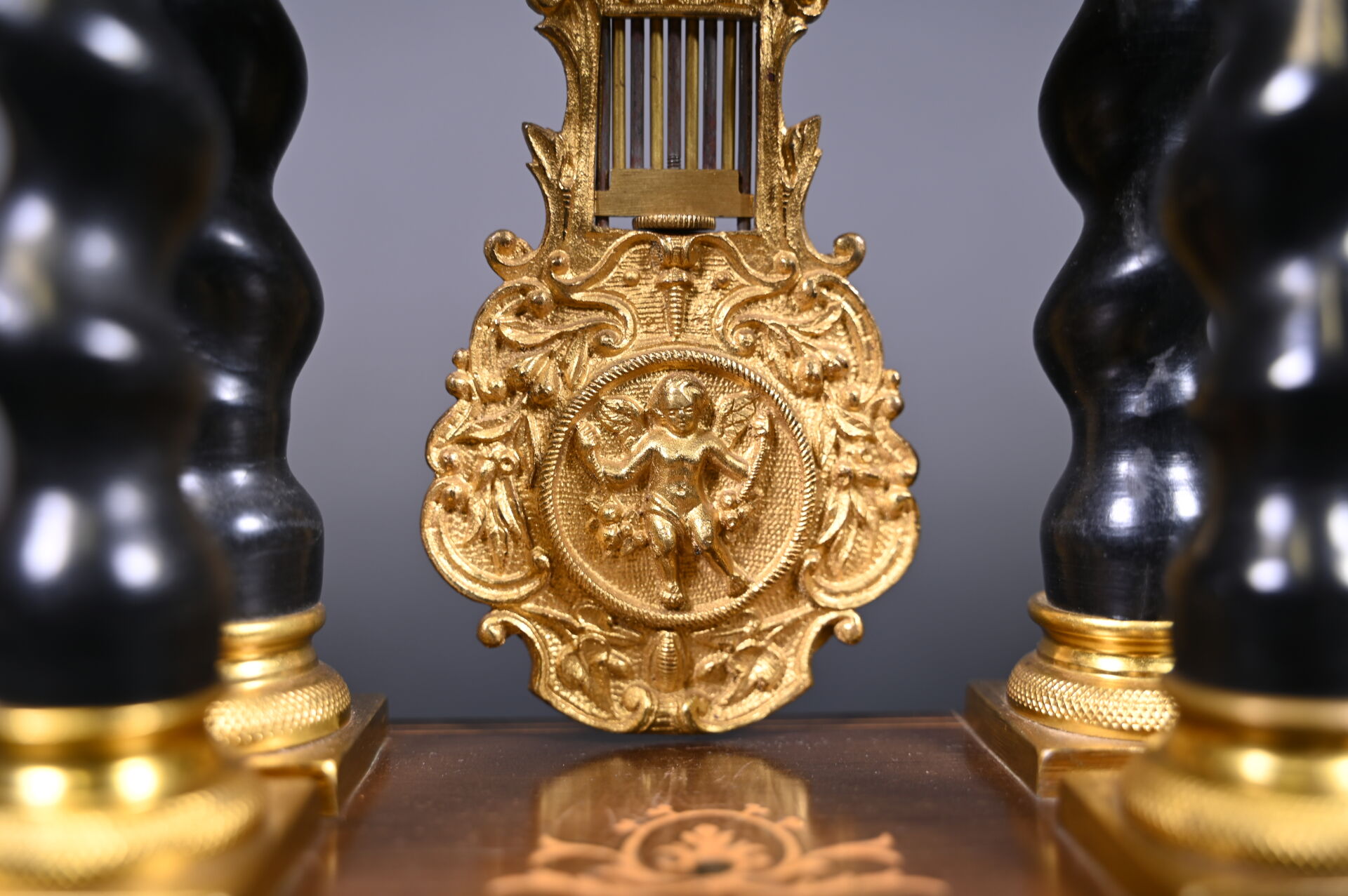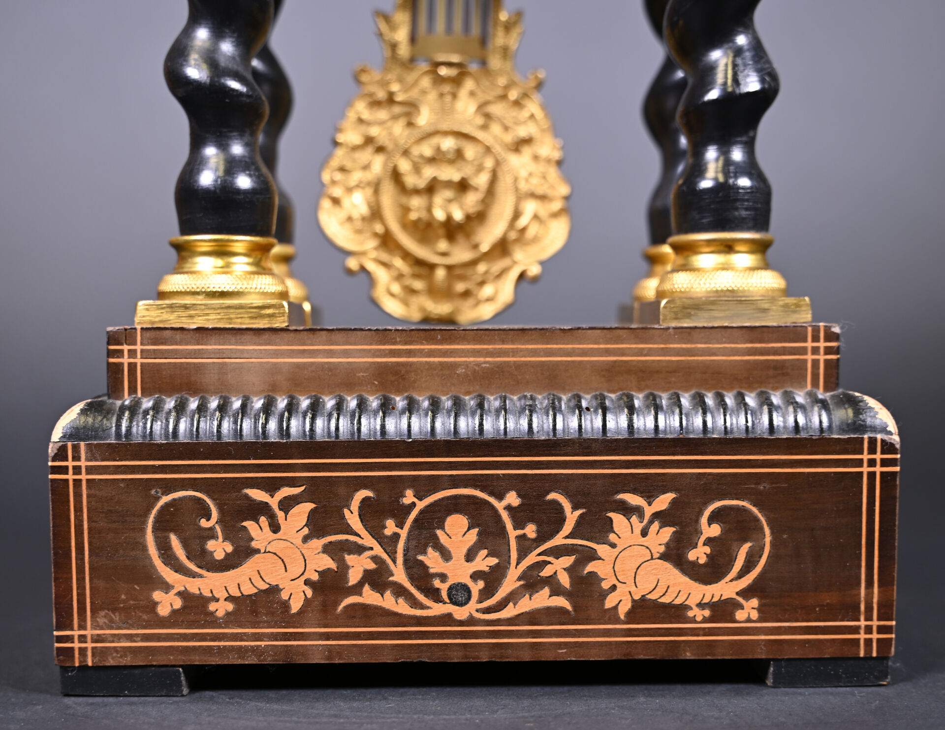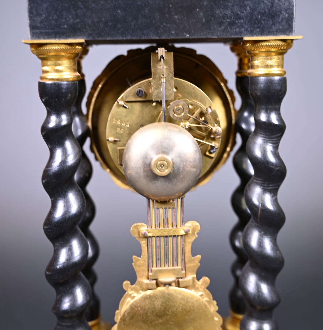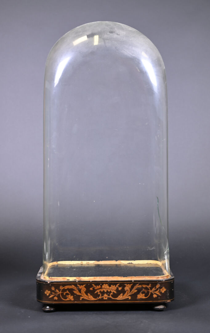 Pendule portique en bois de placage, bois blond et bois noirci à colonnes torsadées (éclats). Cadran émaillé chemin à chiffres romains pour les heures en noir sur fond crème, chemin de fer (éclats, absence de clef). Haut. : 45 cm – Larg. : 22 cm – Prof. : 13 cm. On joint un globe avec socle en bois noirci (accidenté). Dim. du globe : 57 x 27,5 x 17,5 cm.