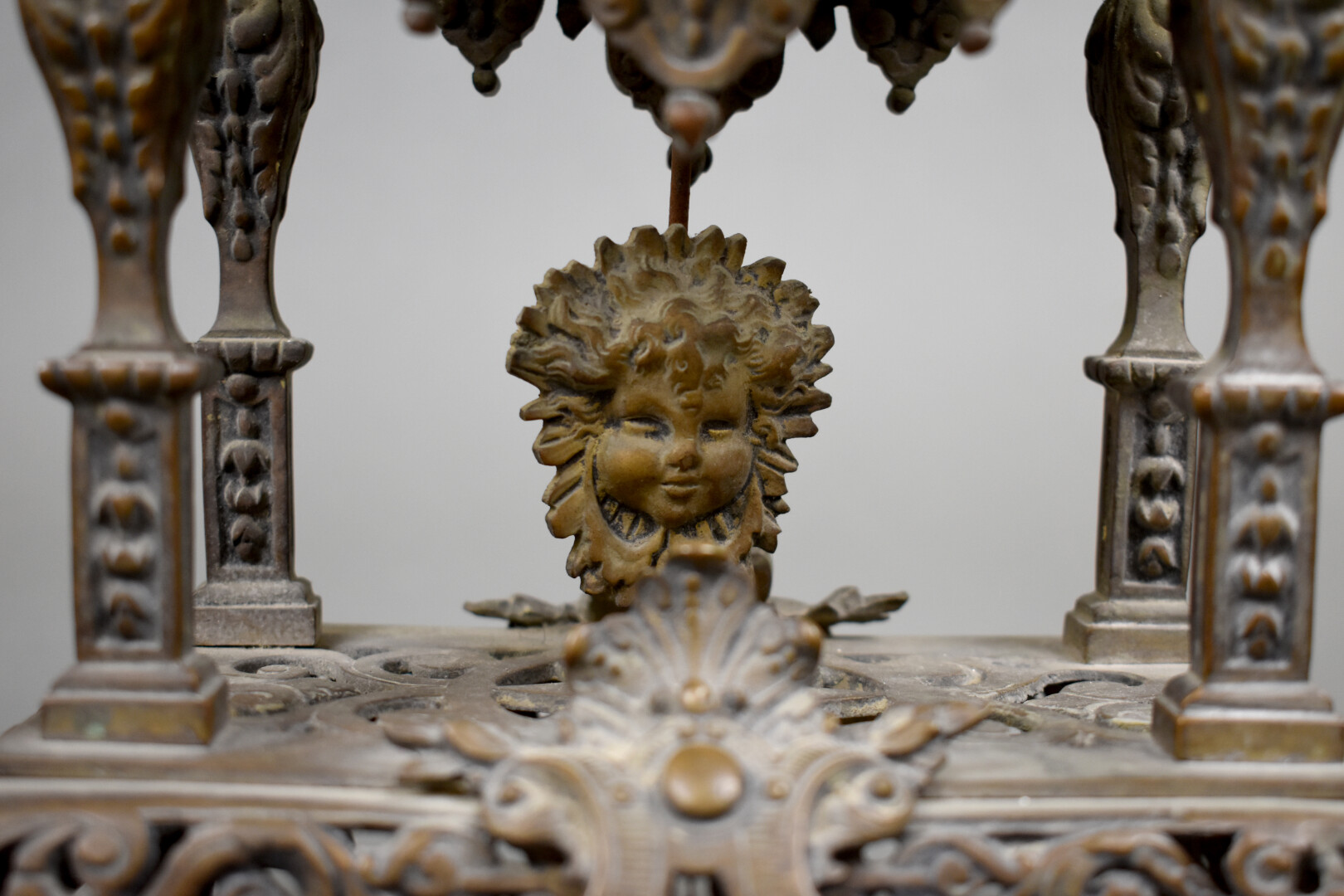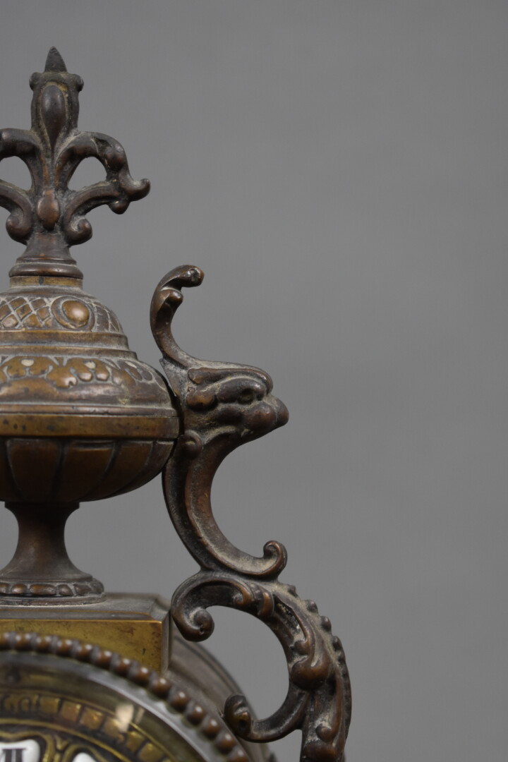 Pendule portique en laiton à décor d’entrelacs ajourés. Le cadran à cartouches émaillés de chiffres romains. Fin du XIXe siècle. Haut. : 39 cm.