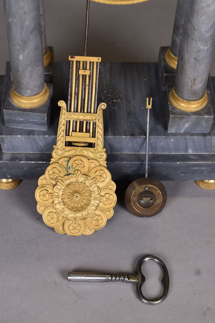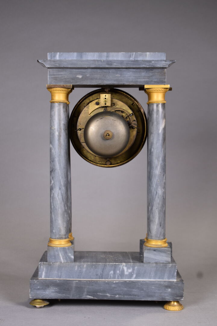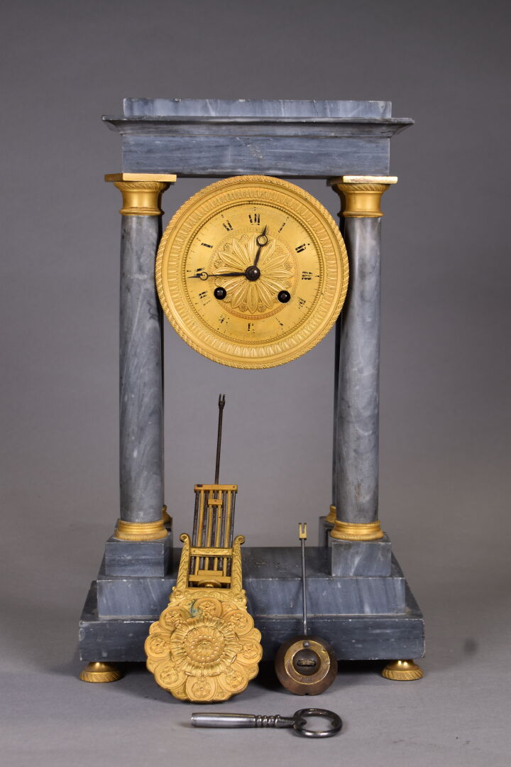 Pendule portique en marbre bleu turquin. Cadran à fond de bronze, chiffres romains en noir pour les heures. Petits pieds boule (usures et égrenures). Avec clé et balancier. Milieu du XIXe siècle. Haut. : 37 cm.