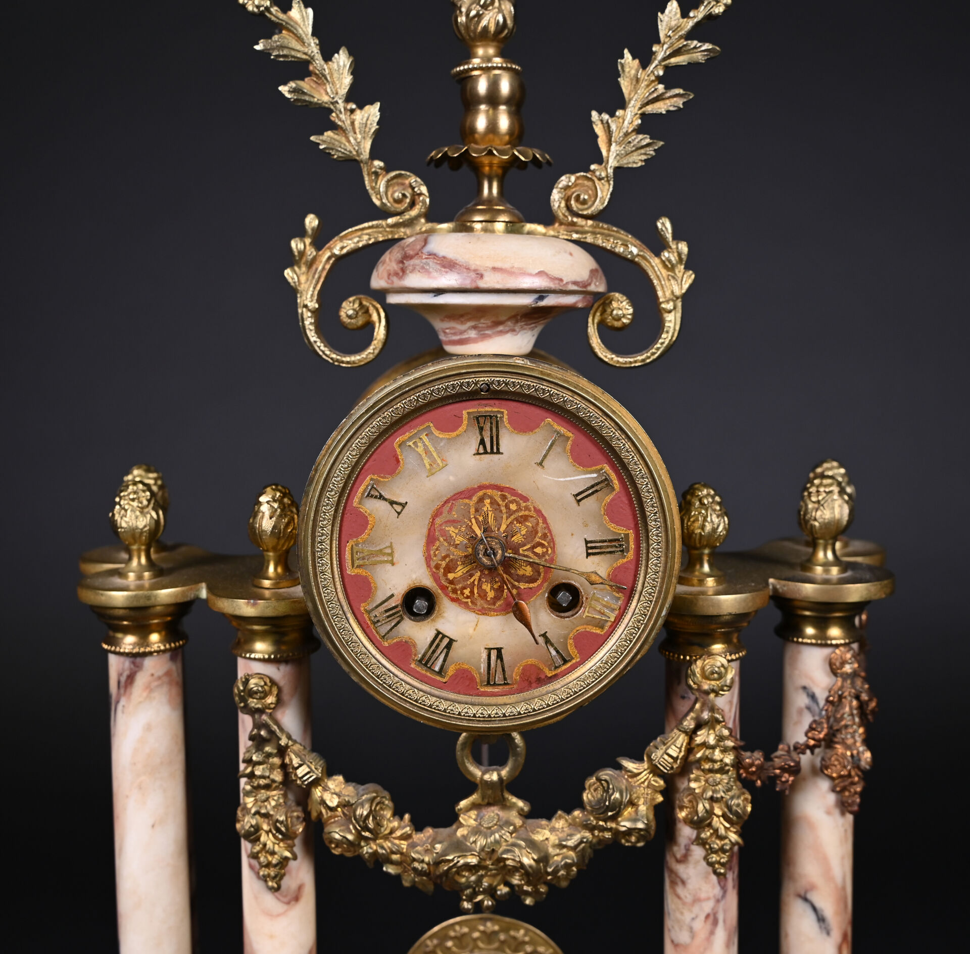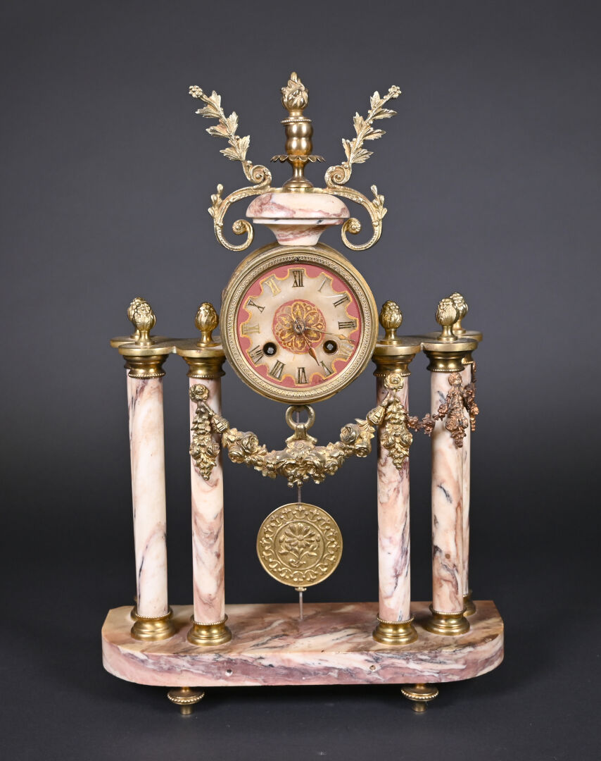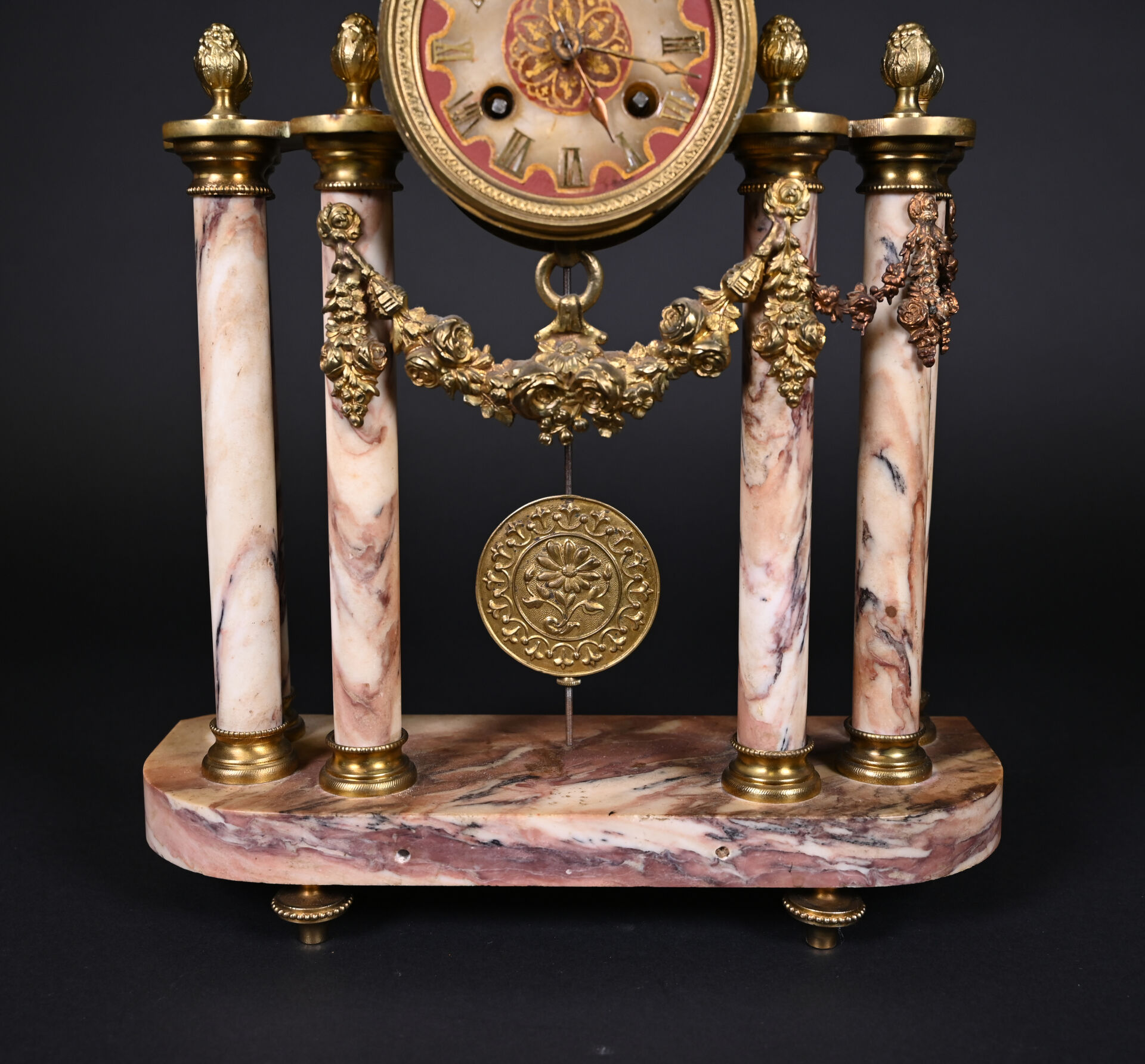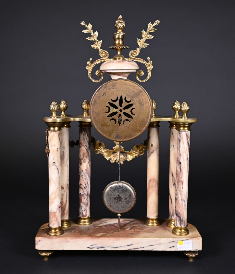 Pendule portique en marbre rose et beige. Cadran à chiffres romains en doré sur fod beige et rouge (manquent des ornements de bronze). Avec clé, balancier probablement rapporté. Fin du XIXe ou début du XXe siècle. Haut. : 42 cm – Larg. : 29 cm – Prof. : 13 cm.
