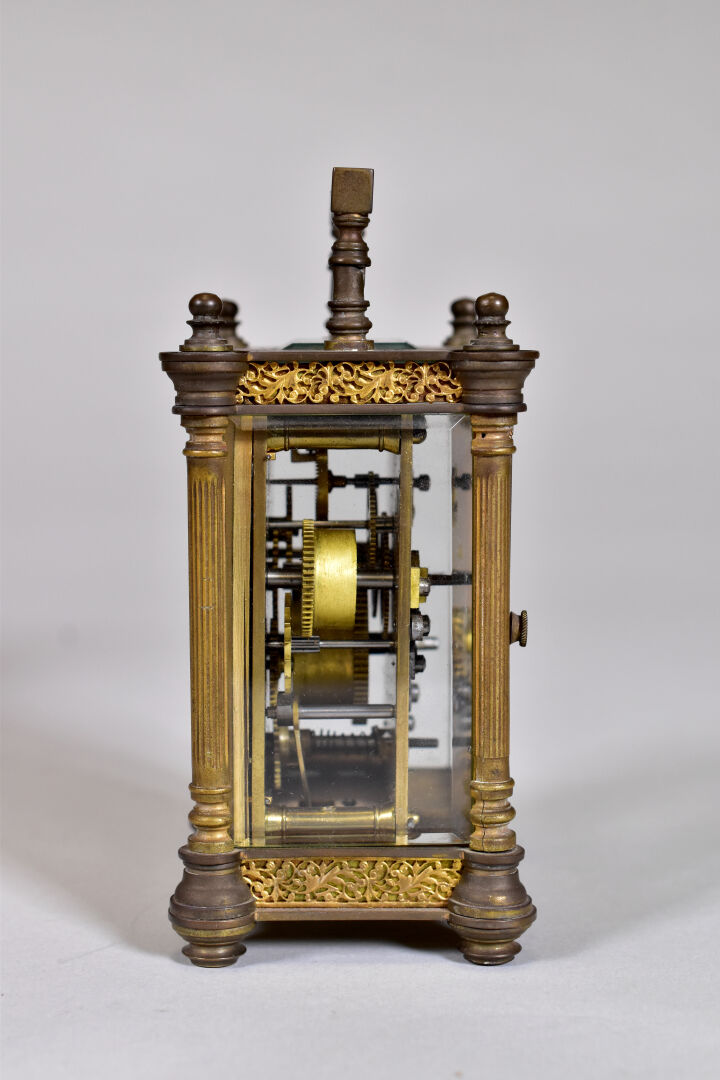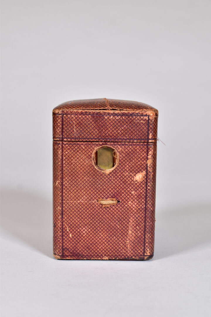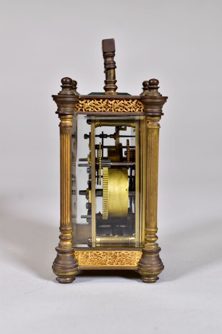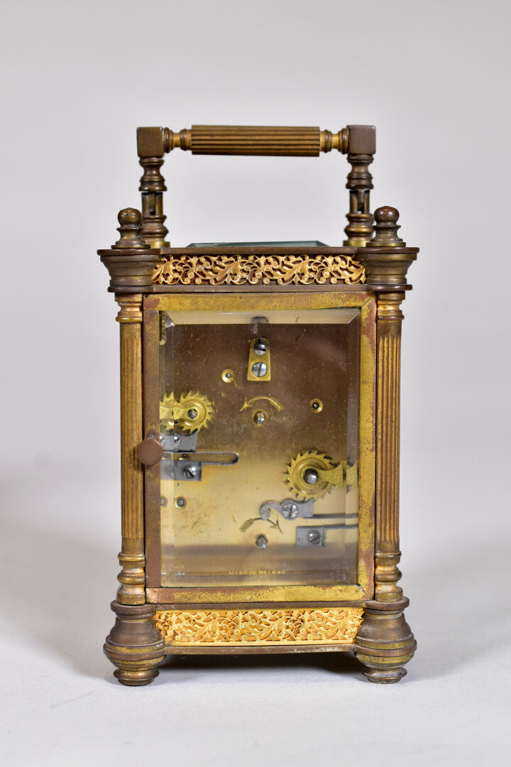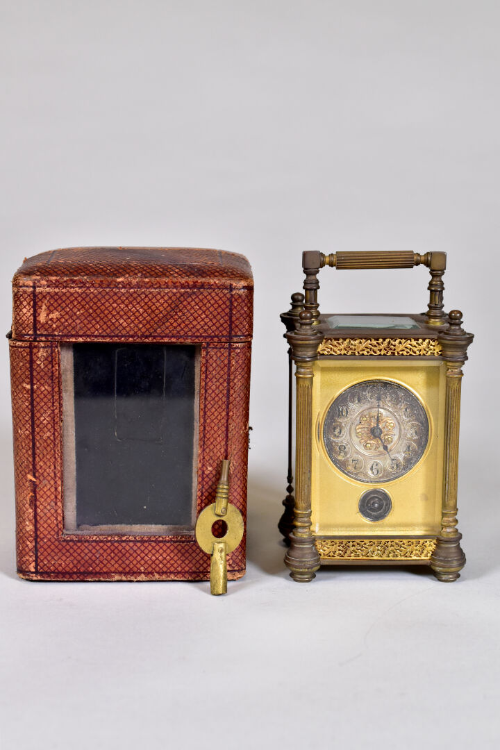 Pendulette dite d’officier en laiton. Haut. : 13 cm. Avec son coffret. Fin du XIXe siècle.