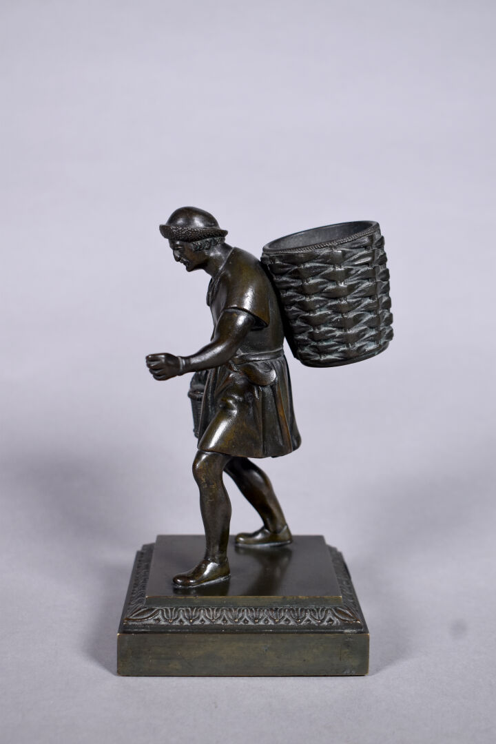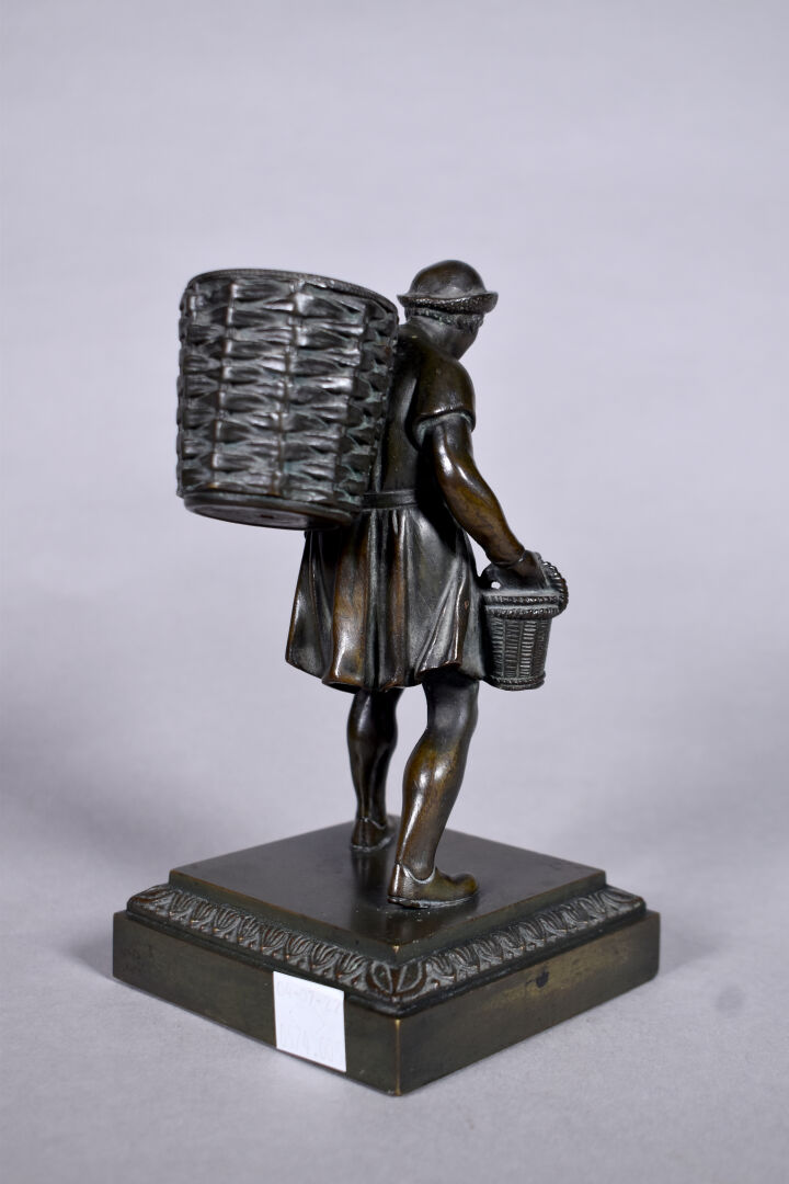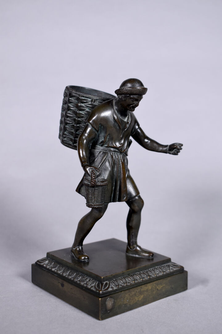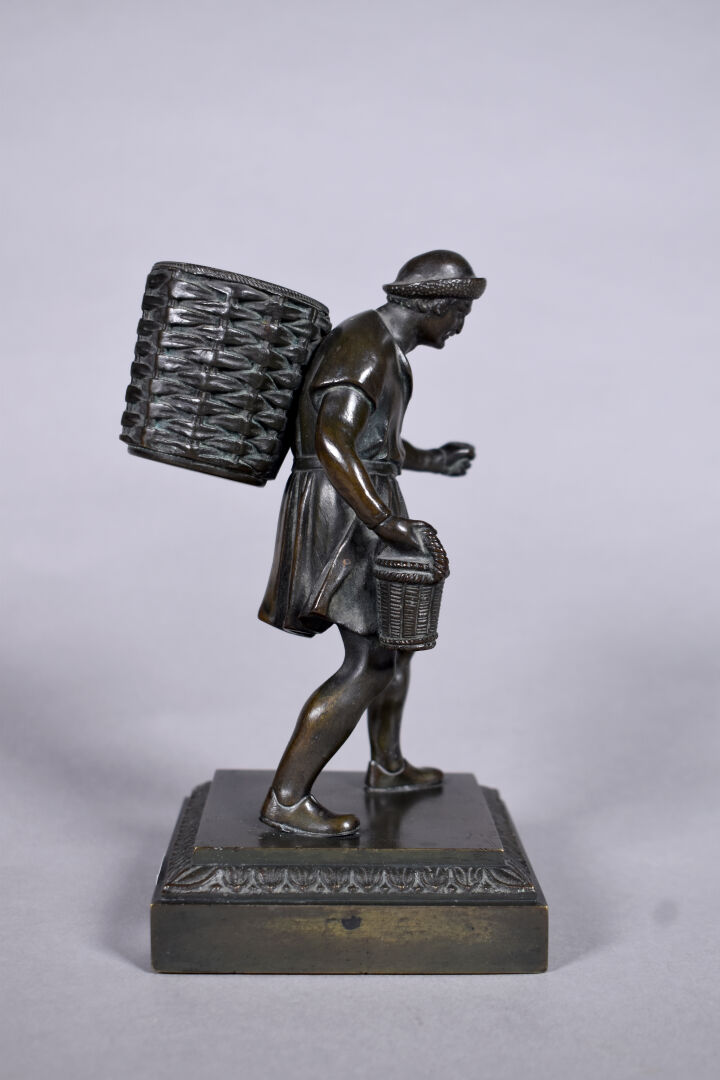 Petit bronze à patine brun figurant un homme tenant un panier. Haut. : 16 cm.