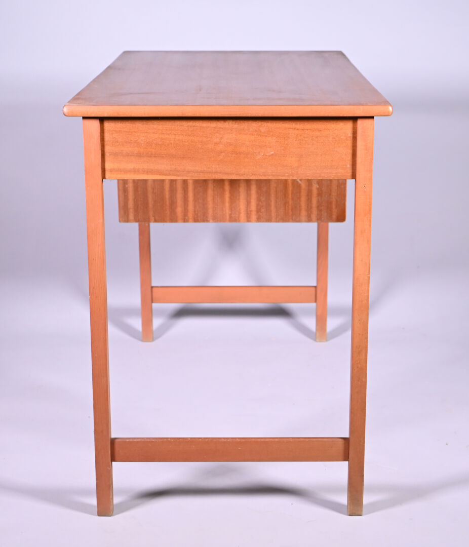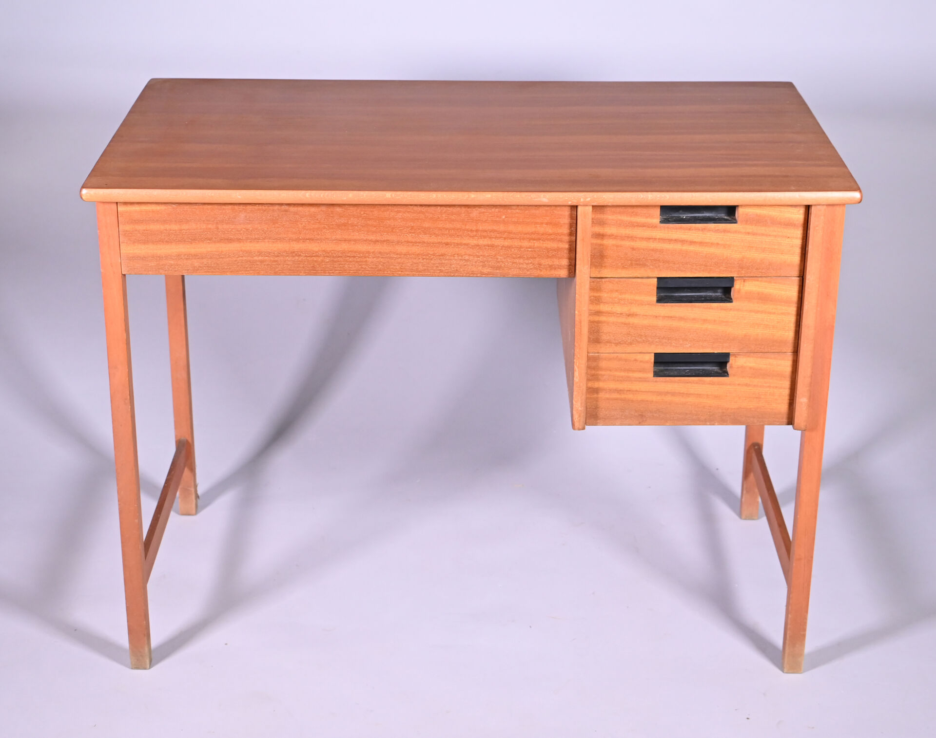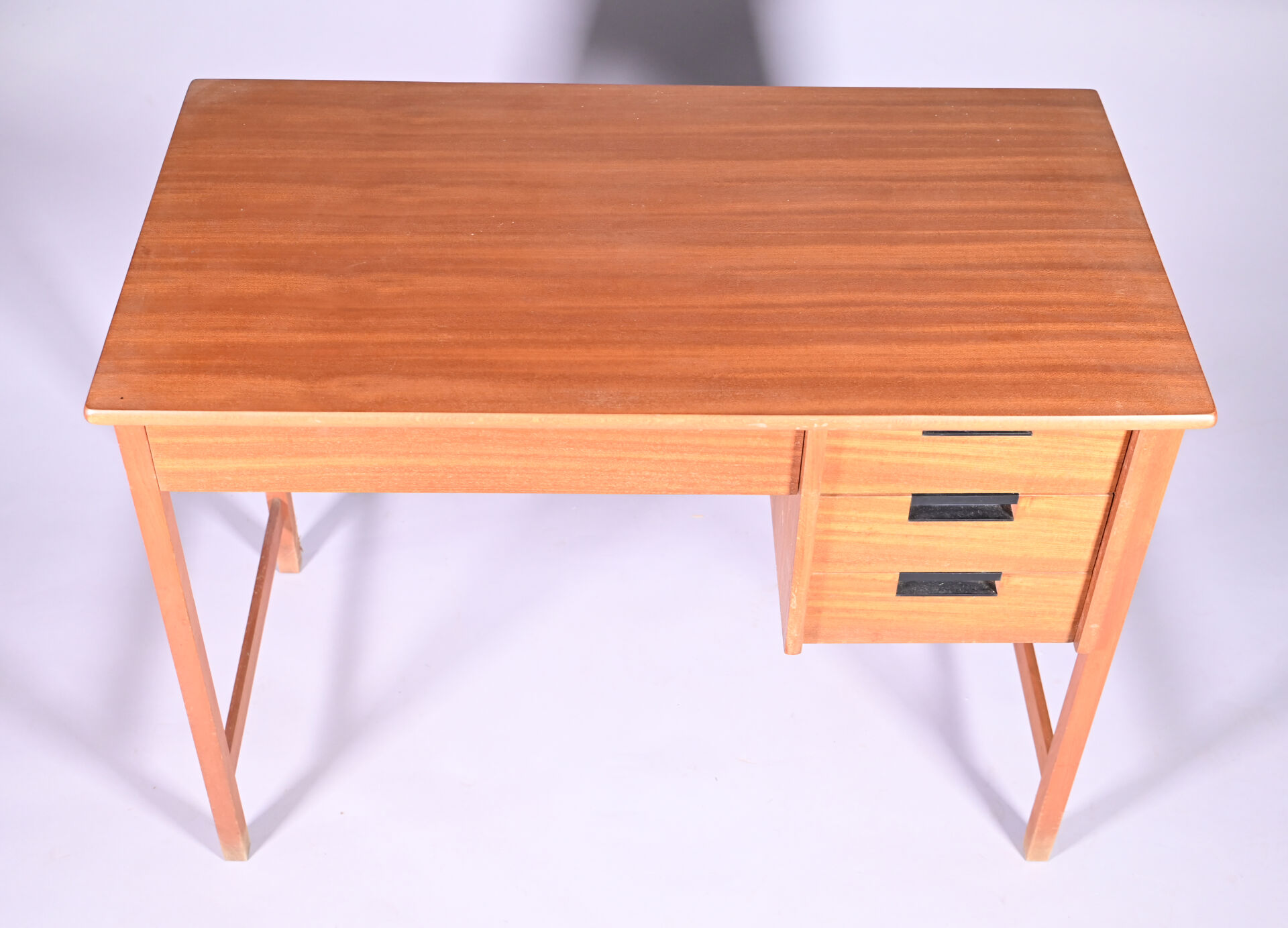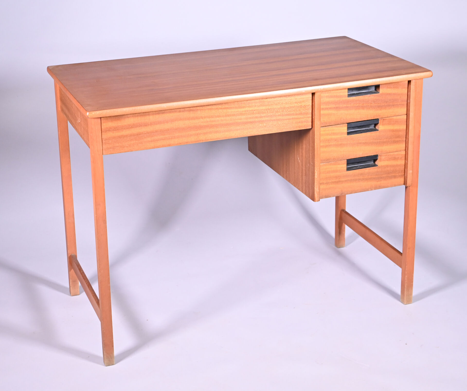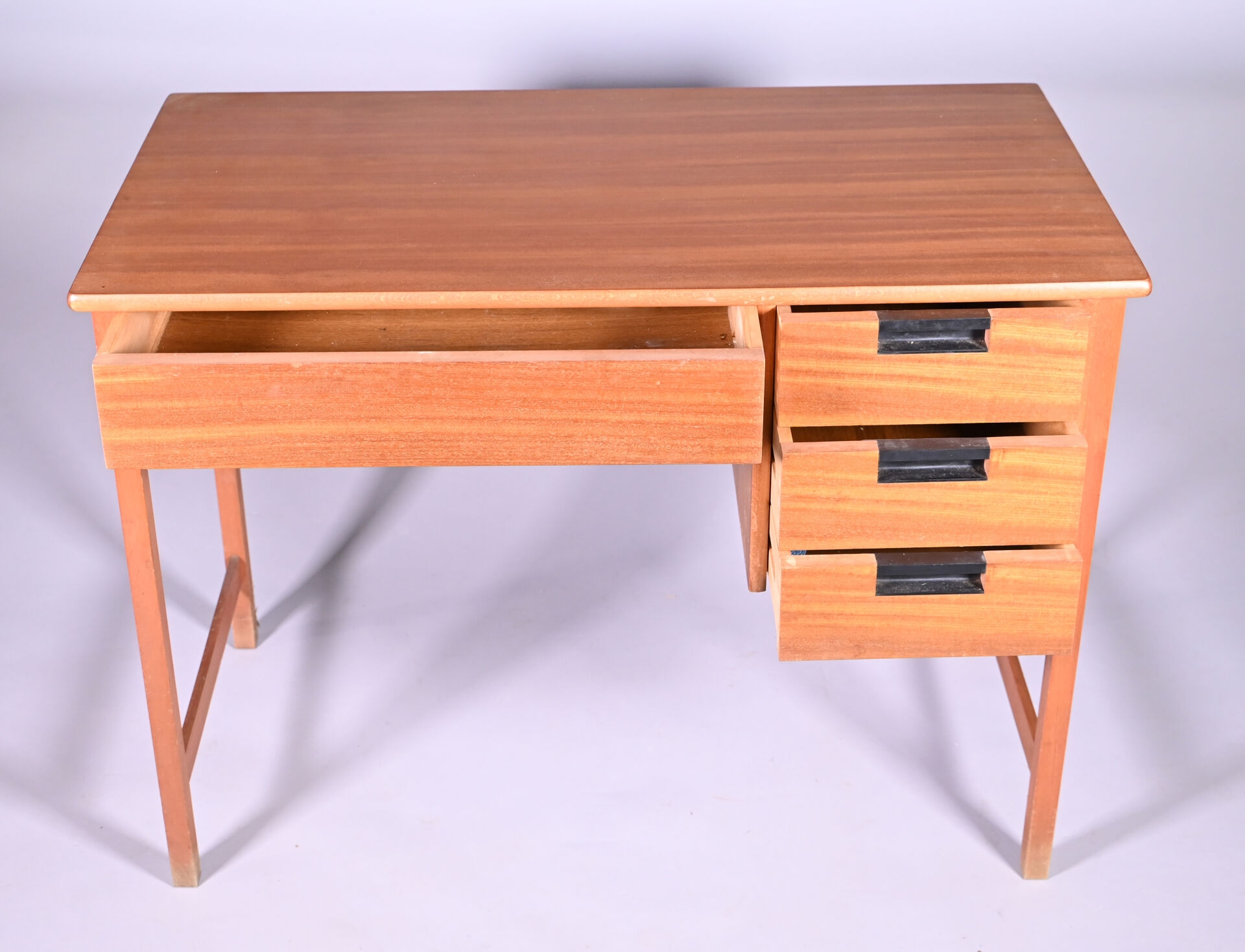 Petit bureau à caisson en acajou ouvrant à 4 tiroirs sur 3 rangs. Travail probablement scandinave, vers 1960/ 1970. Haut. : 73 cm – Larg. : 98 cm – Prof. : 53 cm.