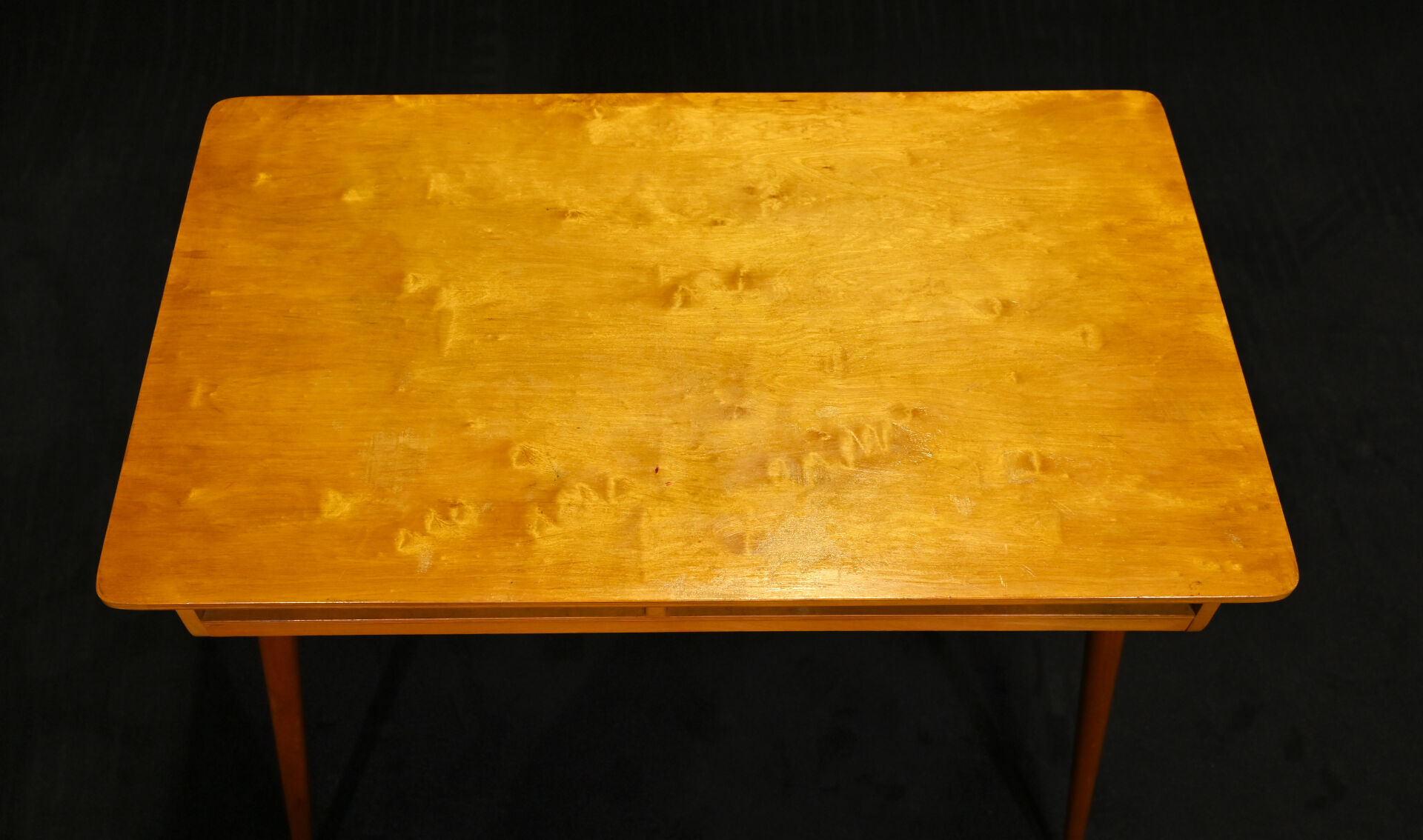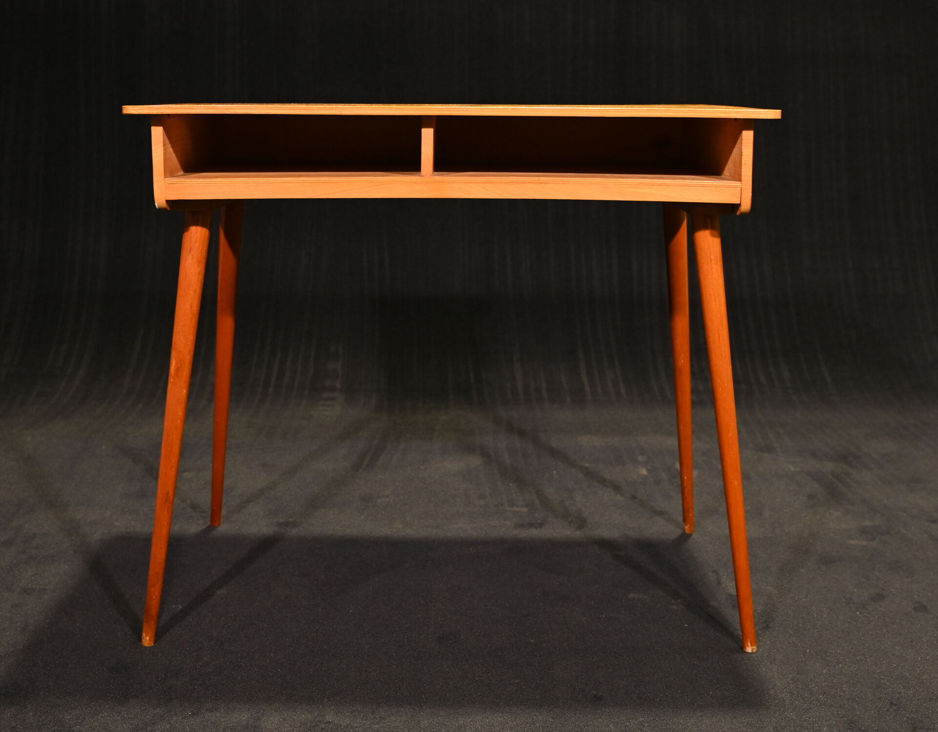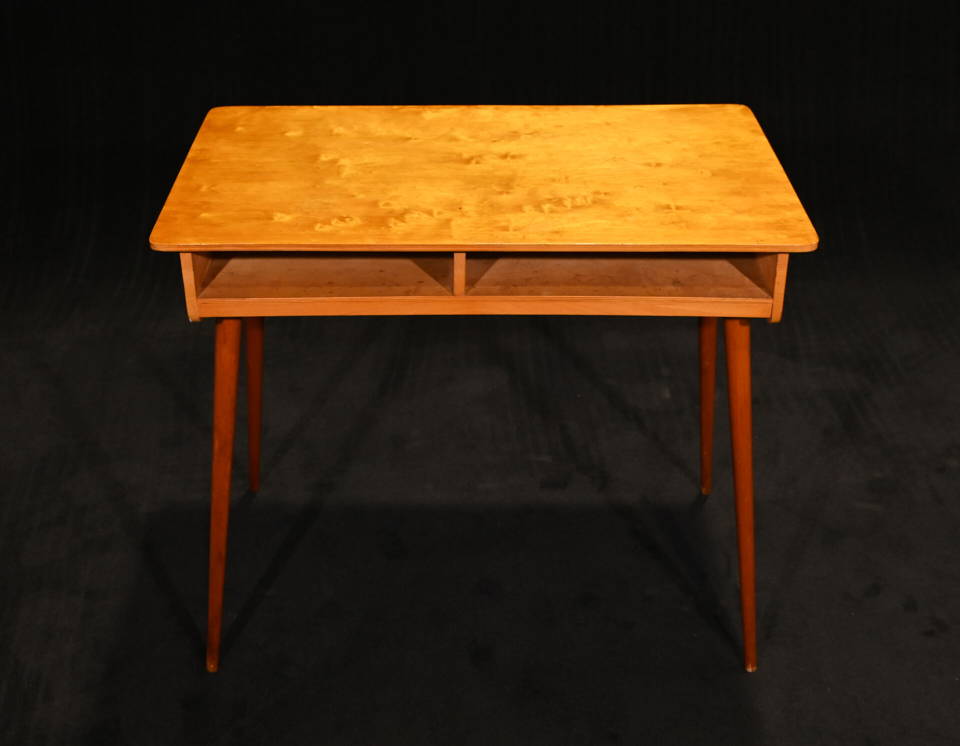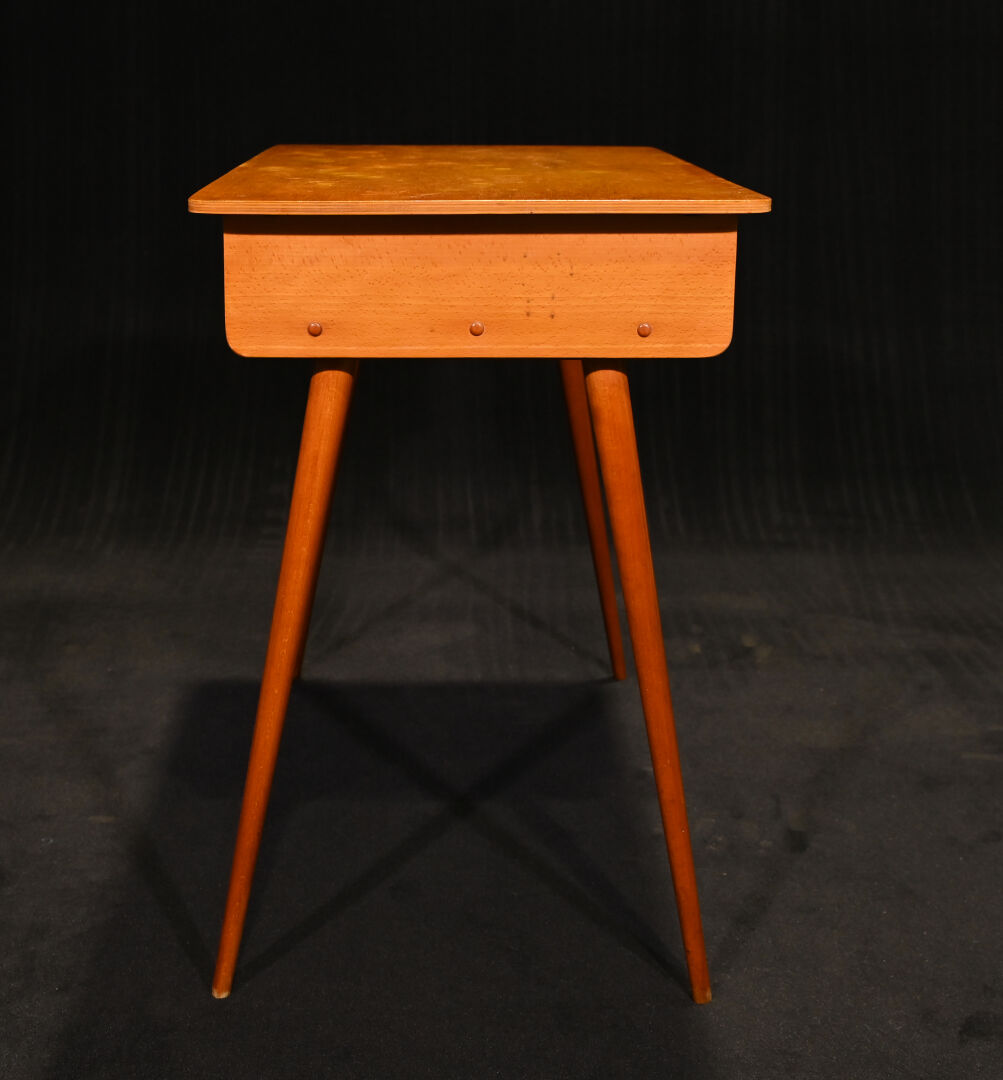Petit bureau (d’enfant ?) en placage de bois blond et pieds compas. Le plateau abritant deux niches (quelques usures d’usage). Vers 1960. Haut. : 75,5 cm – Larg. : 86 cm – Prof. : 50 cm.