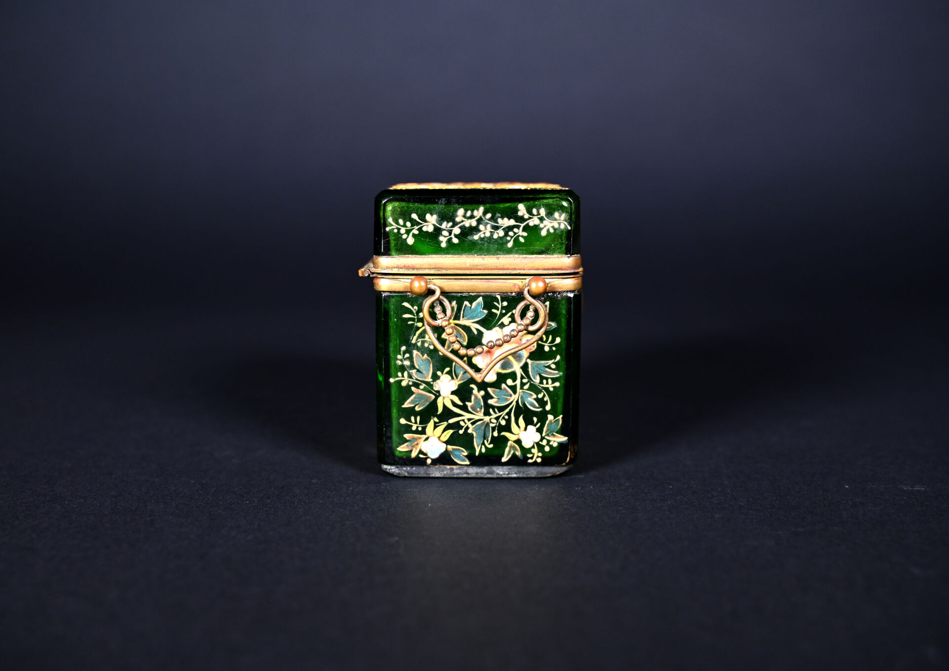 Petit coffre en verre vert à décor émaillé en polychomie de fleurs et végétaux et dorure (un fèle de cuisson, sans la clé). Fin du XIXe ou début du XXe siècle. Haut. : 9,2 cm.