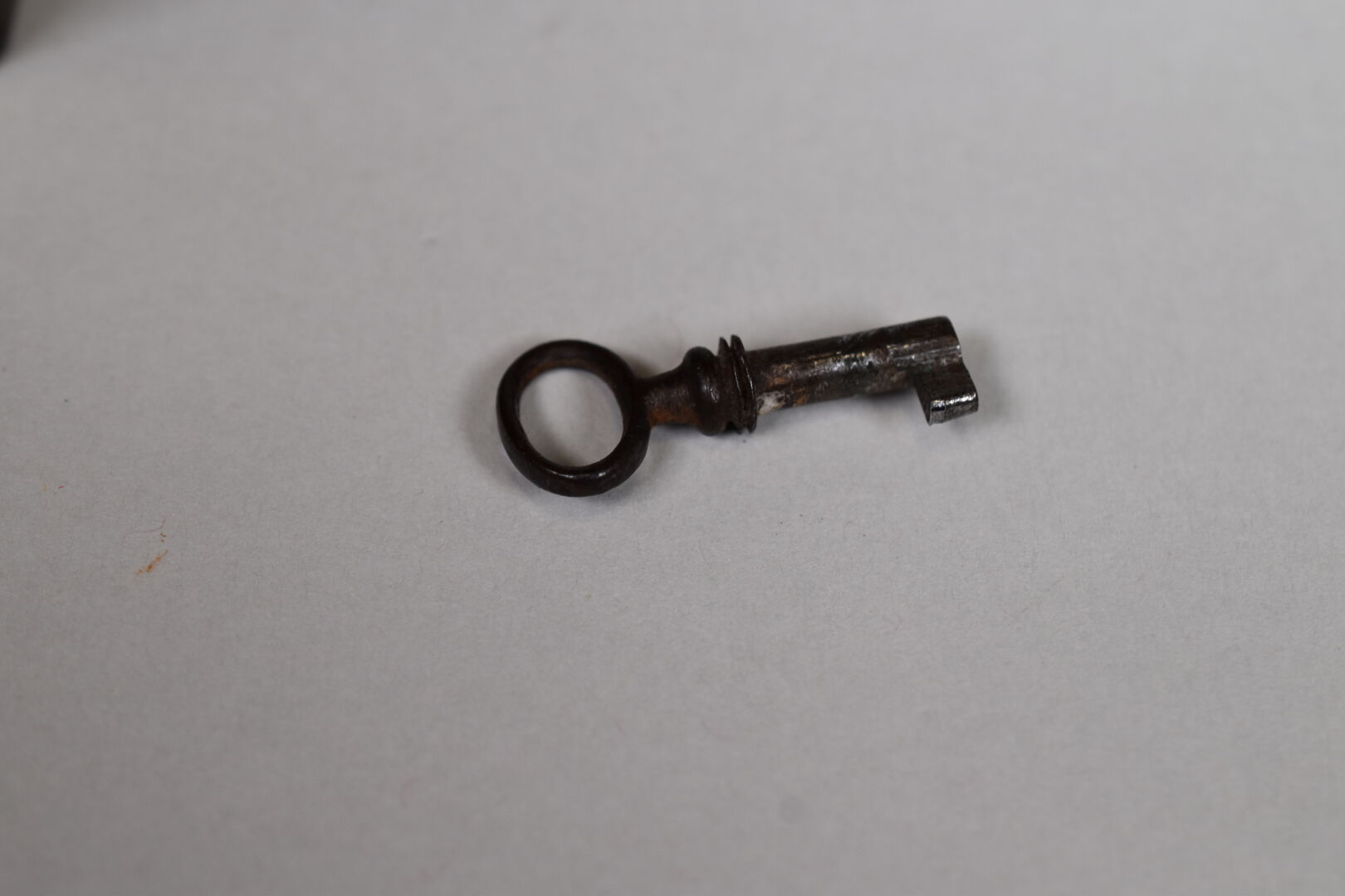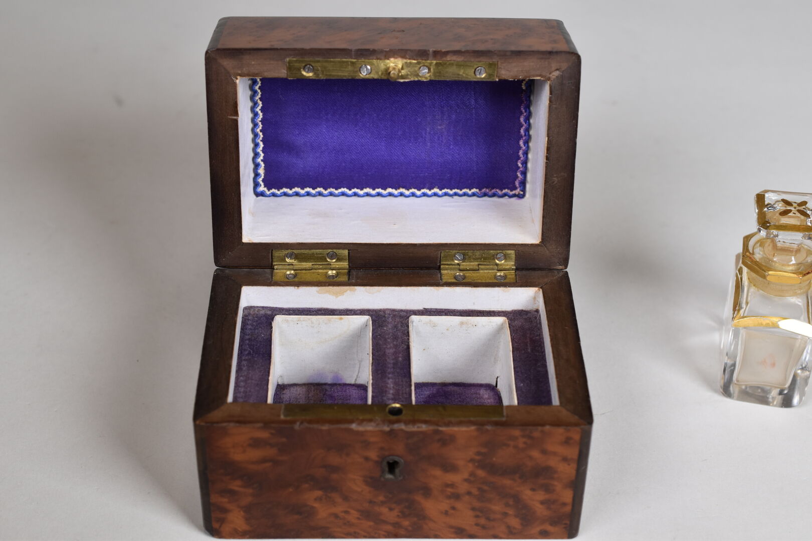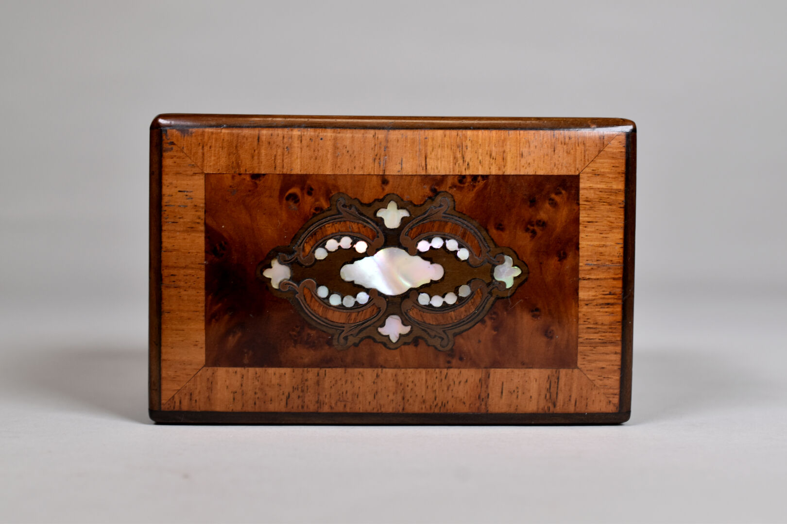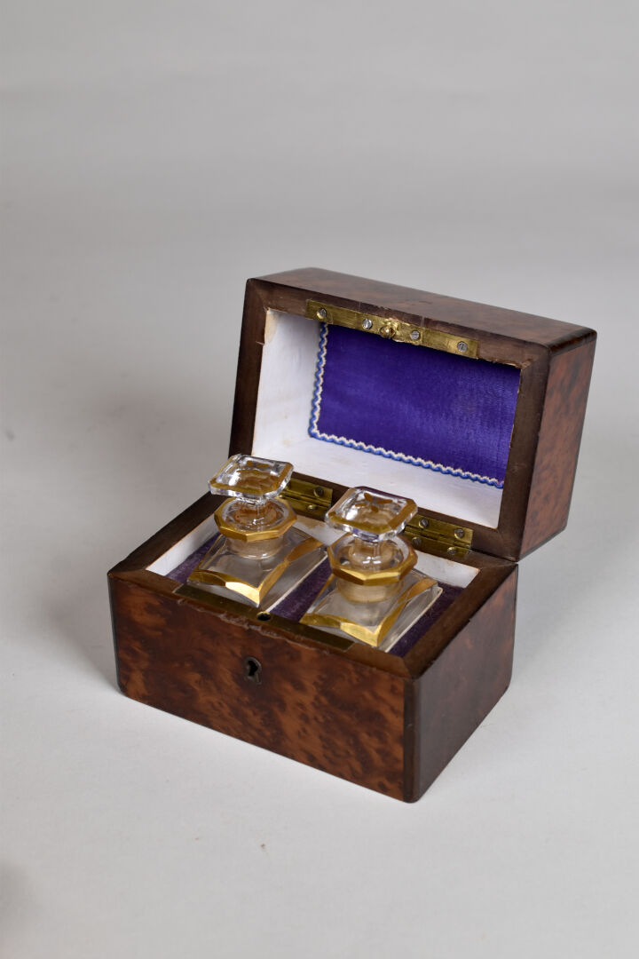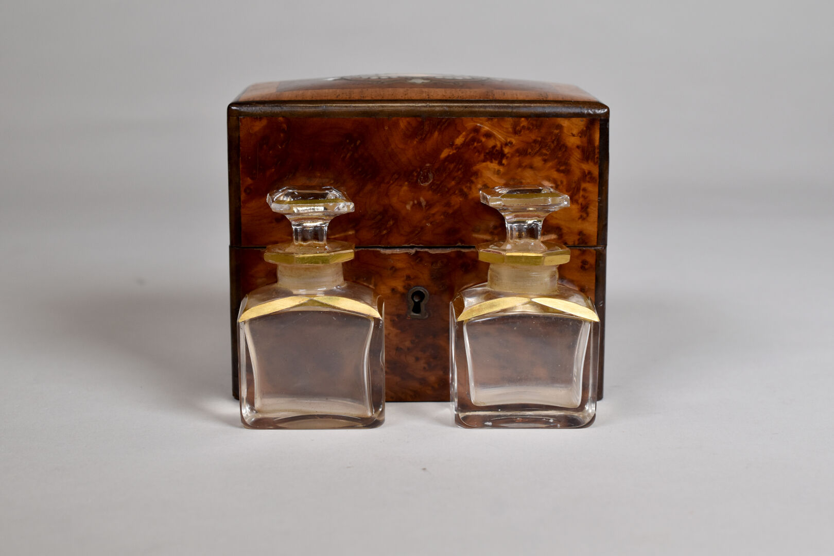 Petit coffret en placage de loupe et bois de rose à décor incrusté de nacre. Il contient deux petits flacons et leurs bouchons en cristal clair à liseré or (petites égrenures). Avec clé. Fin du XIXe ou début du XXe siècle.