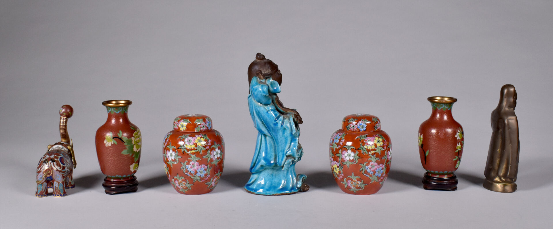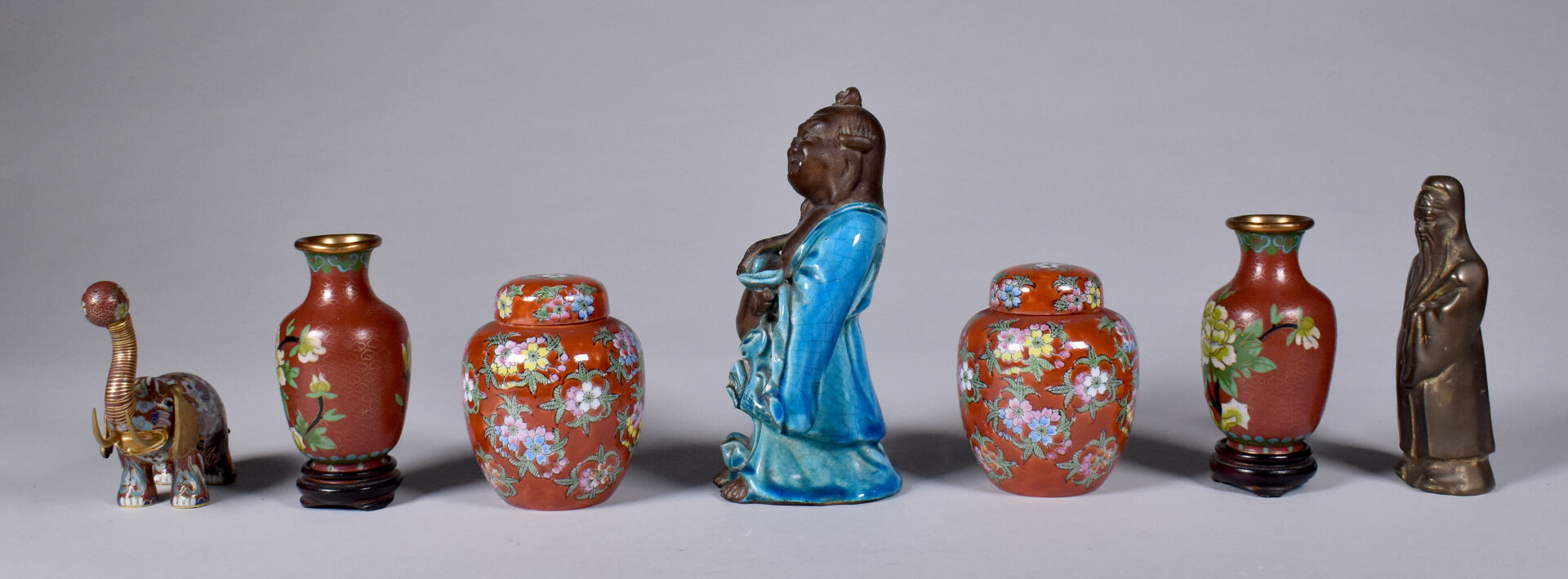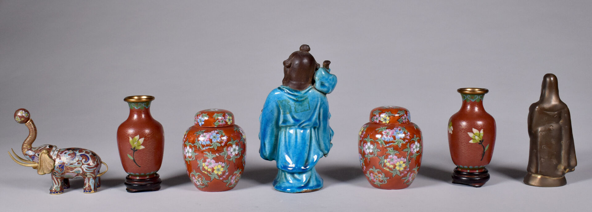 Petit ensemble cit une paire de pots à gingembre en porcelaine émaillée sur fond rouge, une paire de vase à décor en émaux cloisonnés, un éléphant à décor en émaux cloisonnés, un sage en bronze et un Bouddha en terre ou grès émaillé. Chine et Japon, XXe siècle. Haut. : 19 cm pour le Bouddha.