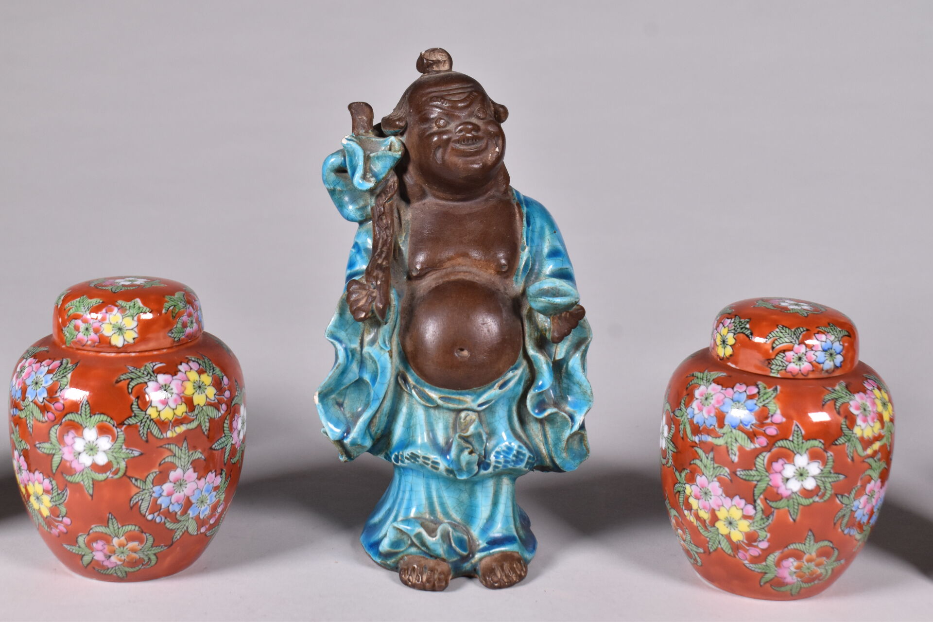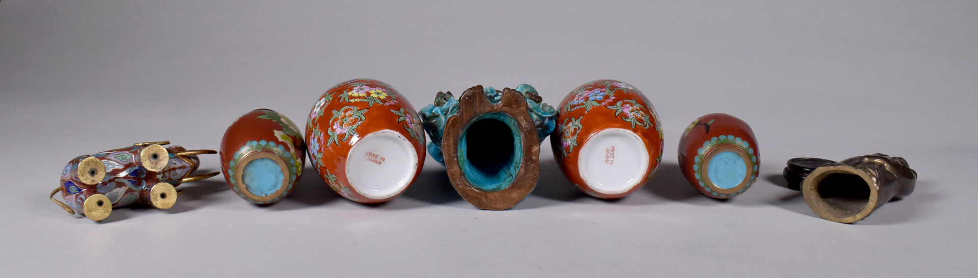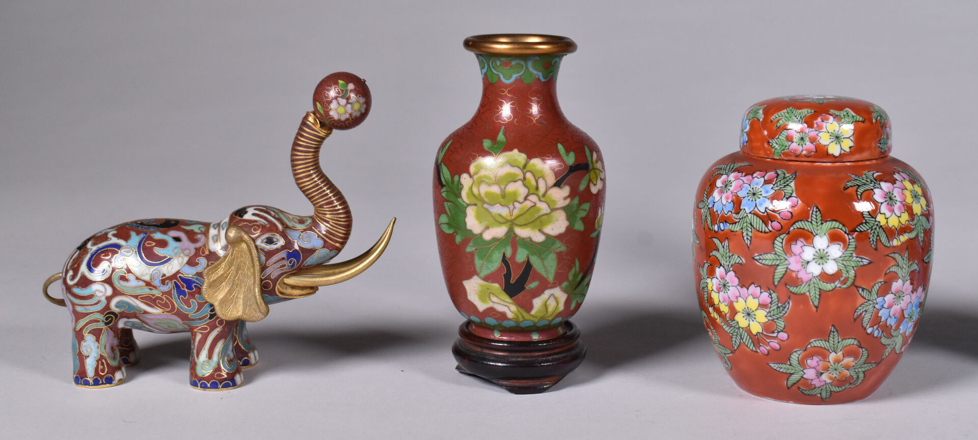 Petit ensemble cit une paire de pots à gingembre en porcelaine émaillée sur fond rouge, une paire de vase à décor en émaux cloisonnés, un éléphant à décor en émaux cloisonnés, un sage en bronze et un Bouddha en terre ou grès émaillé. Chine et Japon, XXe siècle. Haut. : 19 cm pour le Bouddha.