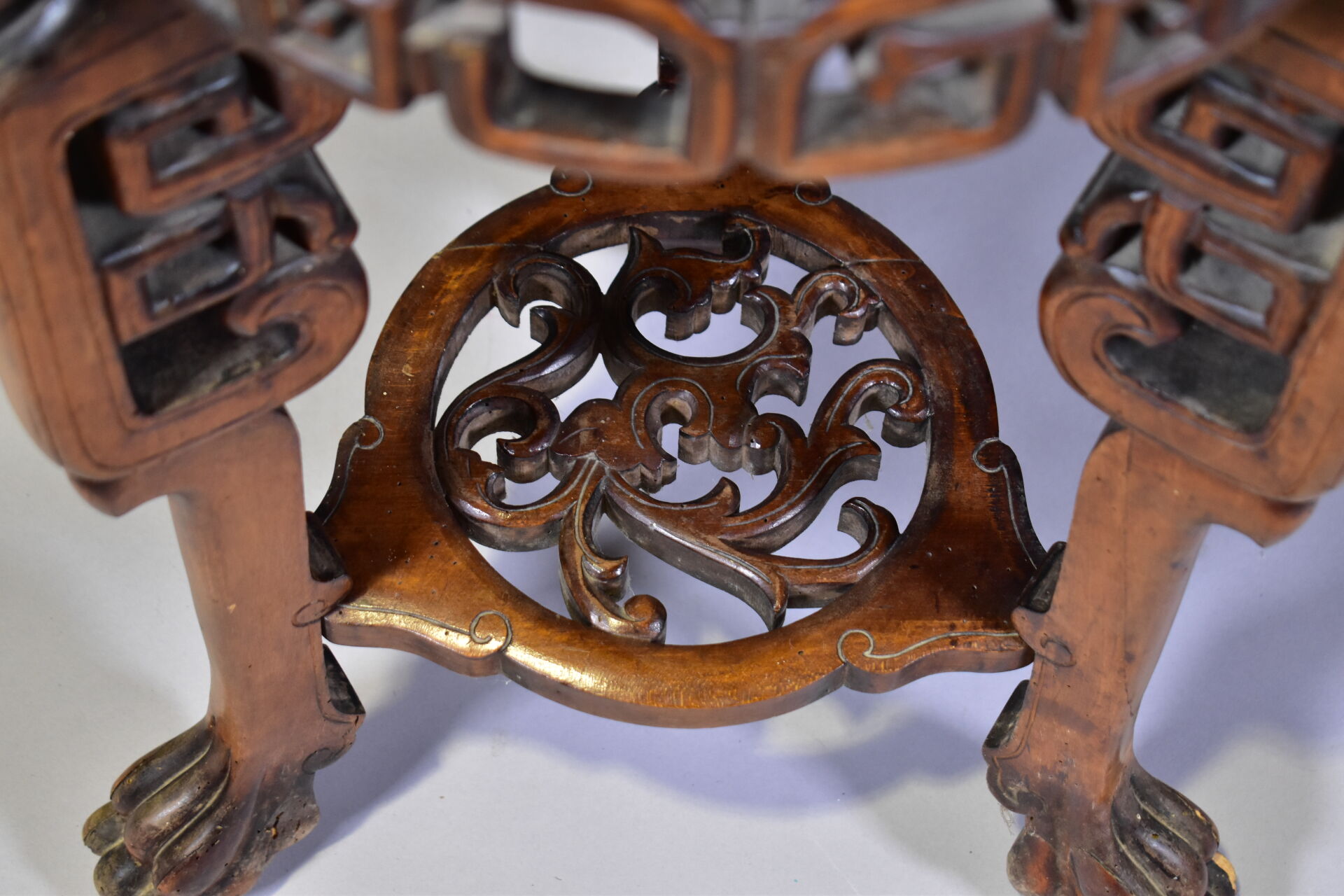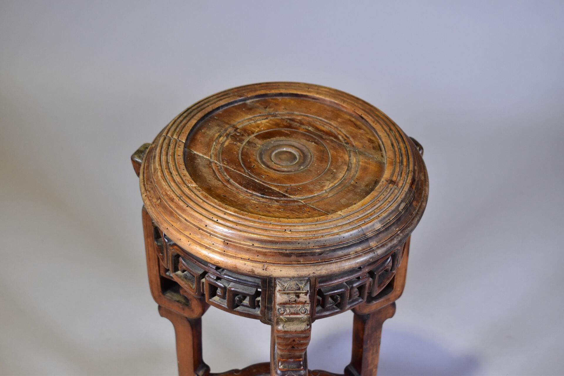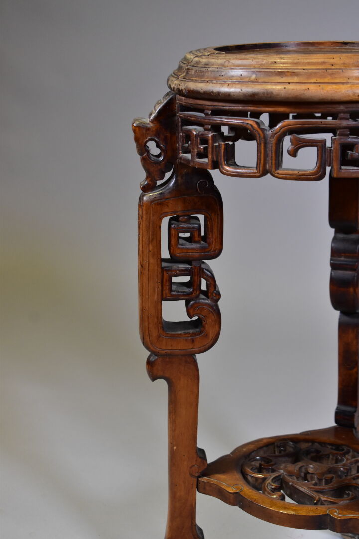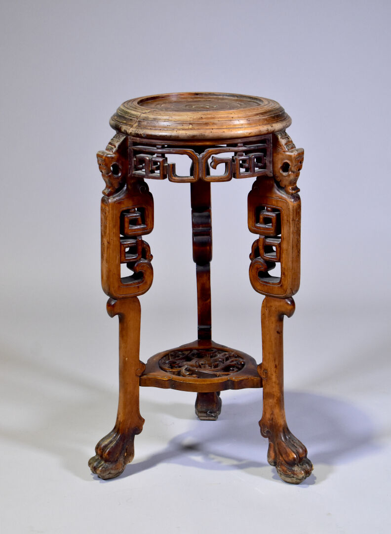 Petit guéridon en bois mouluré sculpté à décor d’animaux fantastiques et griffes (fentes, traces de vers). Chine. Haut. : 74 cm – Diam. : 38 cm.