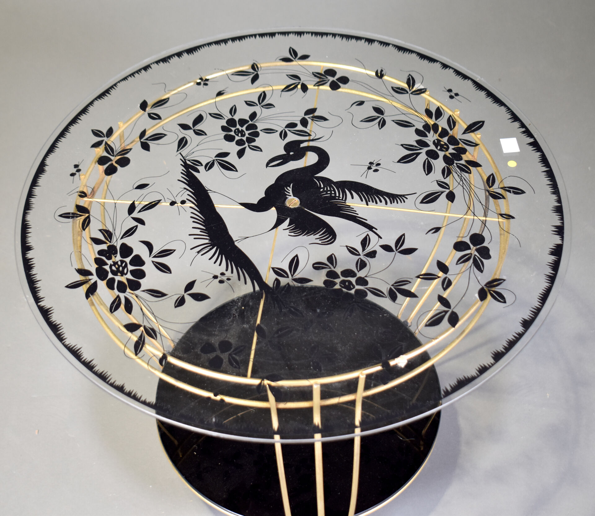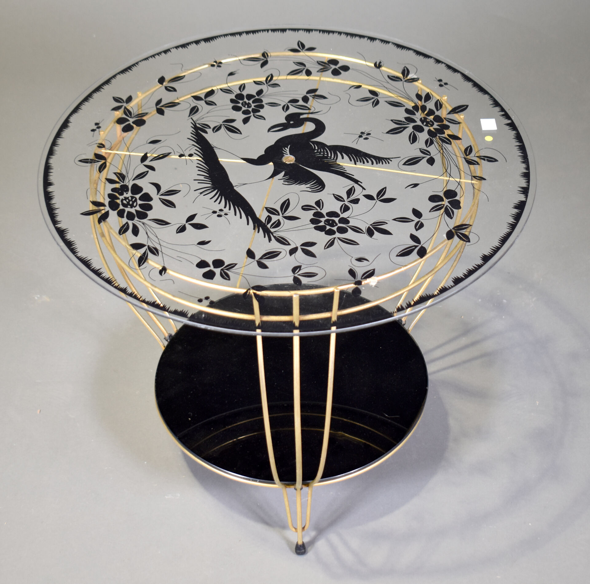 Petit guéridon tripode en métal doré à deux plateaux de verre, le premier à décor en noir d’un oiseau et de fleurs, le second noir. Milieu du XXe siècle. Haut. : 45,5 cm., Diam. 55 cm.