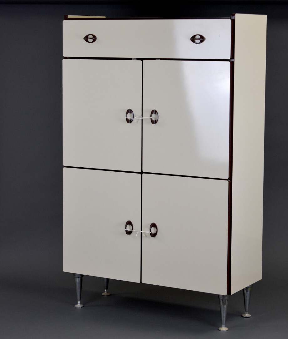 Petit meuble en aggloméré laqué crème et brun, ouvrant à un tiroir et quatre portes. Petits pieds compas en métal brossé. Milieu du XXe siècle. Haut. : 102 cm – Larg. : 65 cm – Prof. : 30cm.