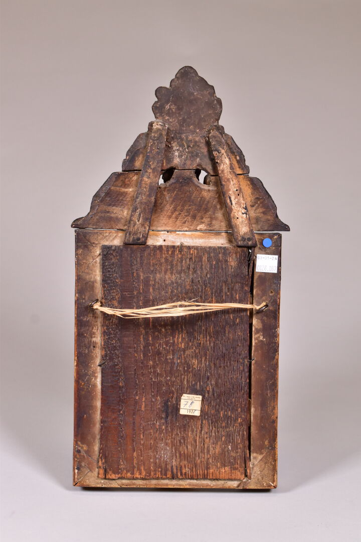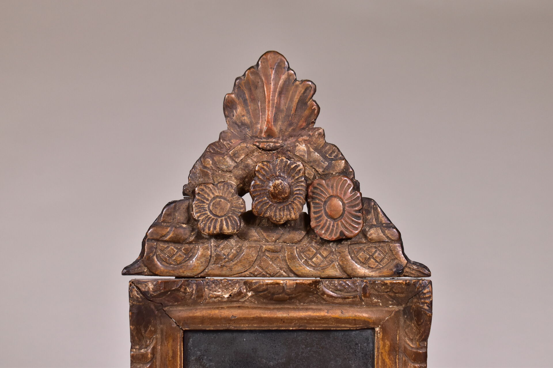 Petit miroir à fronton en bois sculpté doré à décor de trois fleurs. Glace d’origine. XVIIIe siècle. 40 x 19,5 cm.