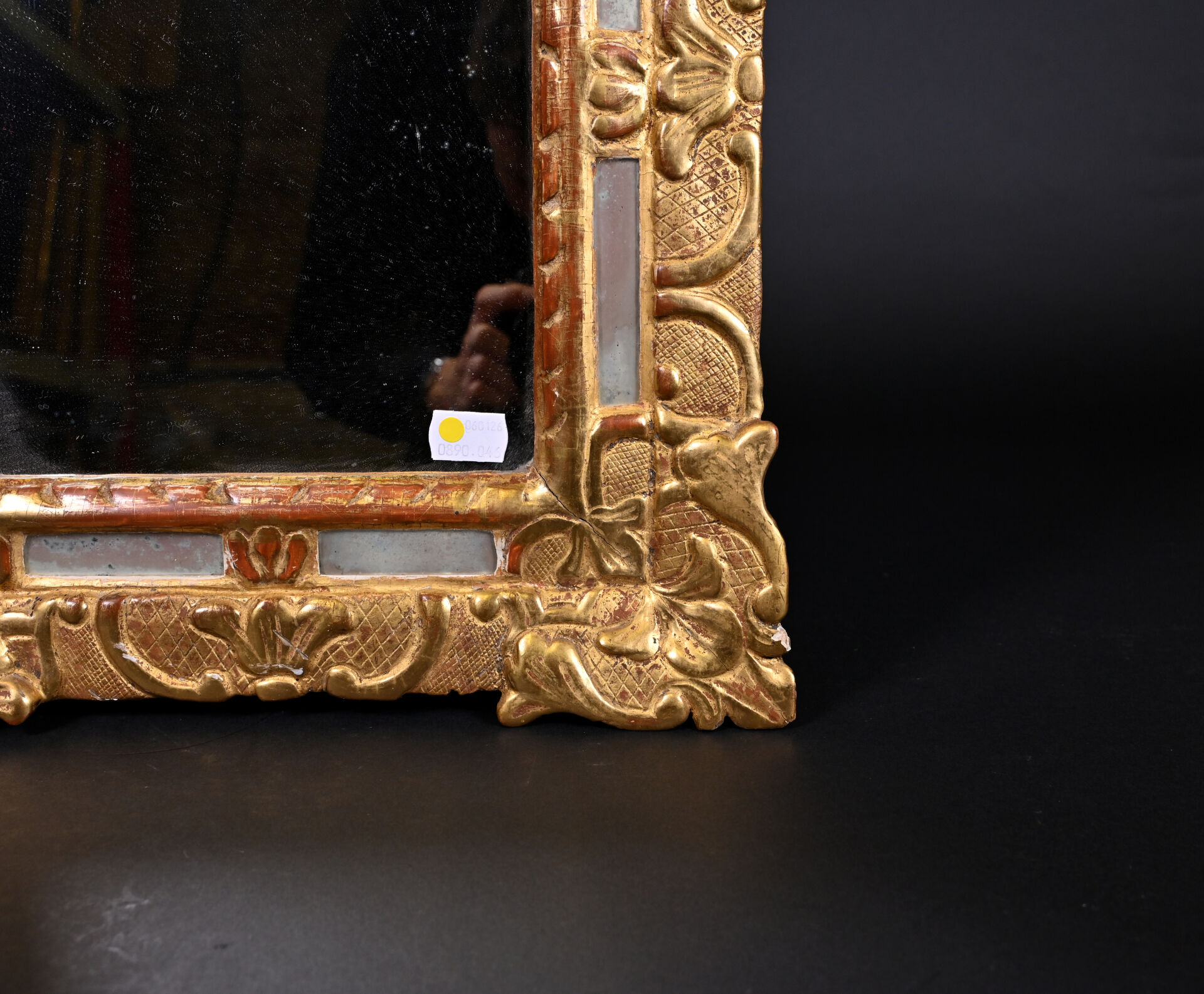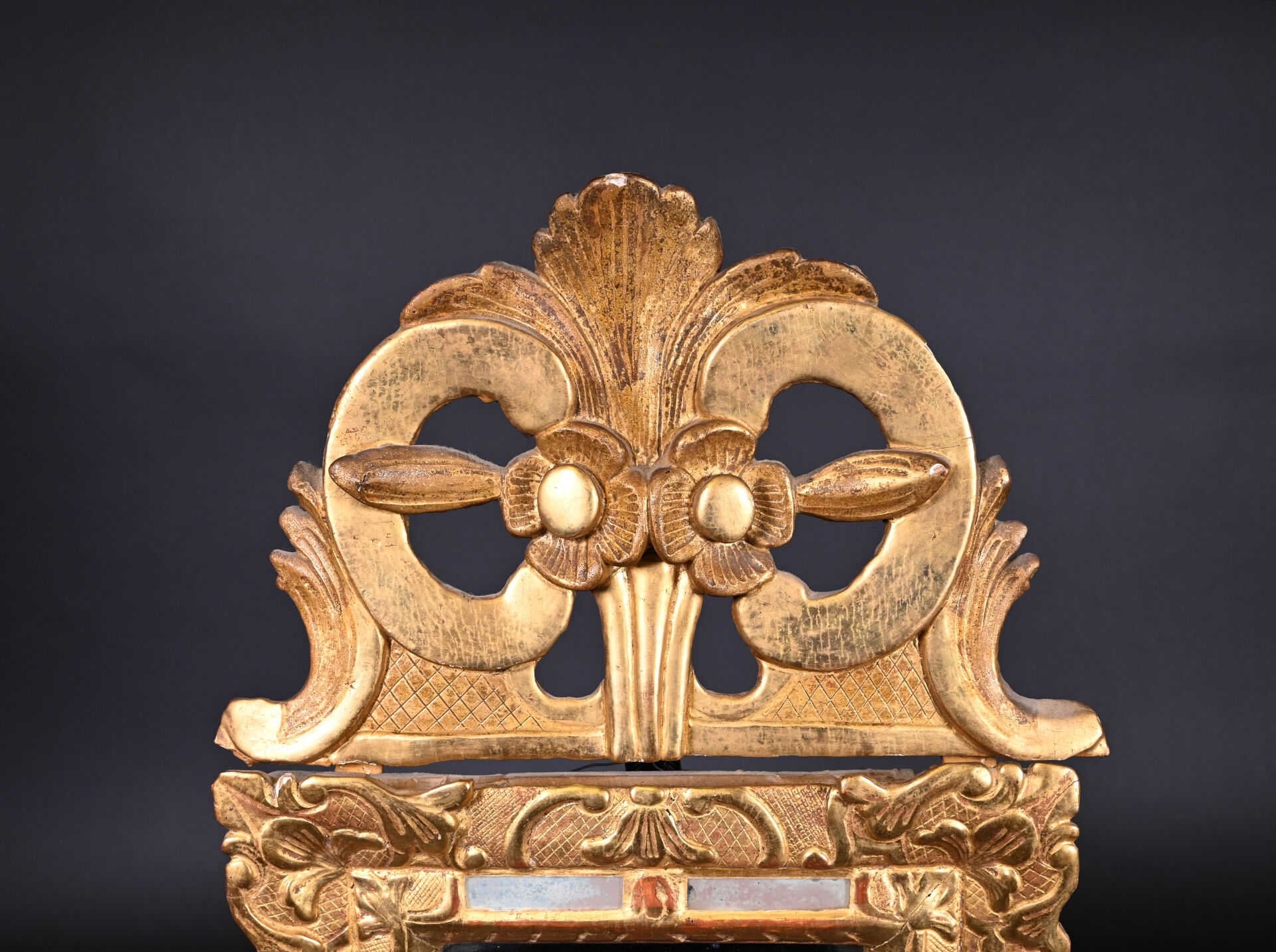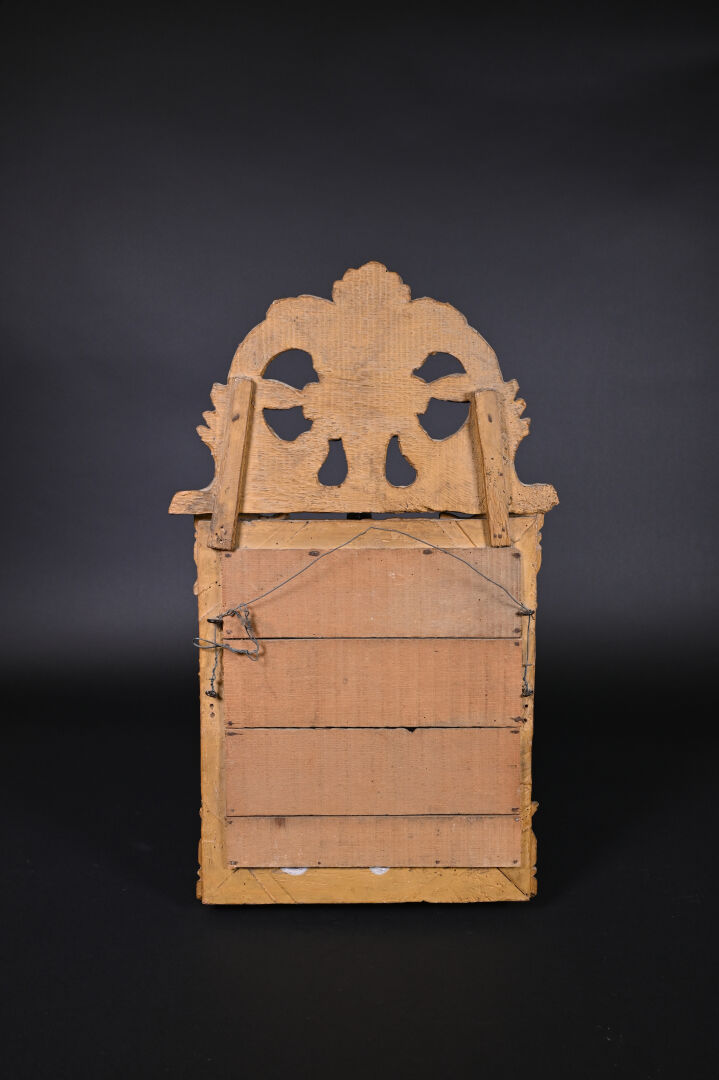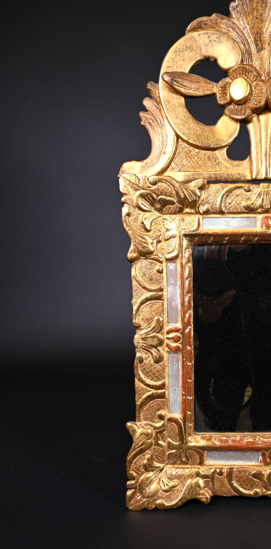 Petit miroir à parecloses en bois sculpté doré. Le fronton orné de deux fleurs adossées. Glace rapportée. XVIIIe siècle. 64,5 x 38,5 cm.