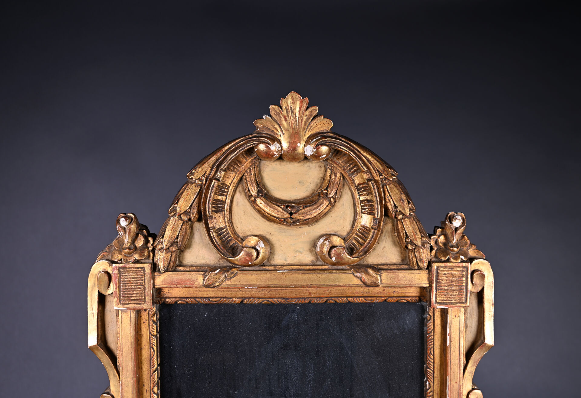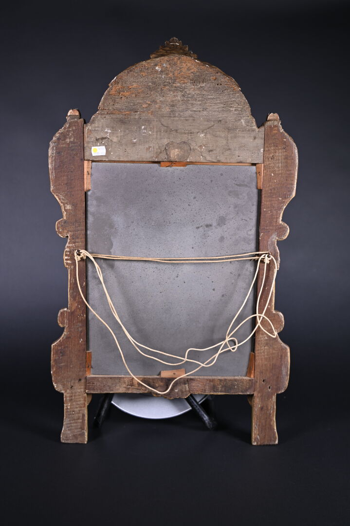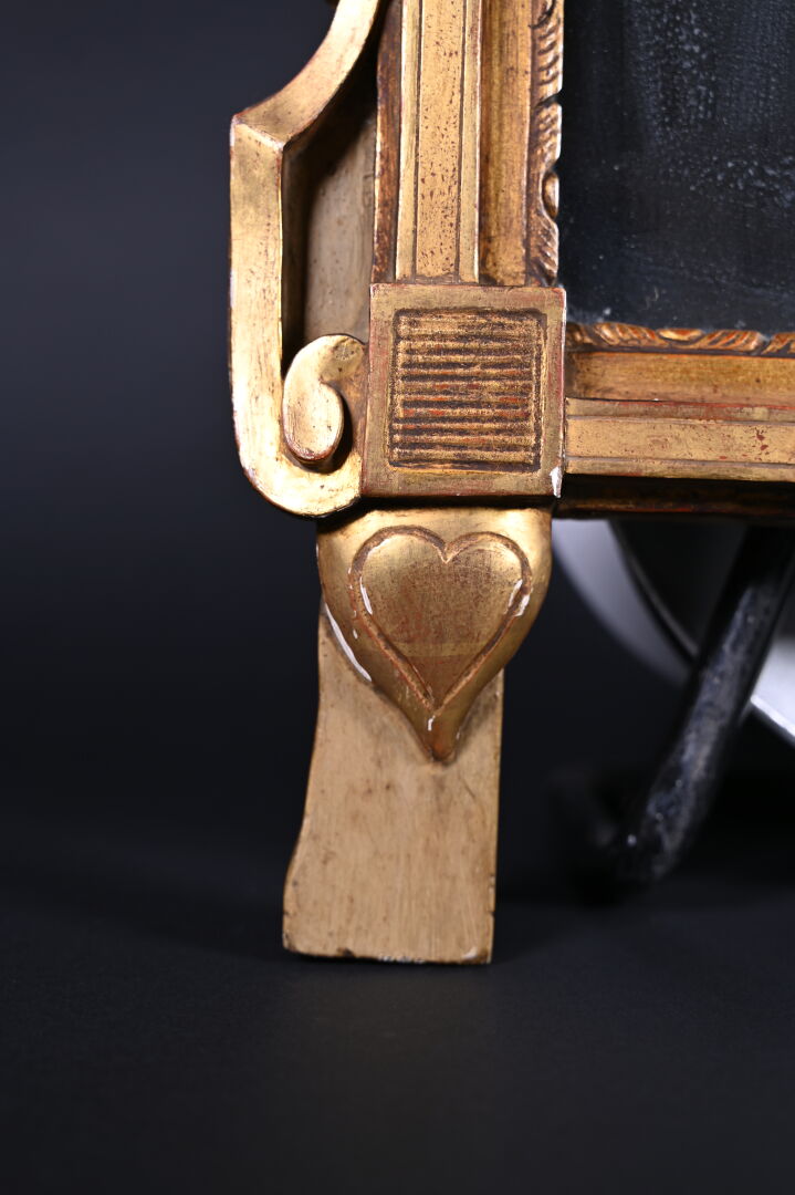 Petit miroir de cheminée en bois sculpté stuqué et doré à décor d’acanthes, palmette et laurier (quelques éclats). Style Louis XVI, XIXe siècle. 79 x 47 cm.