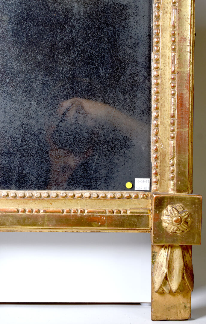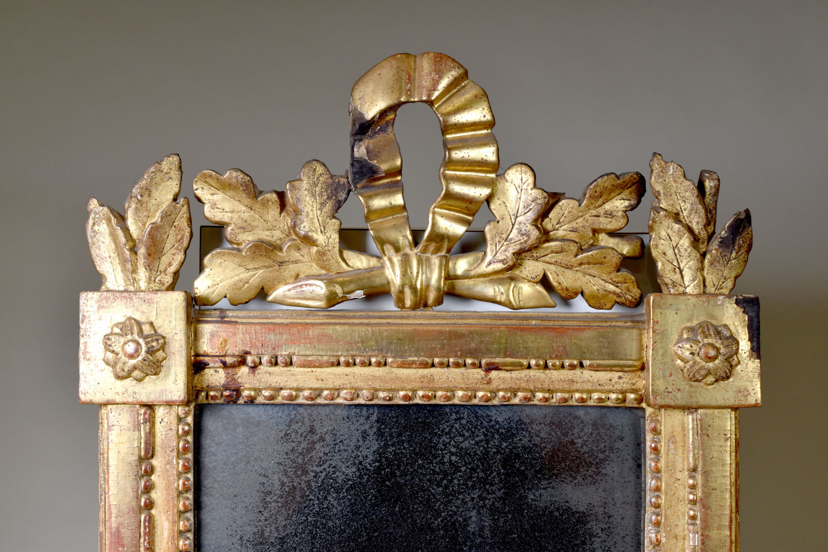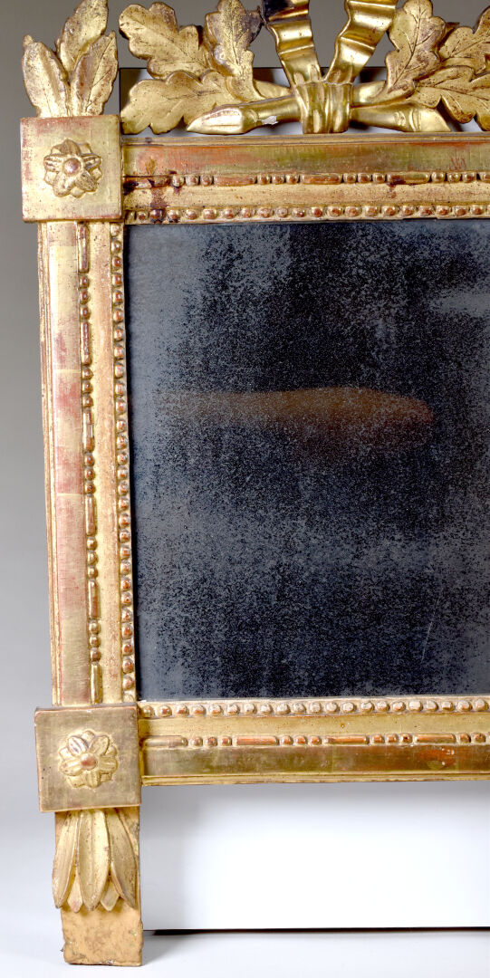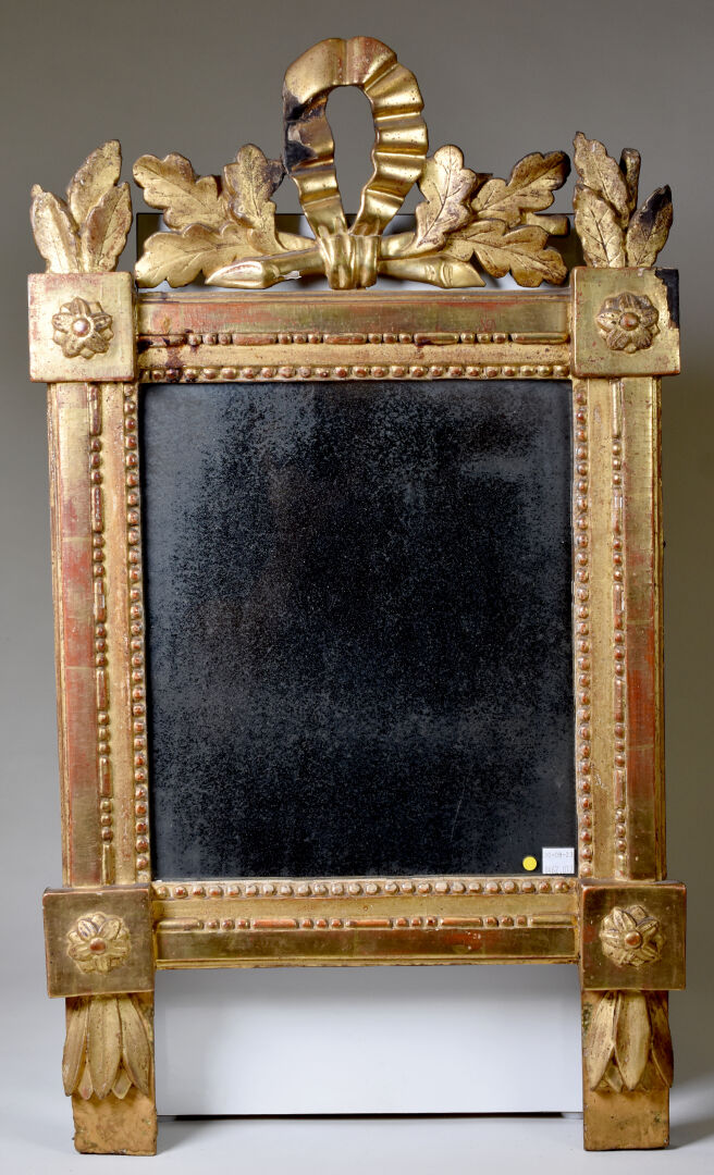 Petit miroir en bois sculpté doré, le fronton orné d’un ruban noué et de feuilles de chêne (éclats et manques). XVIIIe siècle. Glace avec piqures. 72 x 41 cm.