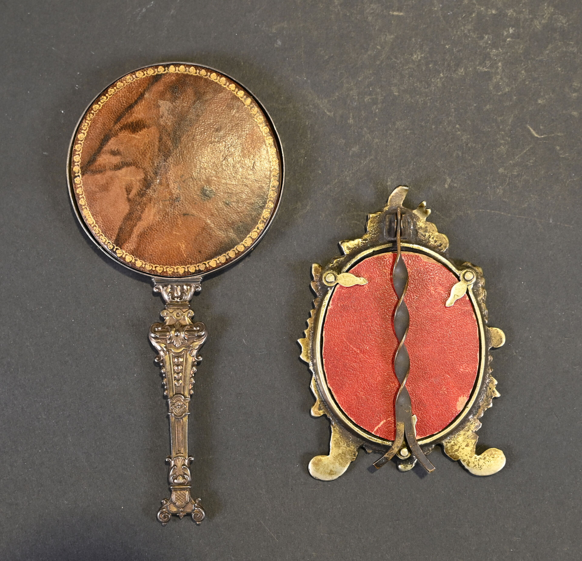Petit miroir face à main en argent 925/1000e. Le dos froncé de cuir doré aux petits fer. XIXe siècle. Haut. : 17 cm. Poids brut. : 64 g. On joint une miniature représentant un homme aux lunettes dans un cadre en métal.