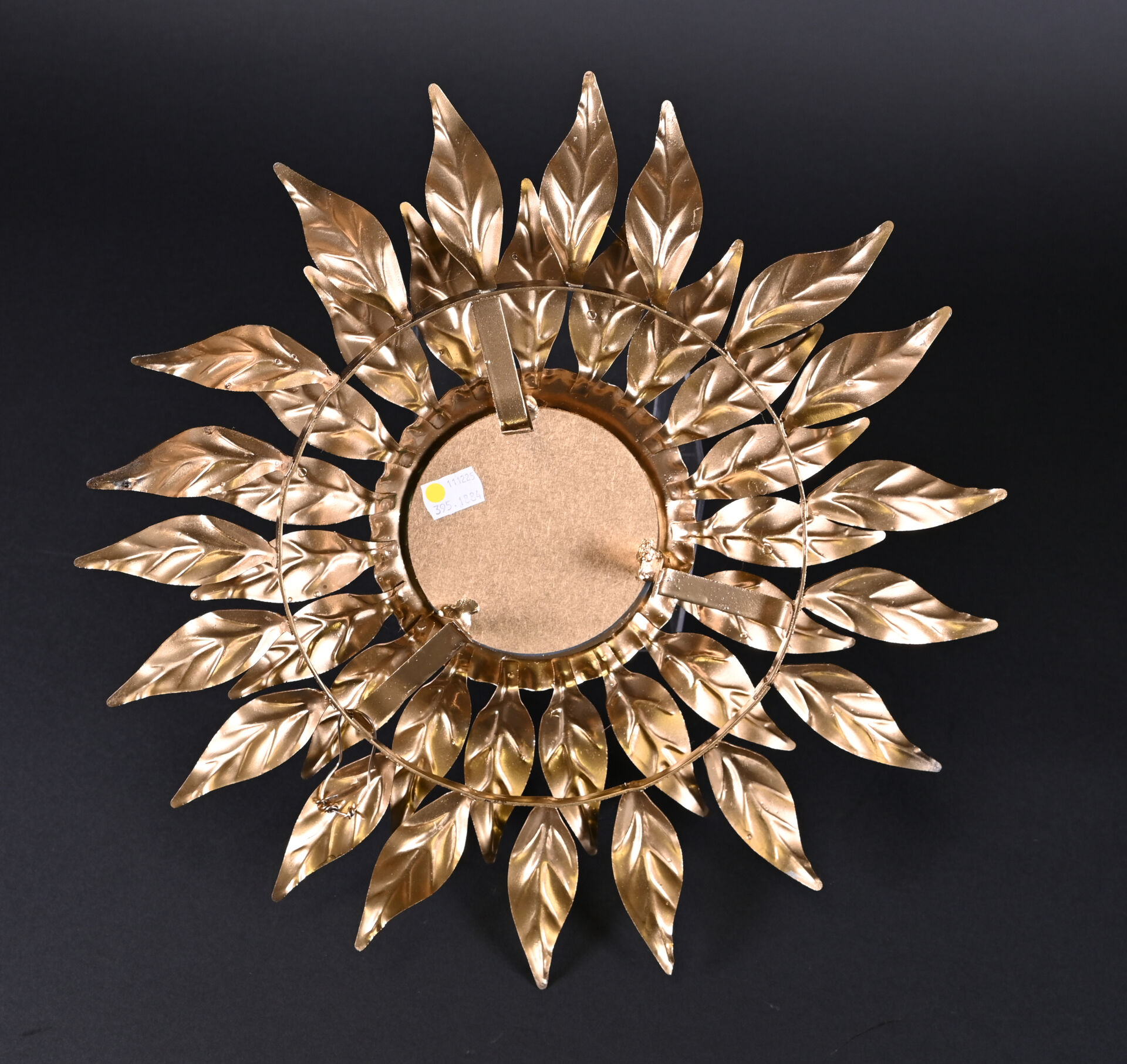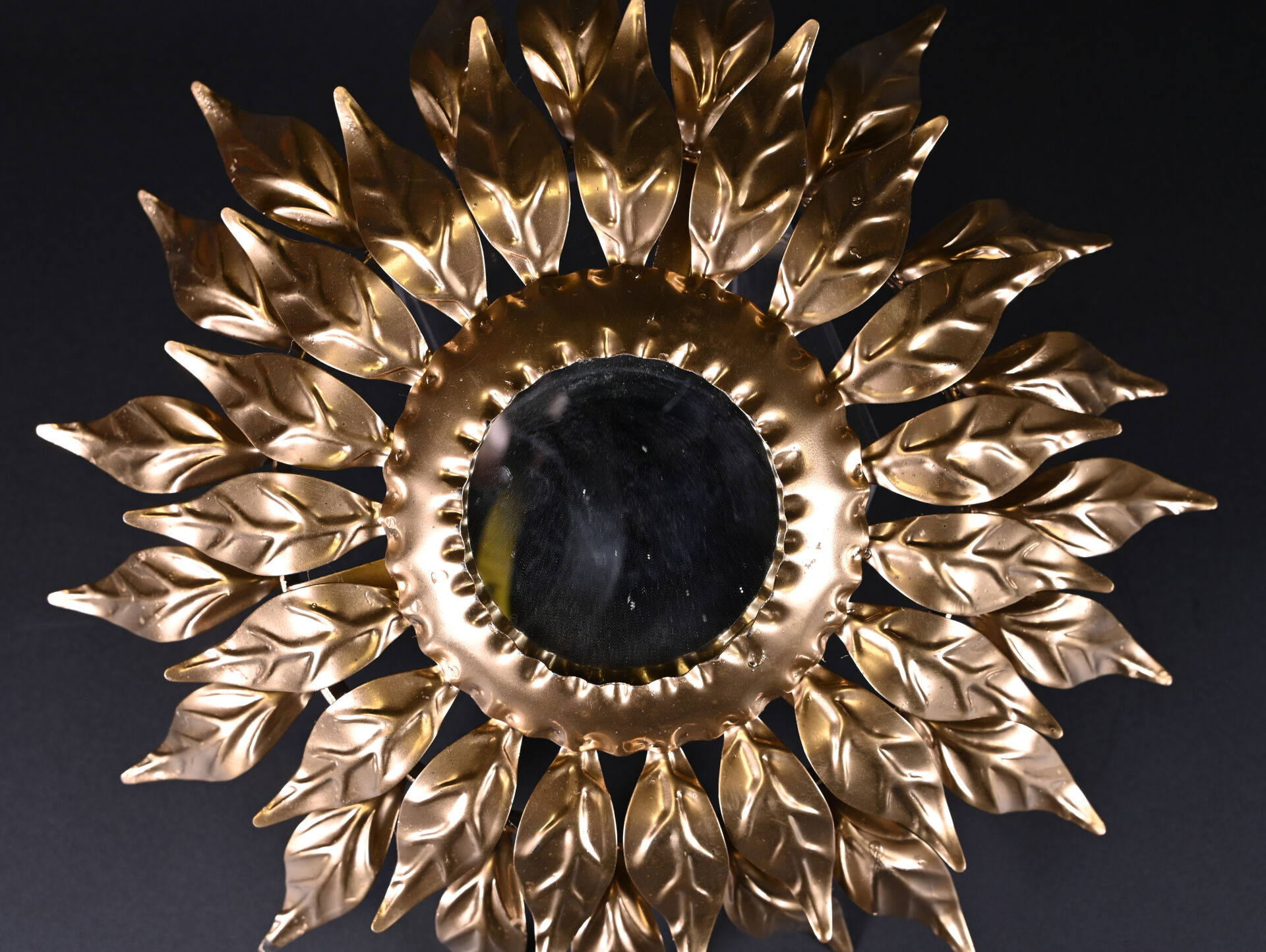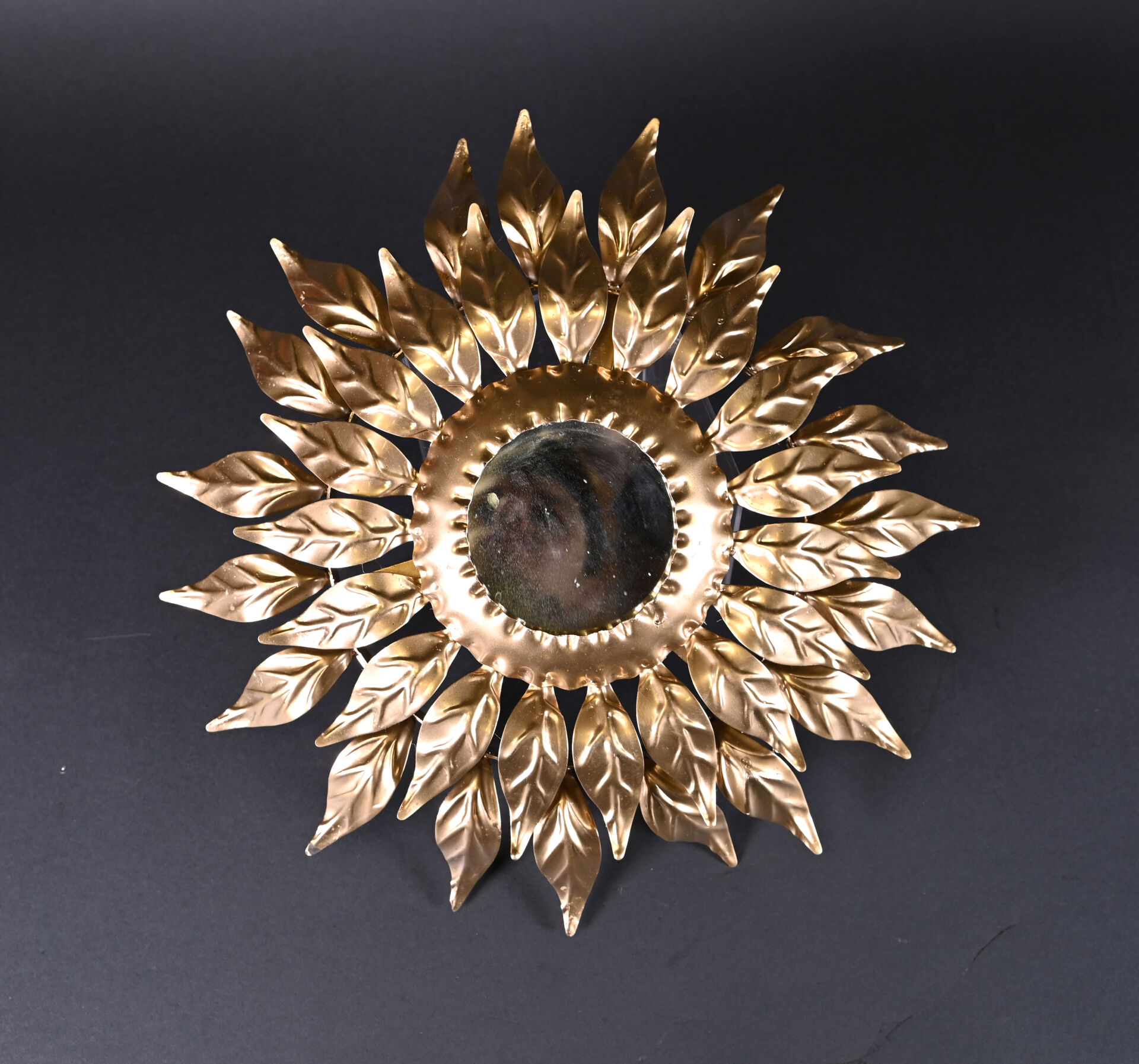 Petit miroir soleil à deux rangs de feuilles en métal redoré (usures d’usage) . Seconde moitié du XXe siècle. Diam. : 40 cm.