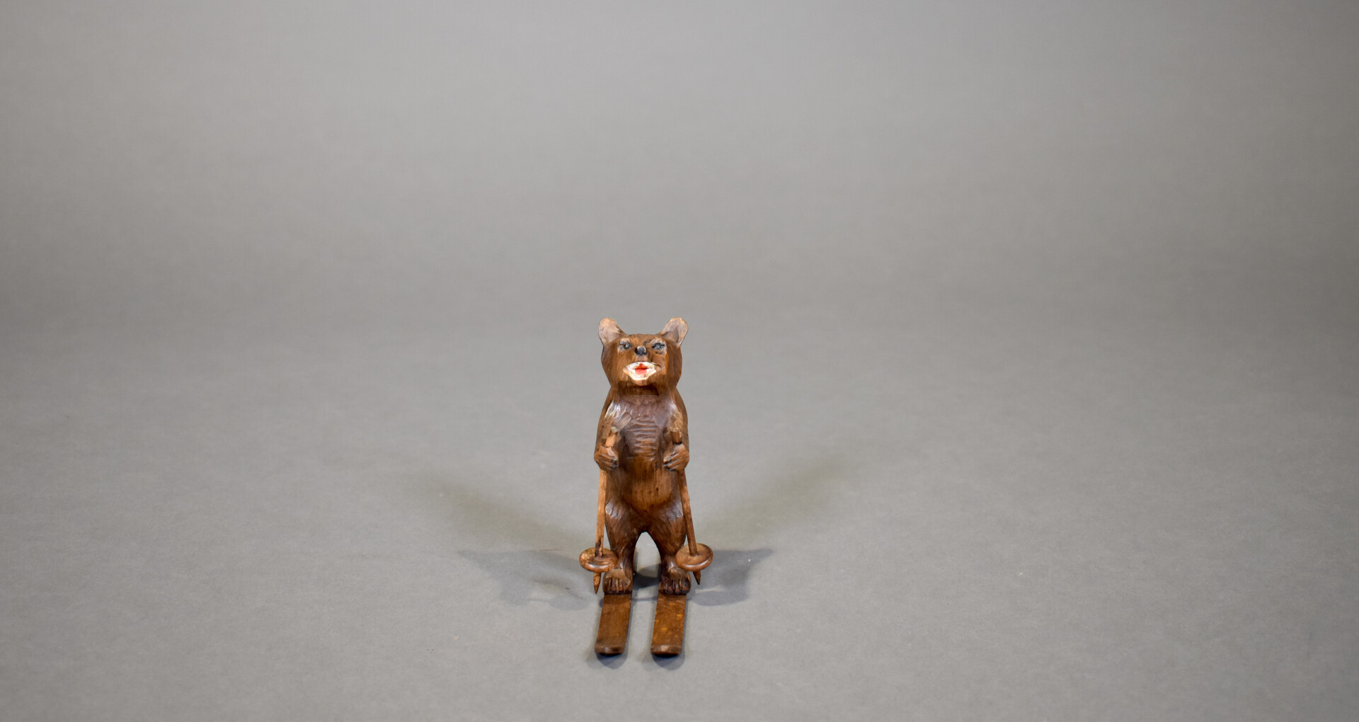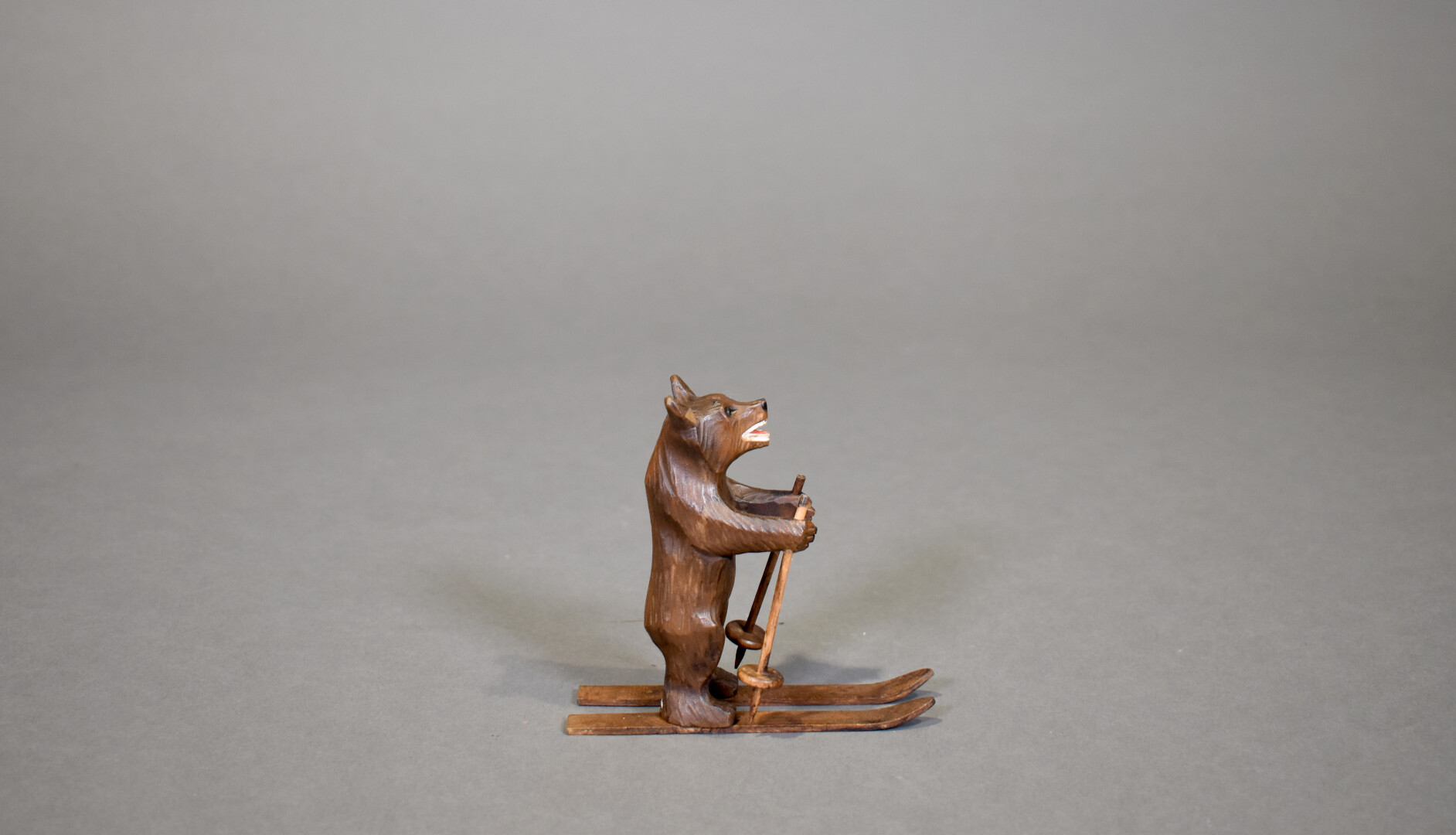 Petit ours brun skiant en bois sculpté. Travail de la forêt noire, début du XXe siècle. Haut. : 11 cm.