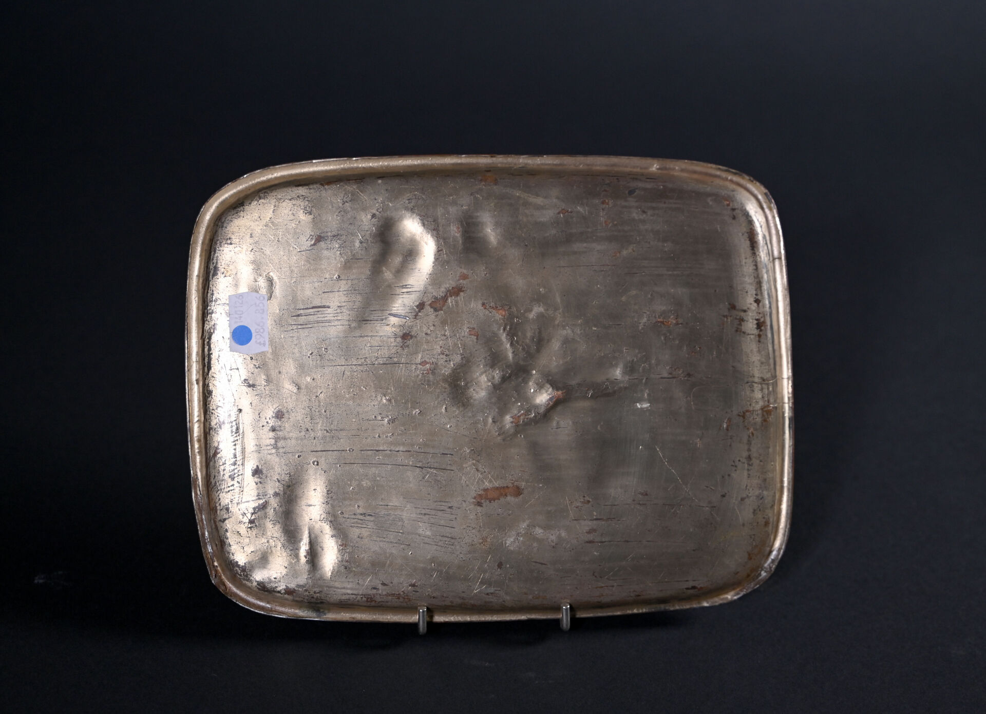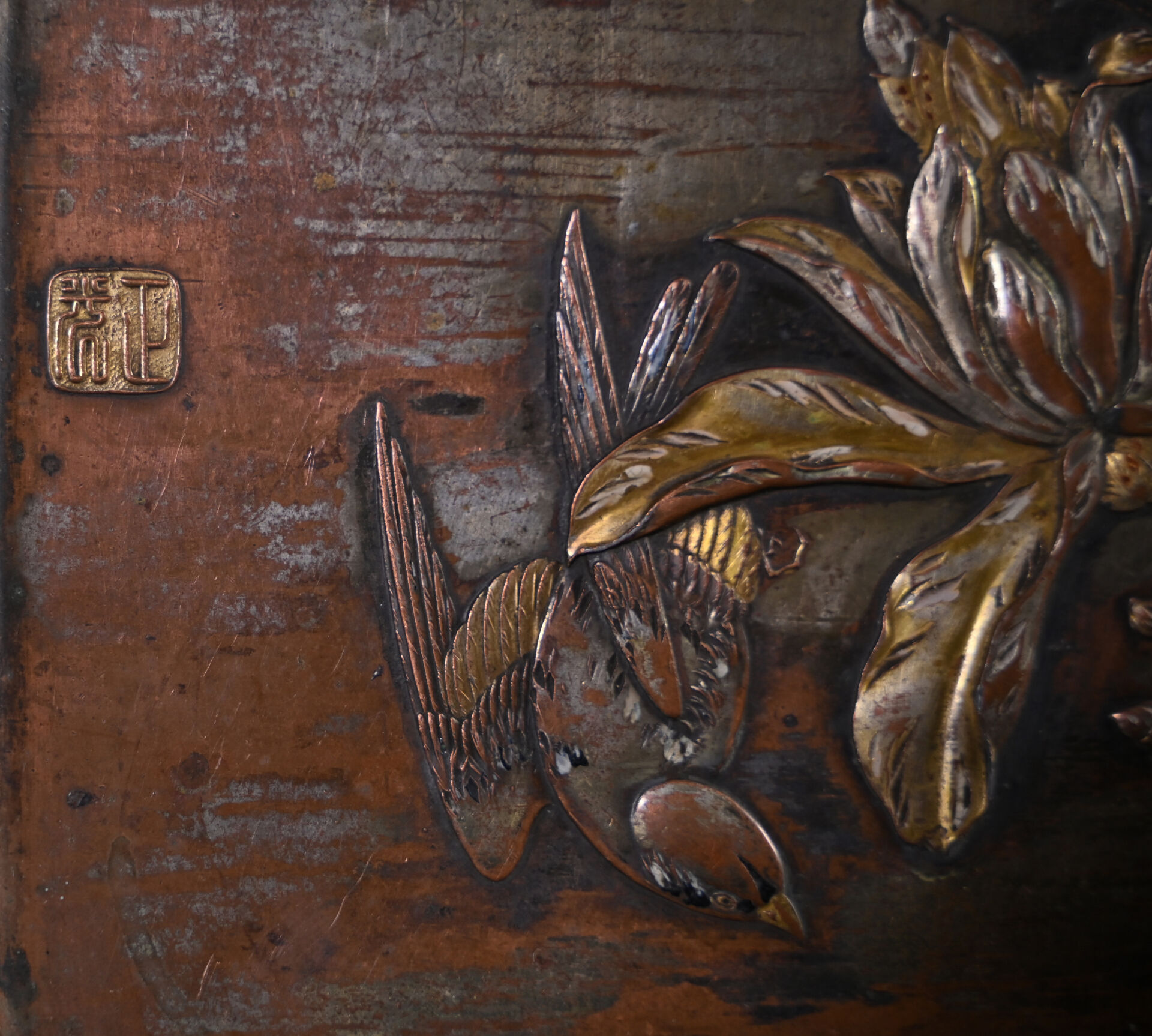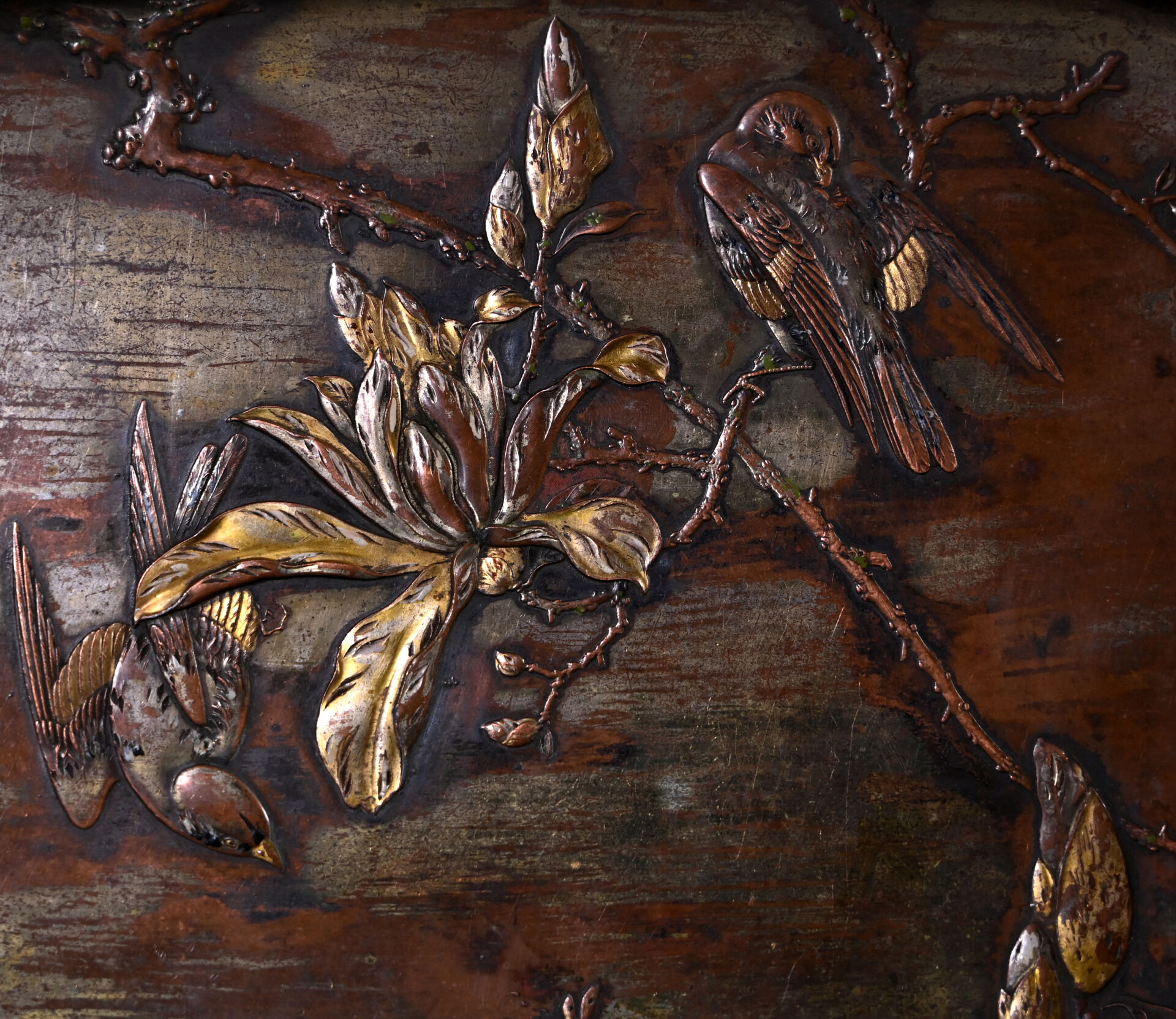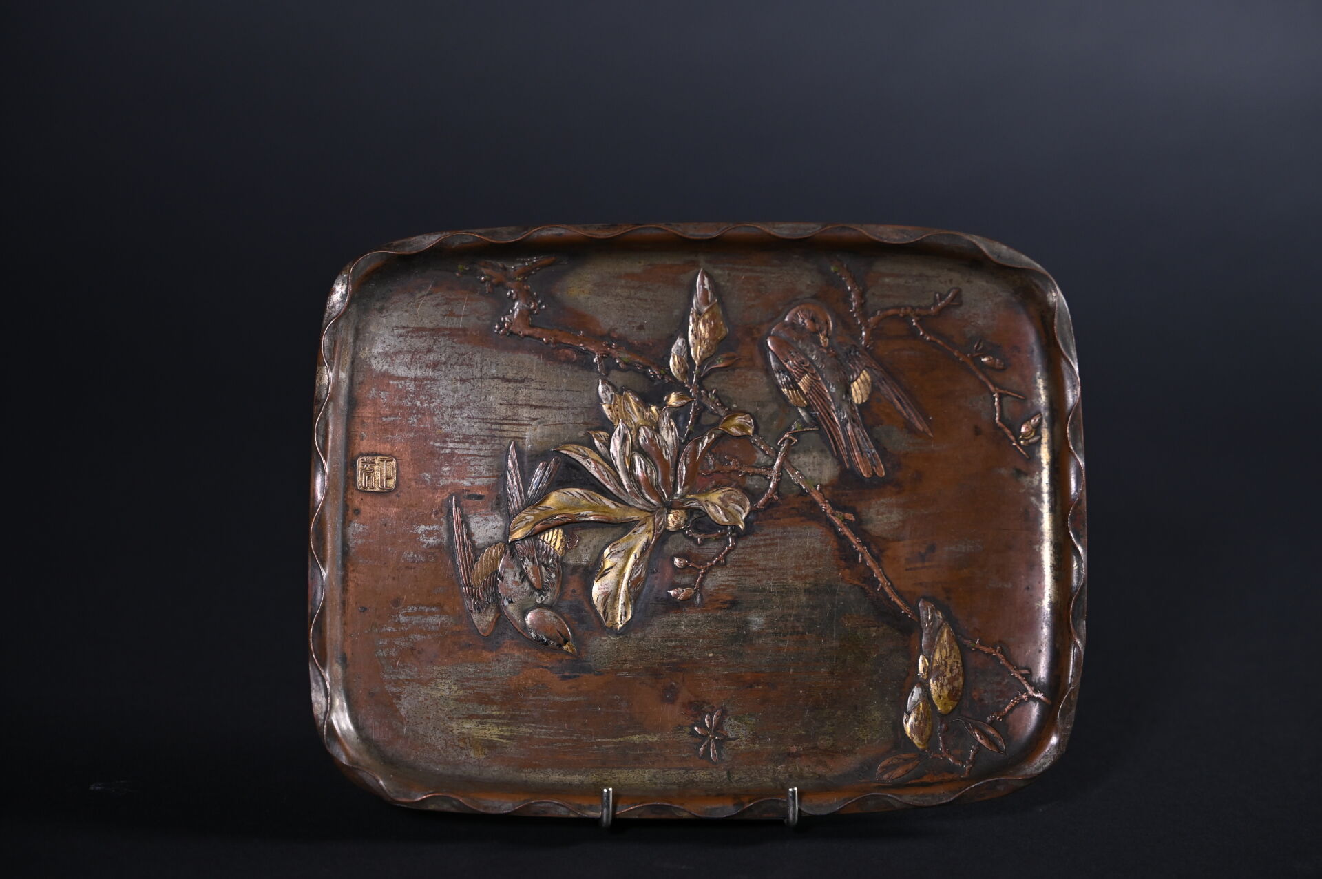 Petit plateau en bronze à plusieurs patines décor en léger relief d’oiseaux branchés (usures à la patine). Japon, fin du XIXe ou début du XXe siècle. 26 x 19,5 cm.