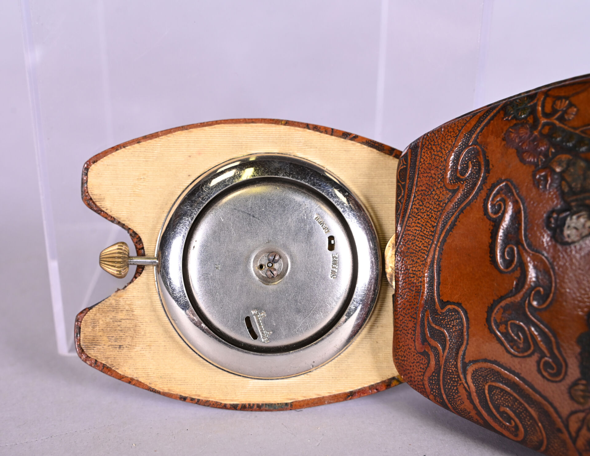 Petit réveil à étui en cuir estampé d’un décor japonisant, cadran marqué ANCELY à Toulouse (usures d’usage). Premier tiers du XXe siècle.