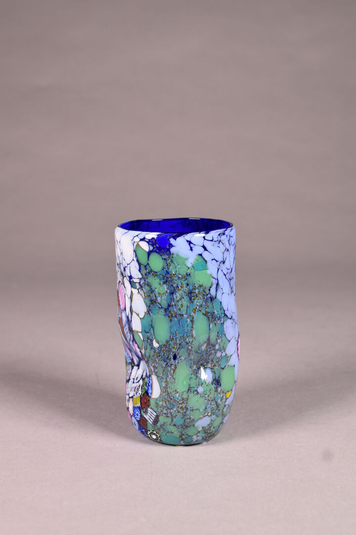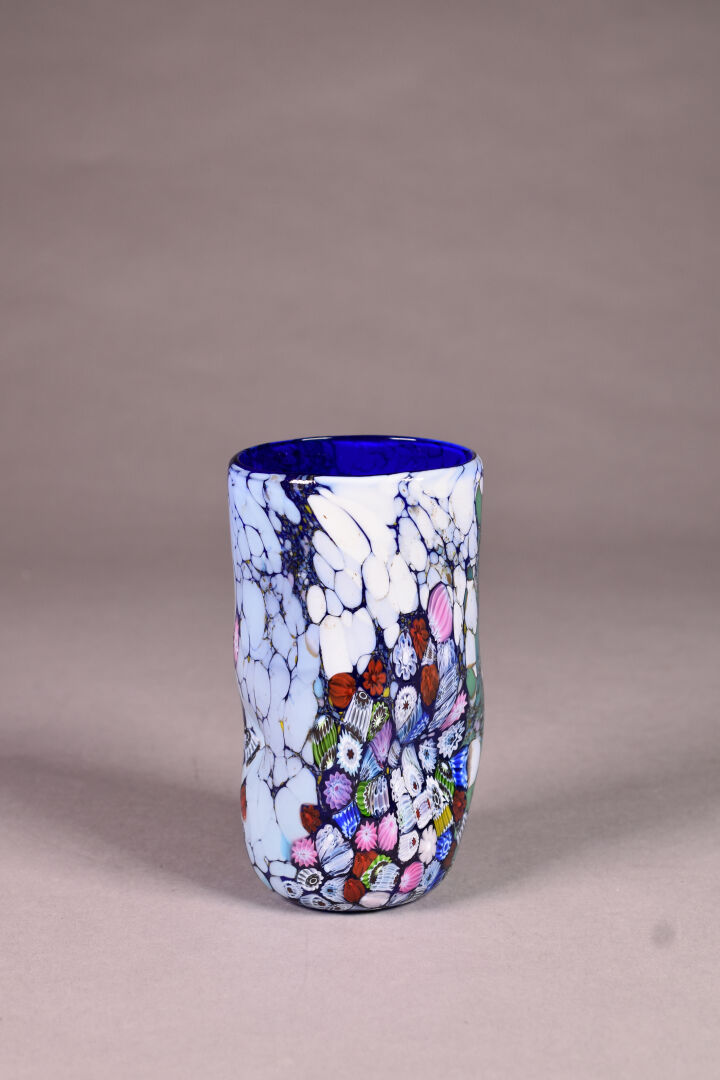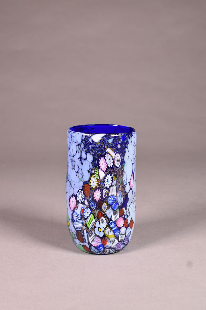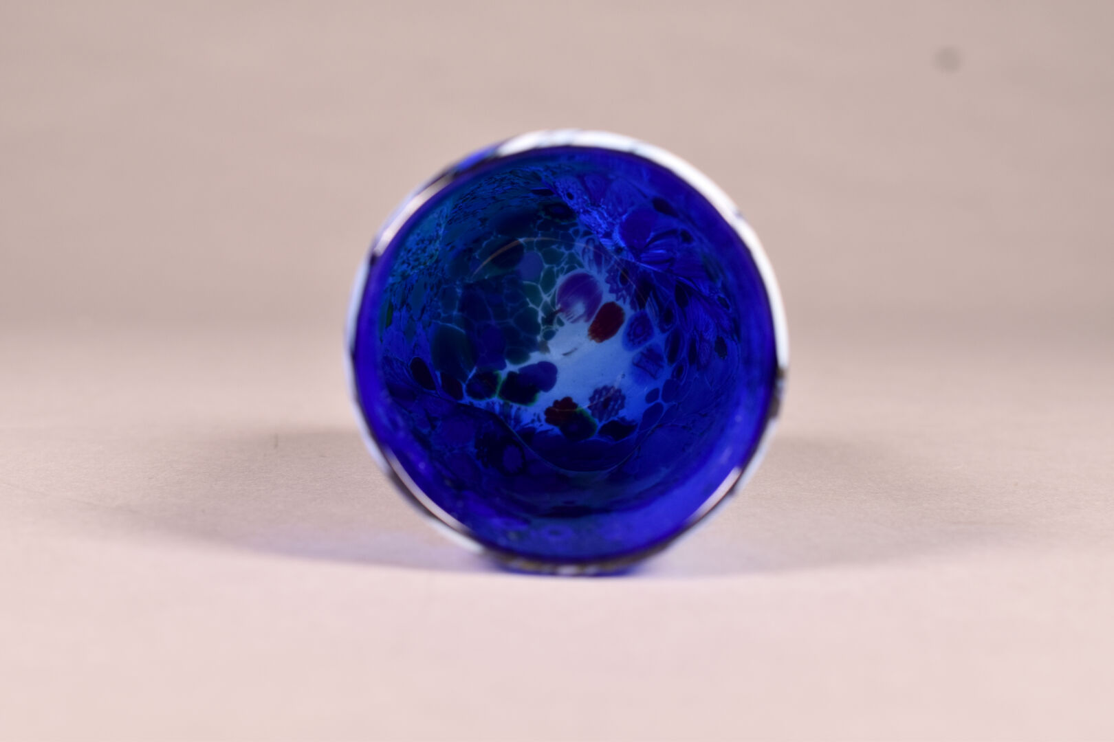 Petit vase à décor de murines polychromes sur fond bleu cobalt. Murano? Haut. 13 cm.