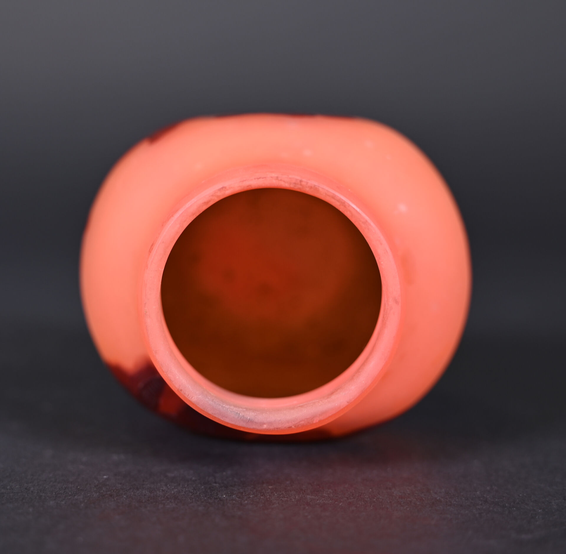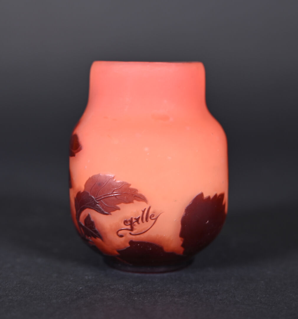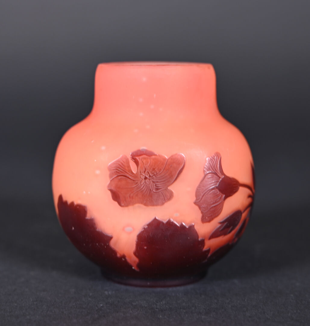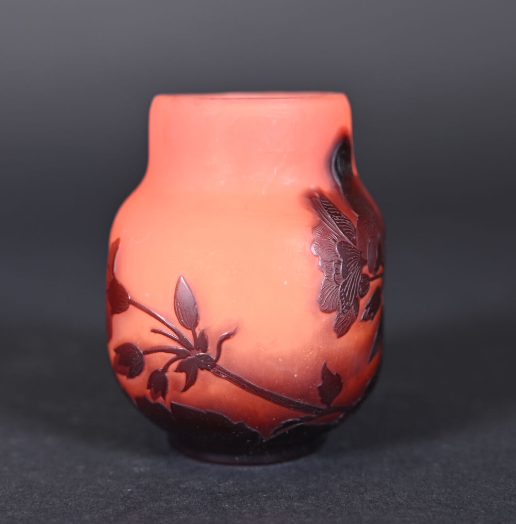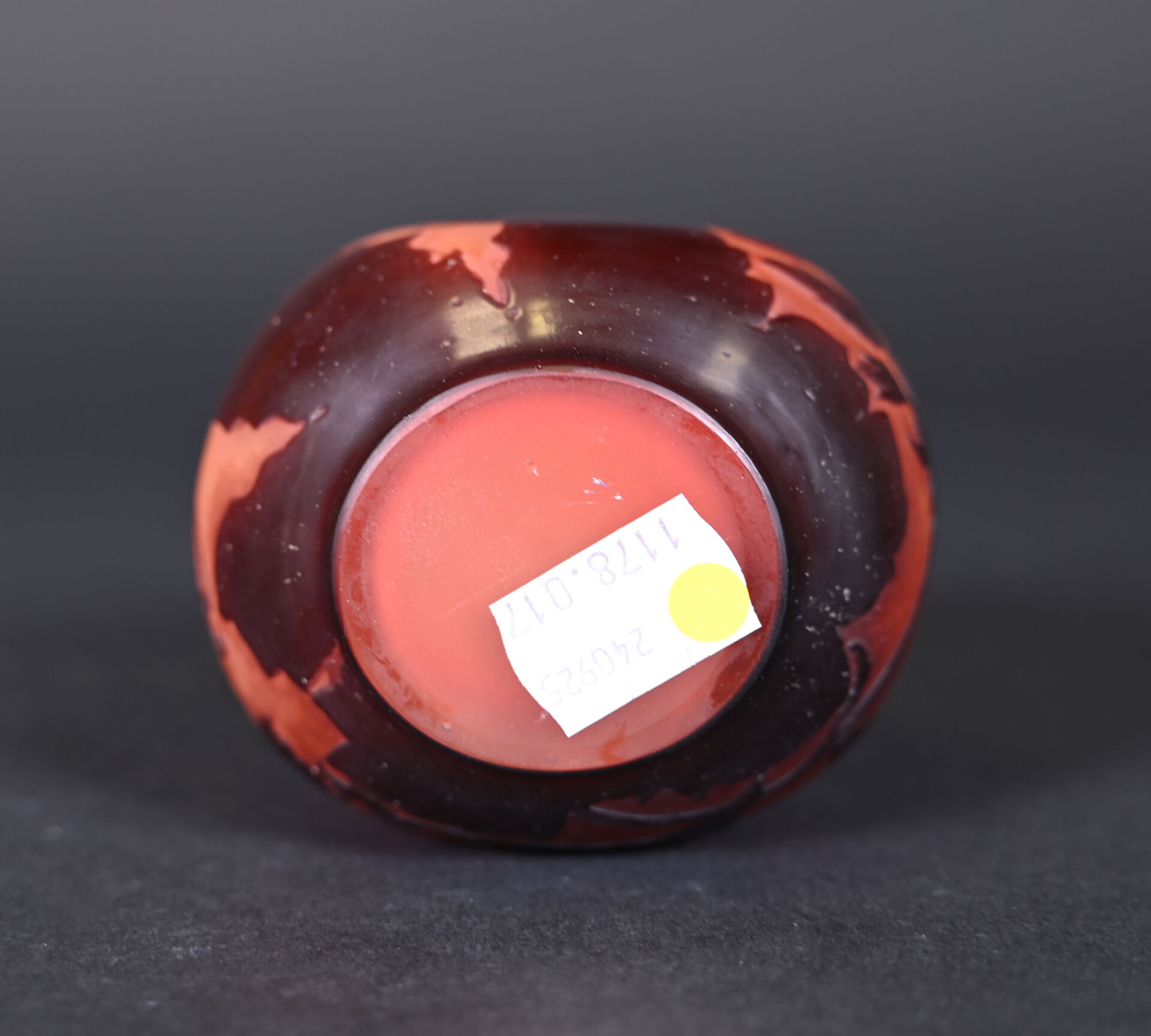 Petit vase pansu en verre multicouche à décor dégagé à l’acide de branches de fleurs sur fond orange. Porte une signature apocryphe. Haut. : 9,5 cm.
