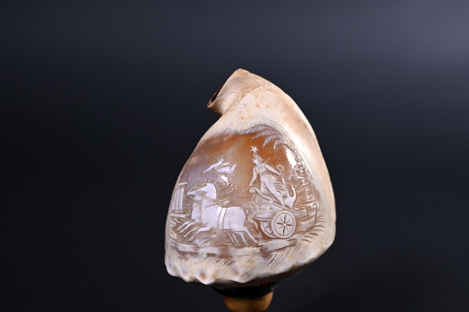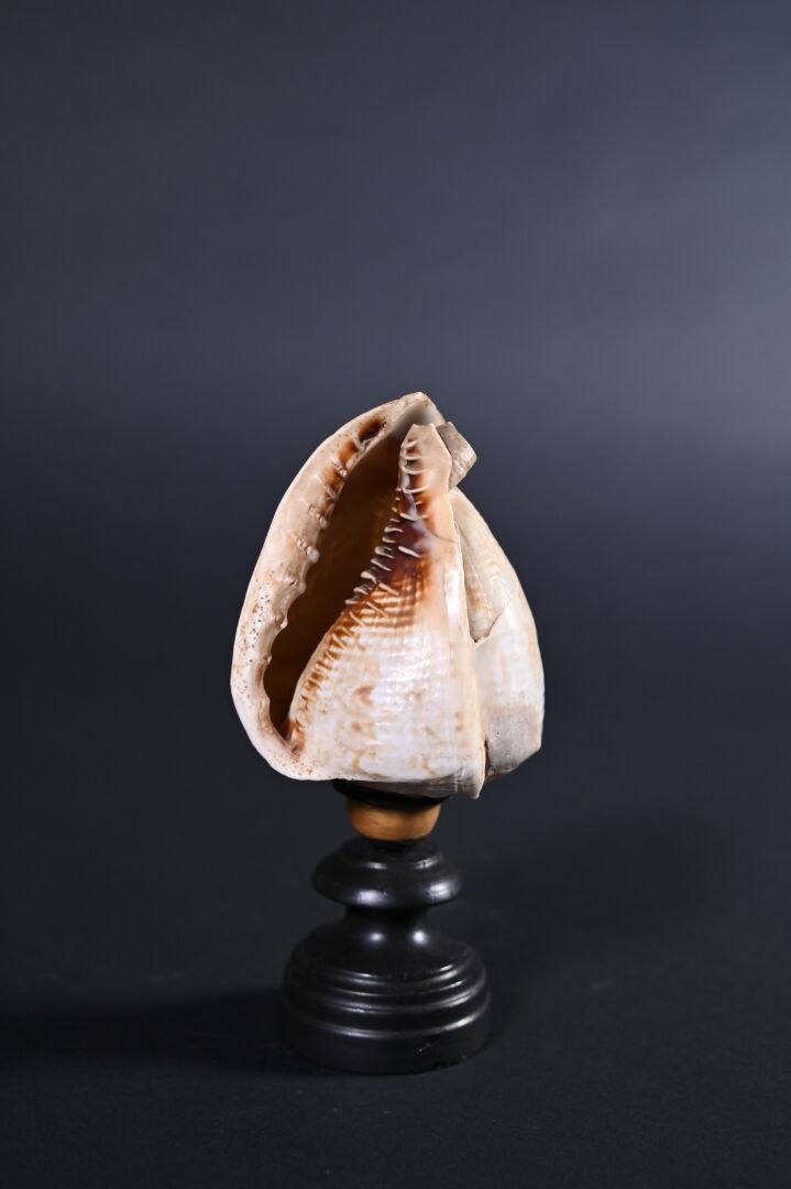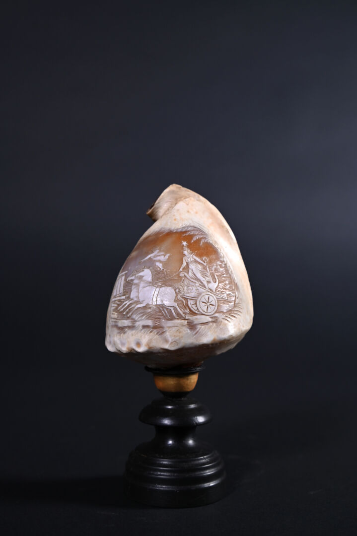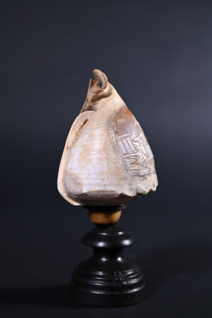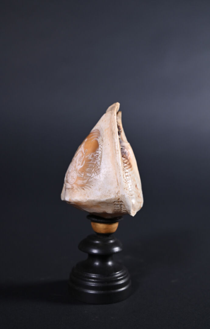 Petite conque à décor gravé en camée d’une figure de Vénus marine . Le pied en bois tourné noirci (probablement rapporté, une restauration ?). Sud de l’Italie, Fin du XIXe siècle. Haut. : 20 cm.