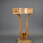 Petite console en chêne, ouvrant à un tiroir, le pied en lyre (quelques mouillures). Vers 1940. Haut. : 73,5 cm – Larg. : 40 cm – Prof. : 29 cm.