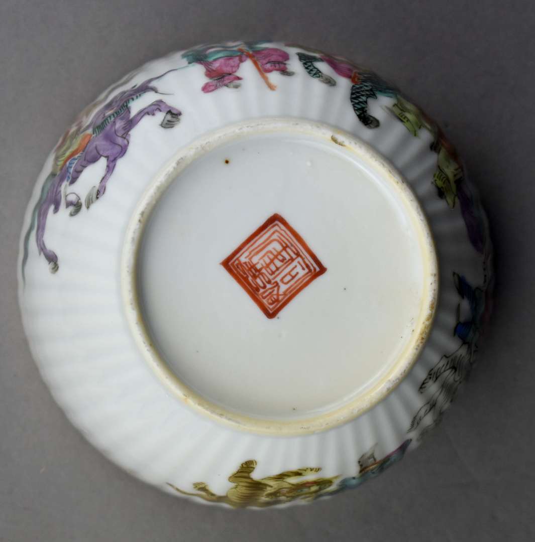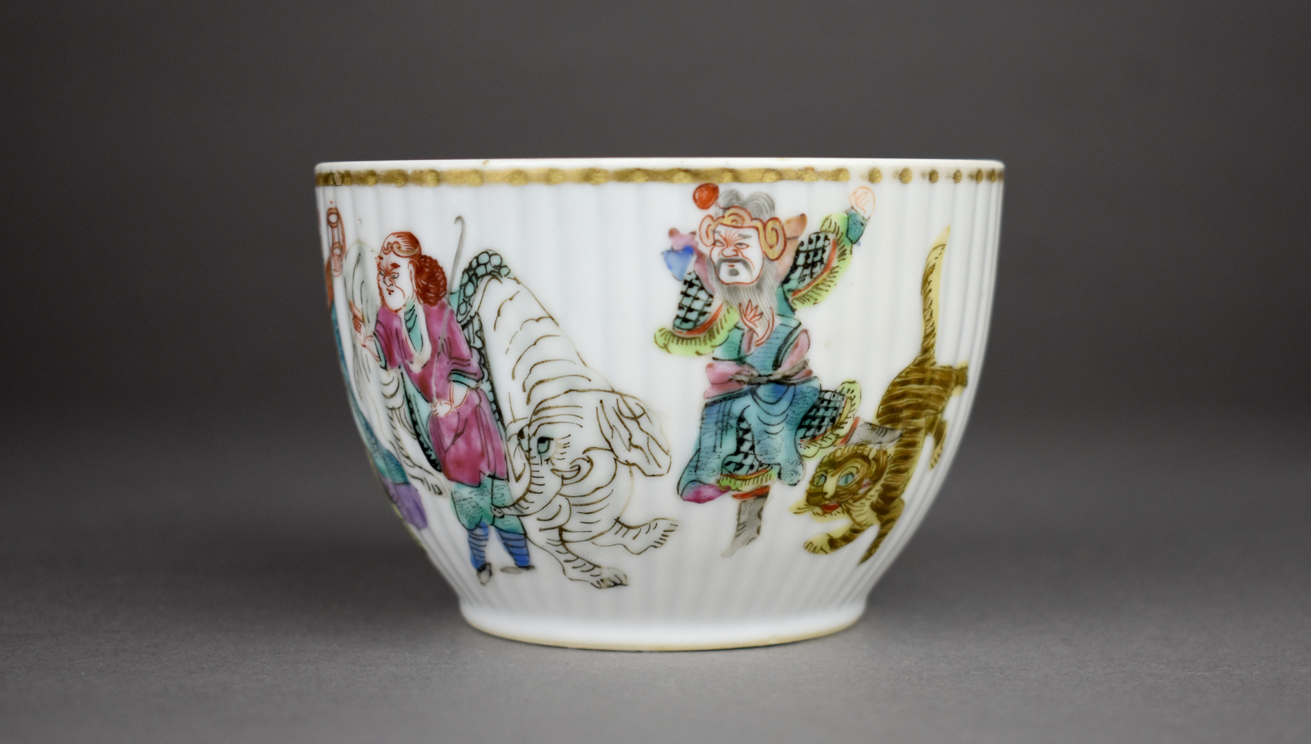 Petite coupe à paroi côtelée, ornée en émaux polychromes, d’Immortels taoïstes. Chine, fin XIXe siècle. Haut. : 7 cm – Larg. : 10,5 cm.